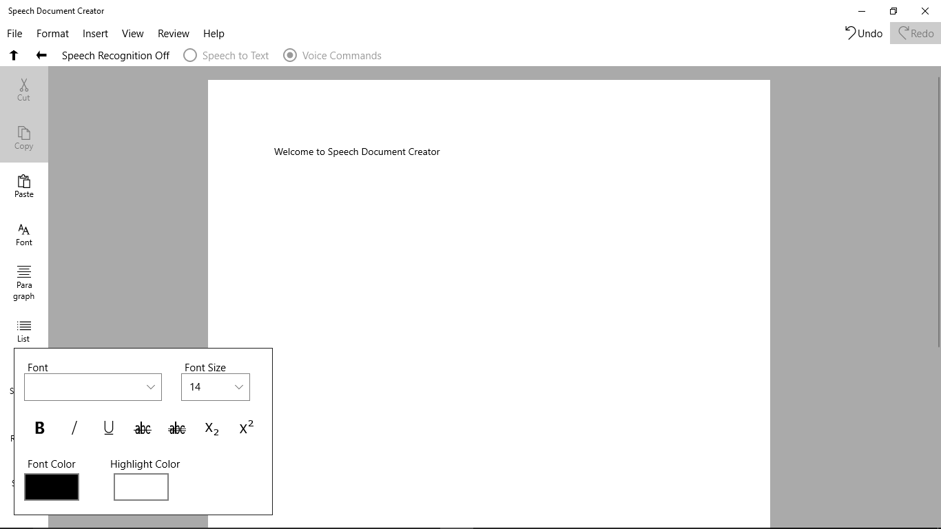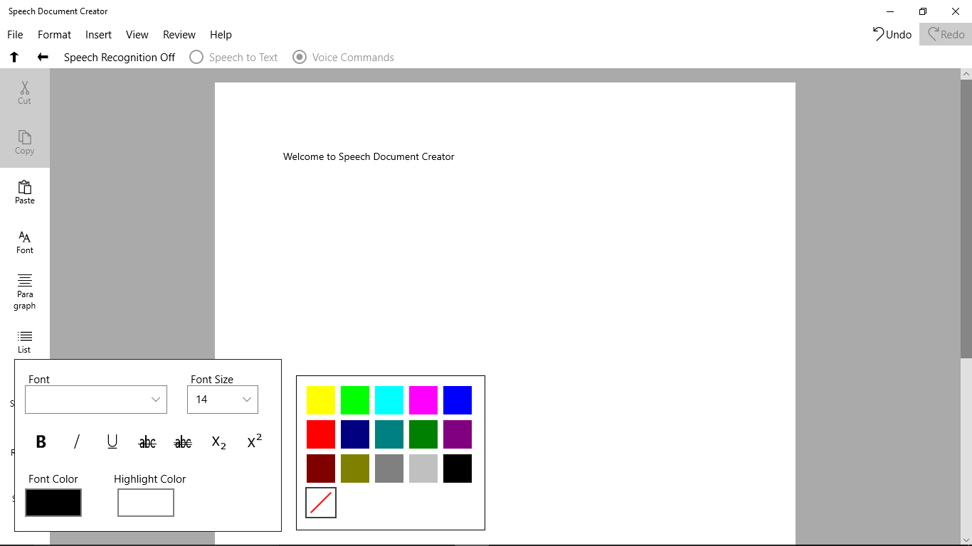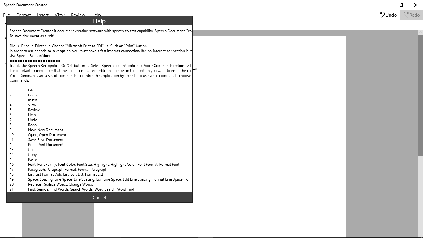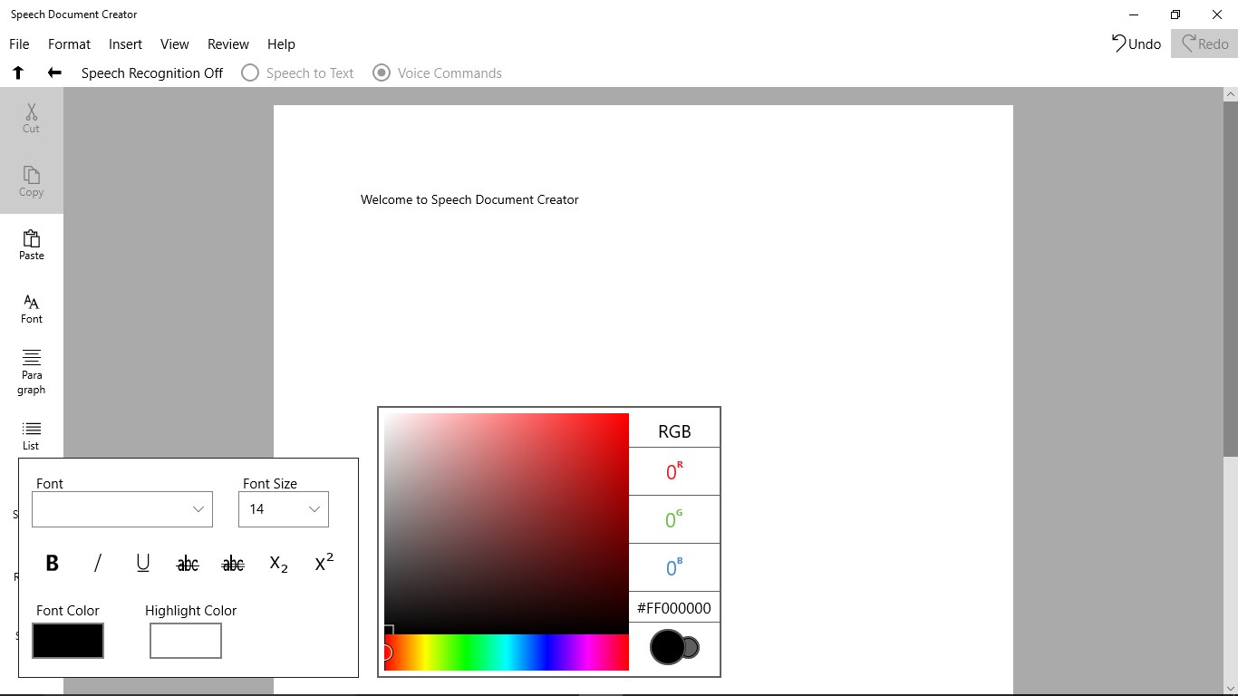 You can easily control document editing by voice commands such as cut, copy, paste, redo, undo, font family, font color, text alignment and etc.The only language that supported for voice commands is English.