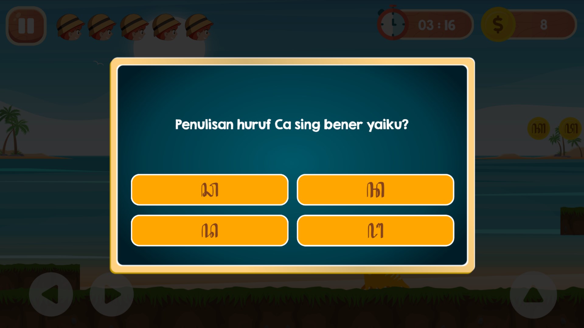 Adventure Quest Aksara Jawa adalah game edukasi yang berisi permainan petualangan yang juga berisi kuis aksara jawa dan sandhangan. Terdapat 3 level permainan dalam aplikasi ini. Selain permainan petualangan, terdapat juga materi dan juga menu untuk melatih menulis aksara jawa