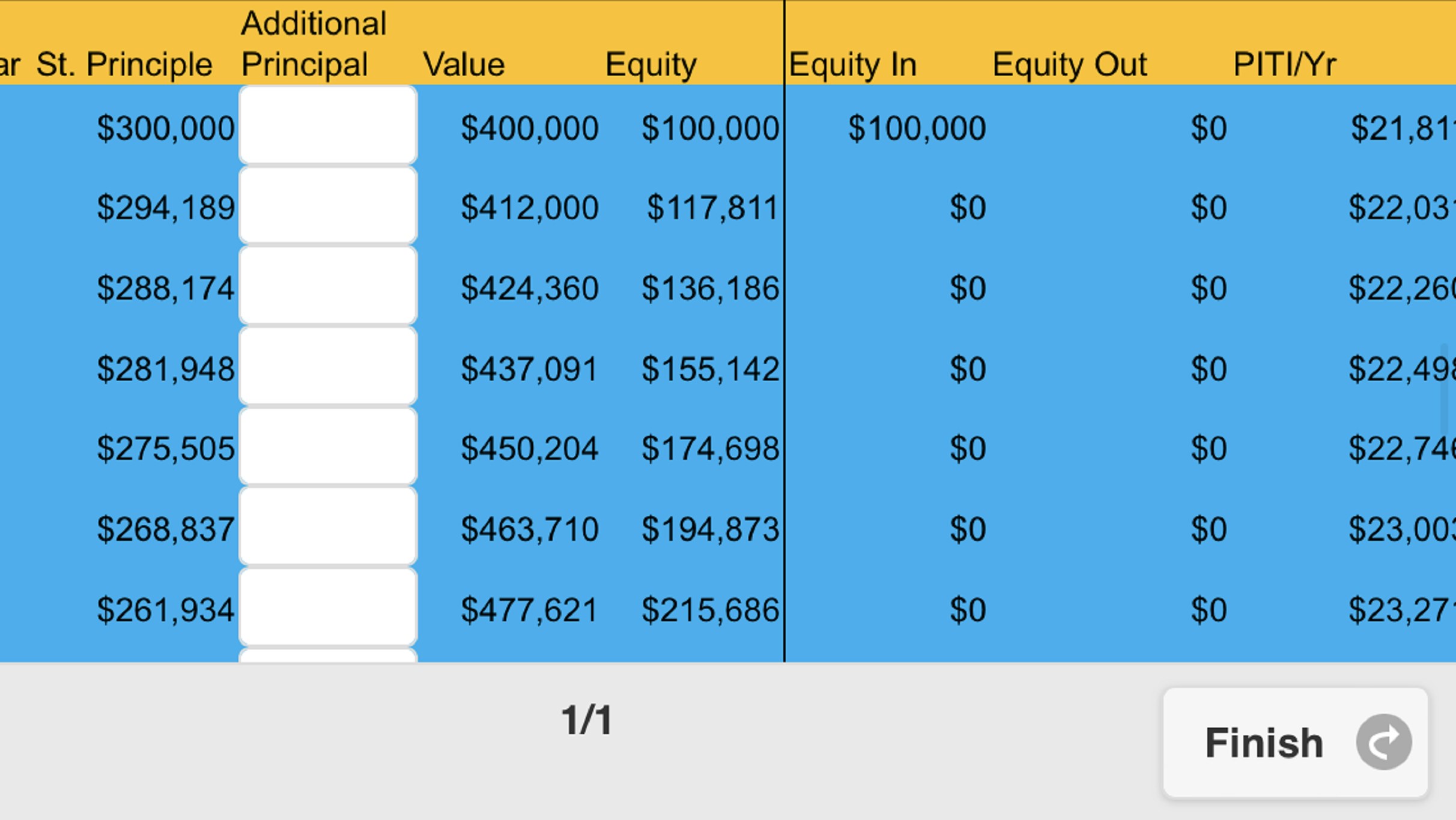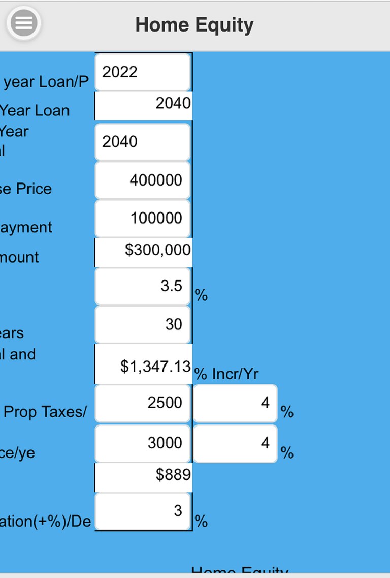 Home Equity Calculator calculates the amortization table and home equity value. The application shows you the effect of additional principal payments and calculates your reduction in loan term. Home Equity calculates your home equity if you decide to sell before the loan is fully paid off. Home Equity also tracks your property taxes and insurance until the property is sold. Nice graph of home value and loan balance. Full loan amortization table available along with home equity values.
