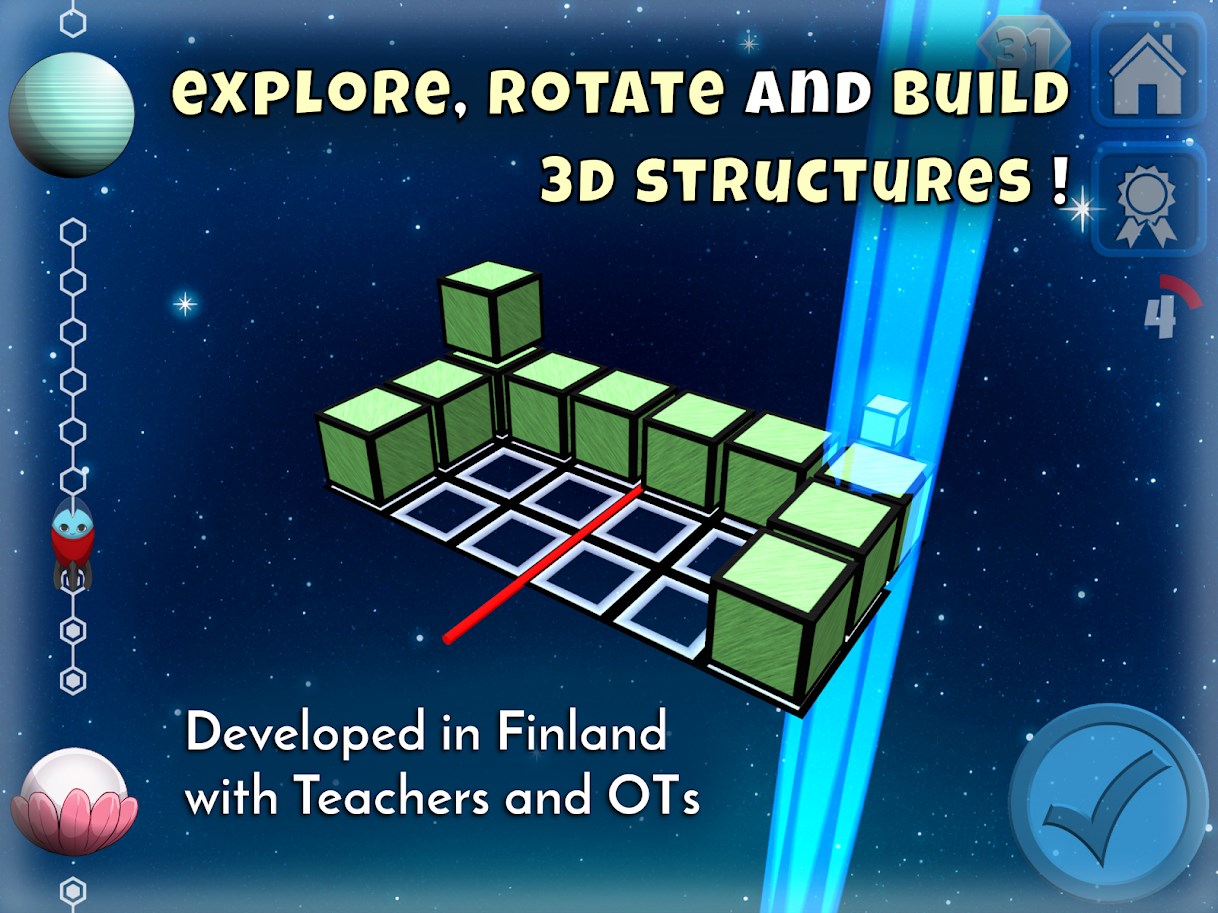 In Piko’s Blocks the learner builds 3D structures based on presented exercises. Player observes and manipulates self-made 3D objects to develop three-dimensional thinking. Piko’s Blocks has been developed in cooperation with occupational therapists and teachers.