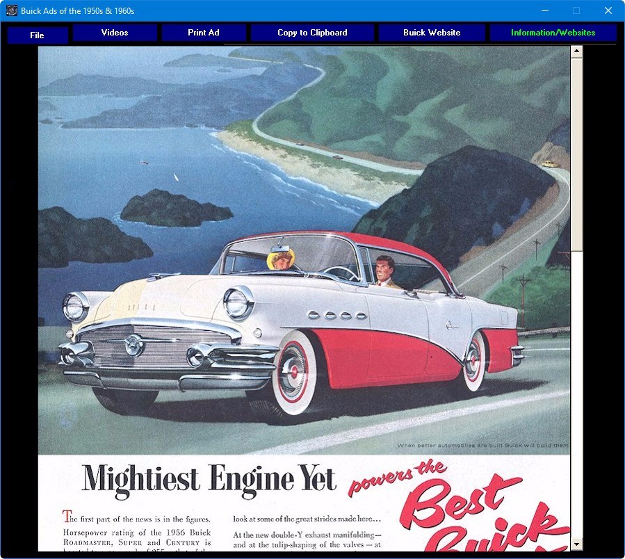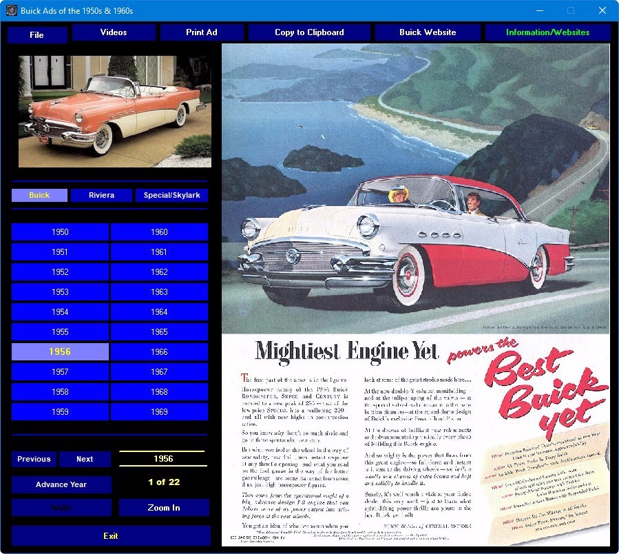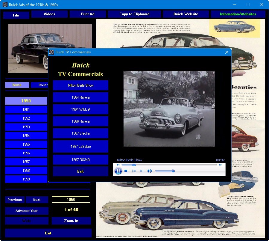 Buick Ads 1950-1969. Take a nostalgic tour through history. Experience the style and hype of the automobile advertising industry from the glory days of cars. This DVD-ROM includes well over 500 Buick magazine ads as they appeared during the period. They're all here: the full size Buicks, the sports/luxury Rivieras and the mid-sized Specials and Skylarks. PLUS 7 TV commercials. This is the largest collection of the Buick ads available in a single resource.