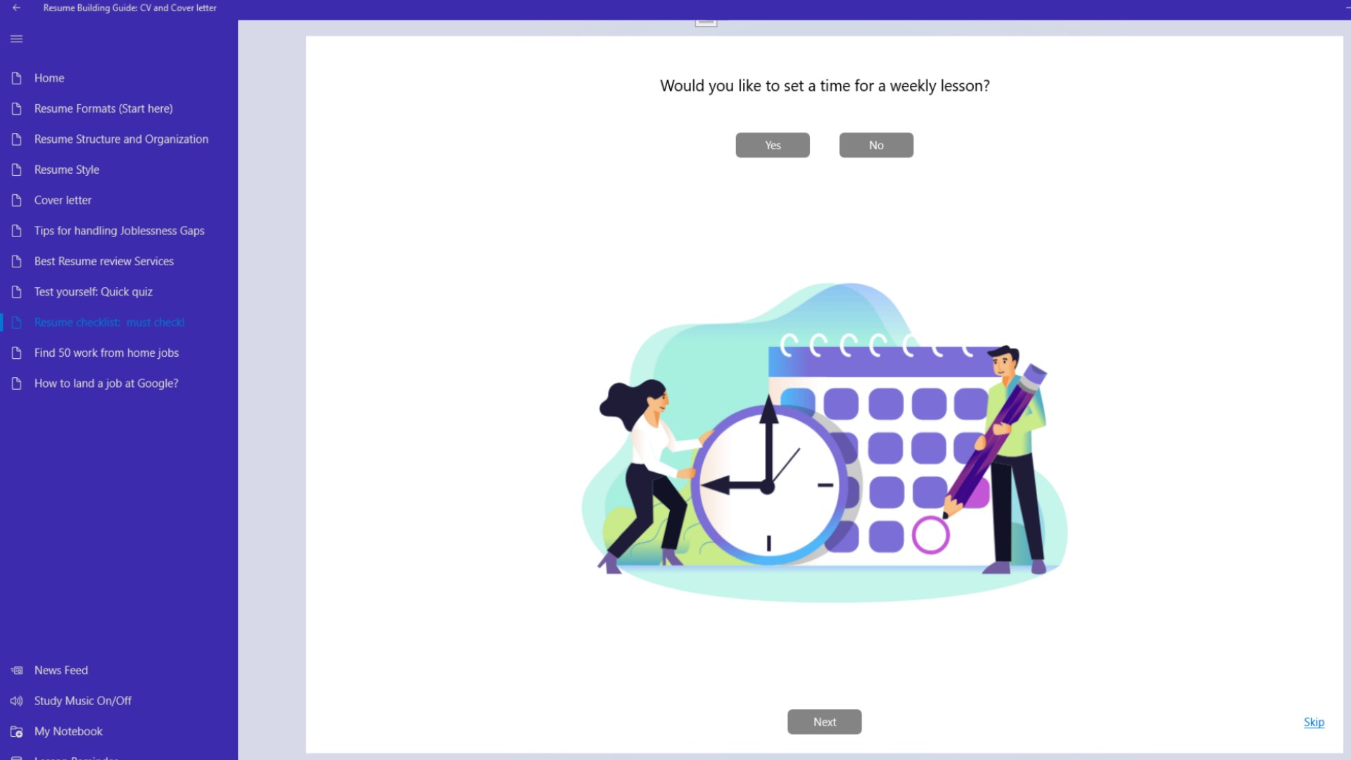 Building a great resume takes time and effort, and with our scheduling feature, you can set reminders to work on different sections of your resume at your own pace. This will help you stay consistent, ensuring you don’t rush the process and that each section of your resume gets the attention it deserves.