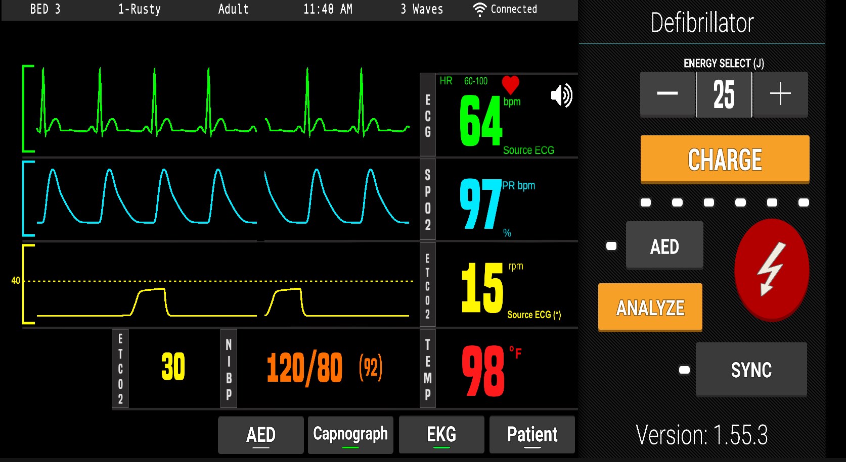The PerSim® Monitor is a realistic vitals monitor defibrillator for PerSim®. Features include a variety of heart wave forms, including afib, vfib, asystole, atrial flutter, Mobitz 1 an 2, and many more. PerSim® Monitor also has common defibrillation functions such as AED, manual defibrillation, and sync.