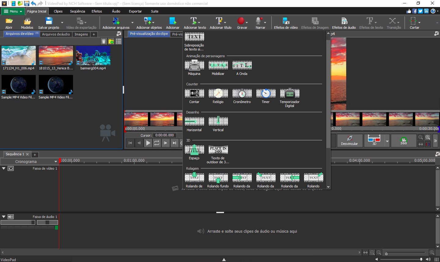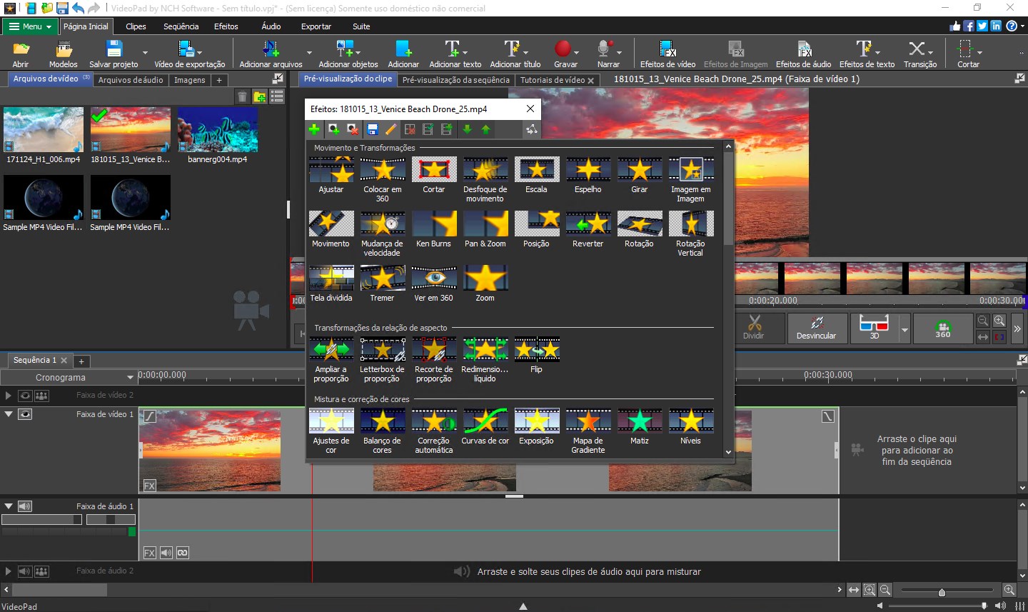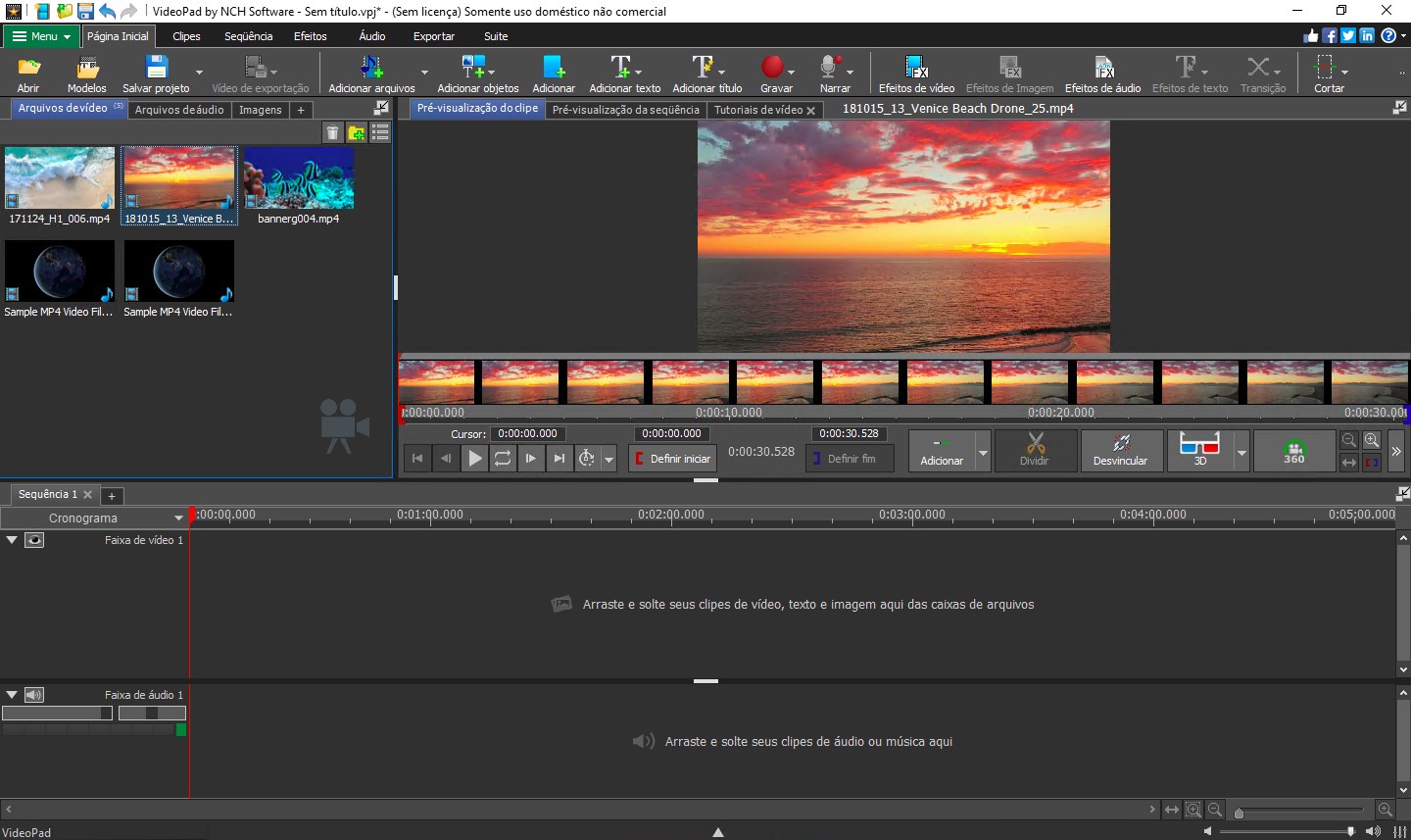 O software de edição de vídeo VideoPad é uma maneira rápida e divertida de editar seus vídeos. Adicione seus arquivos de vídeo, áudio e imagem arrastando-os e soltando-os no software ou grave seu áudio e vídeo do zero. Com uma ampla variedade de ferramentas de edição, como fades, transições e muito mais, fazer seu filme não poderia ser mais fácil. Quando terminar seu projeto, compartilhe-o facilmente em suas contas de mídia social ou grave uma cópia em DVD.