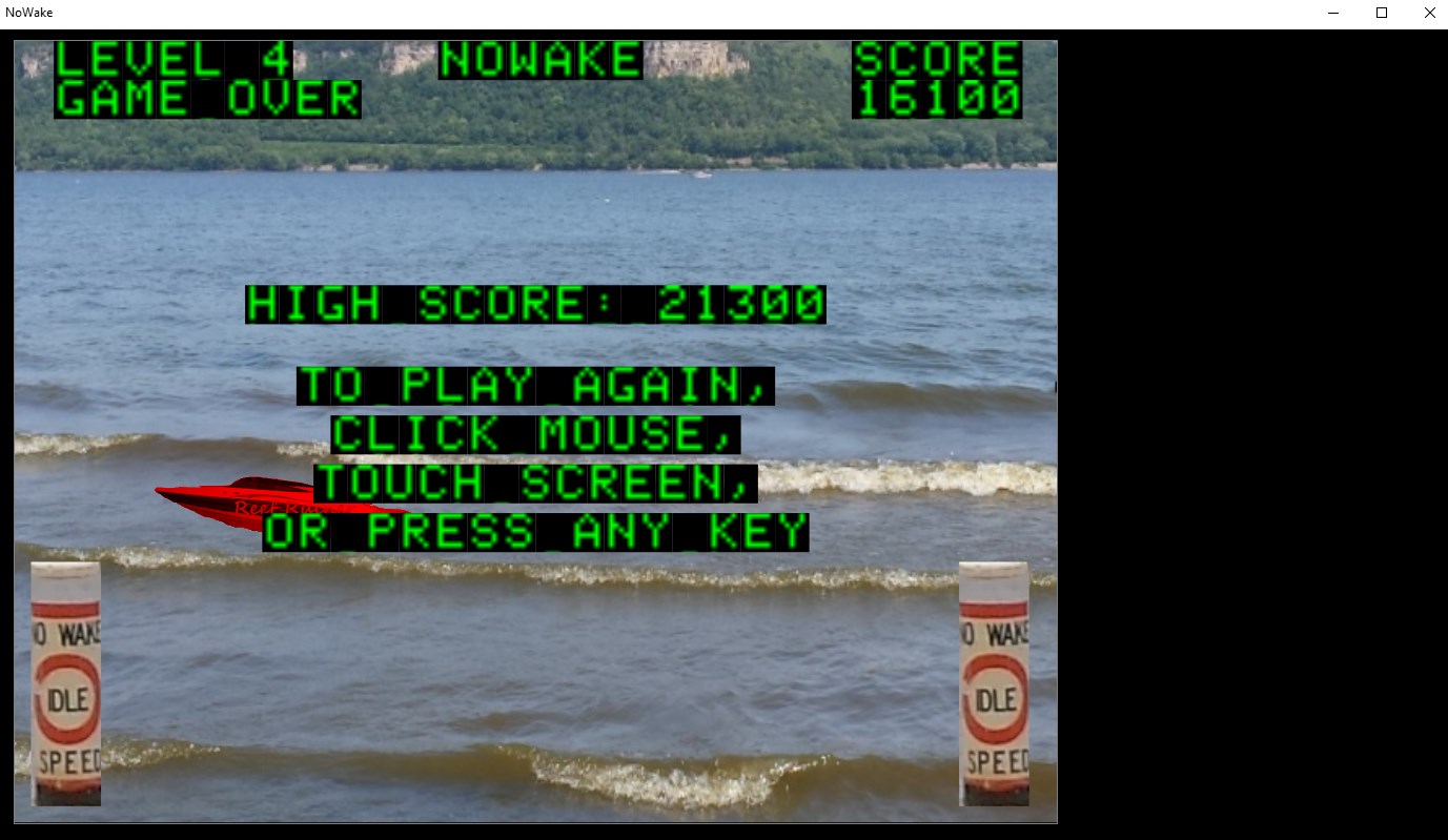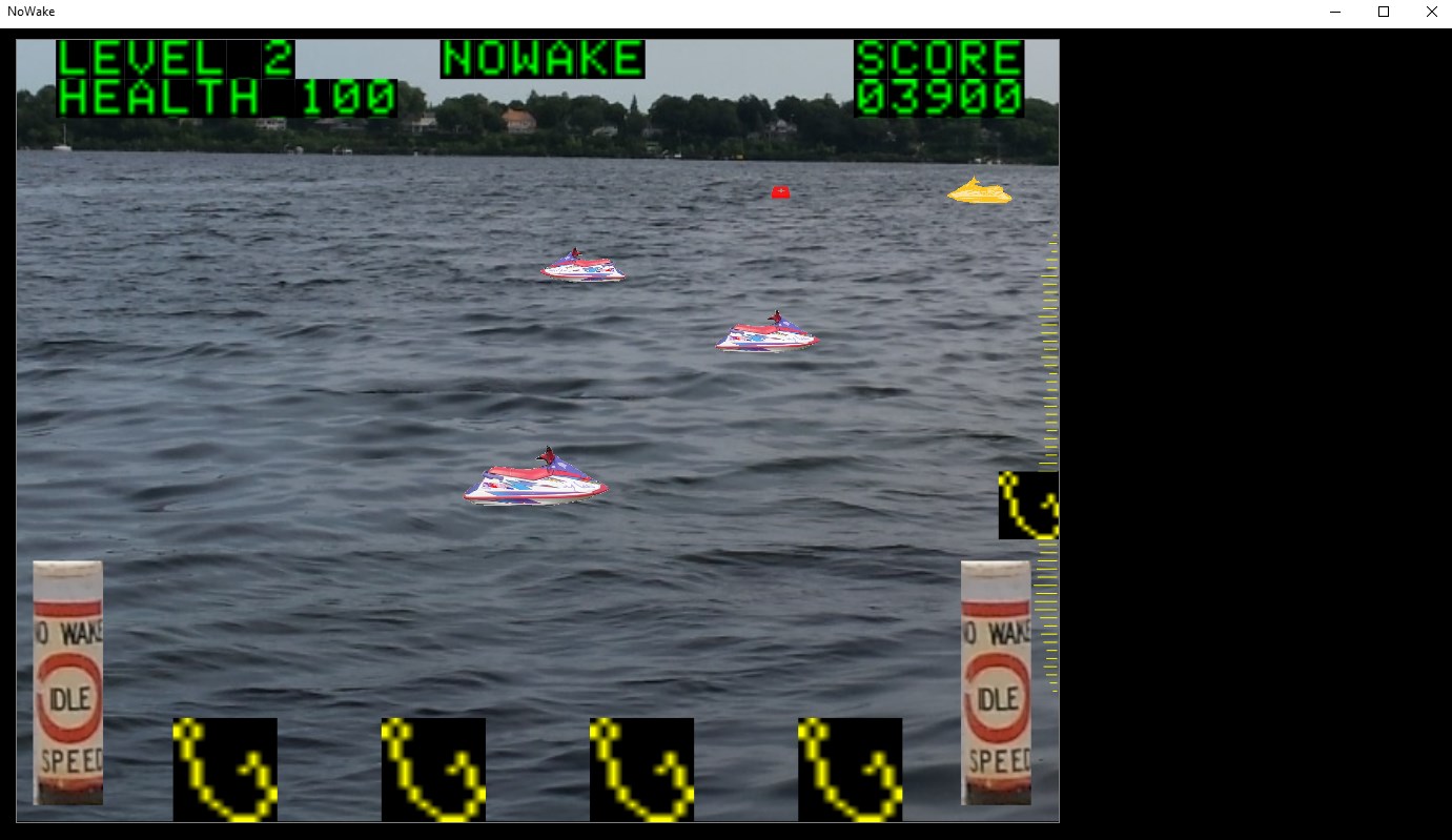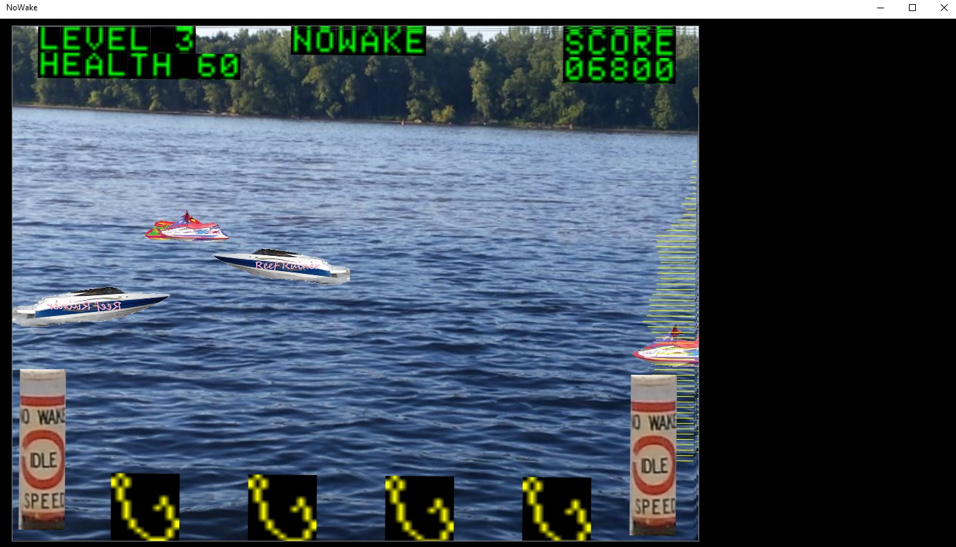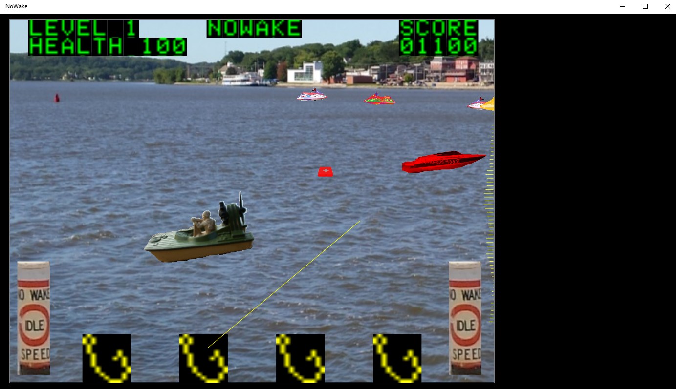 Defend the no-wake zone from speedy watercraftGet points for disabling enemy watercraftActivate ally boat for help; get a second ally boat when you pass 10000 pointsSaves high scoreRetro