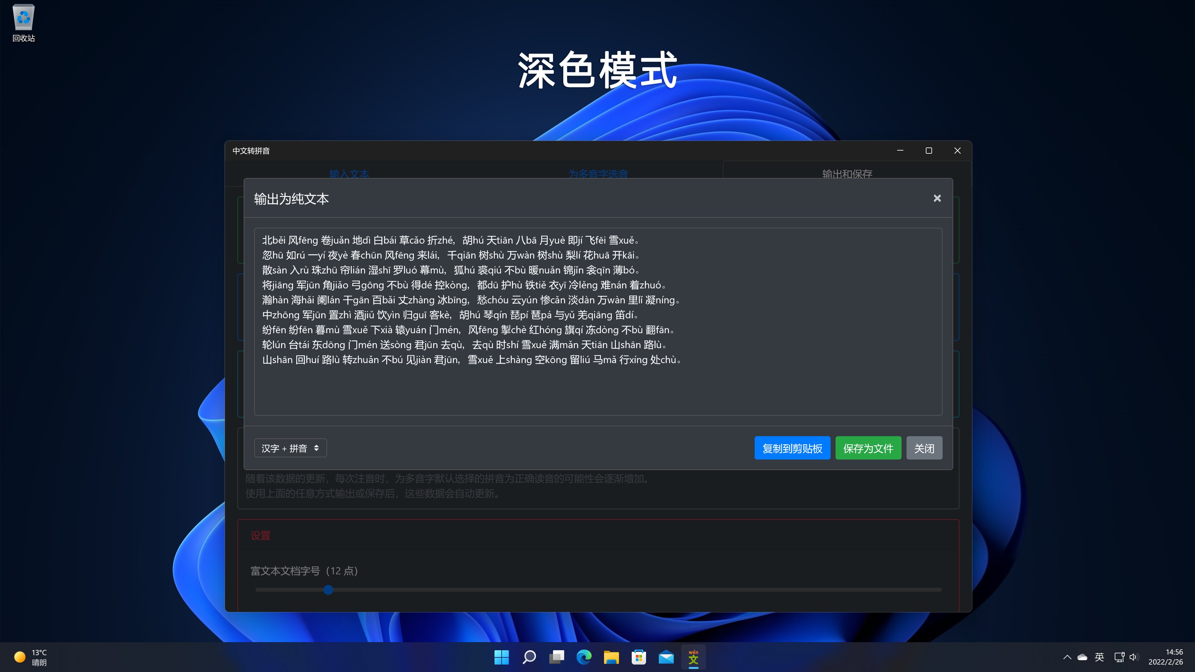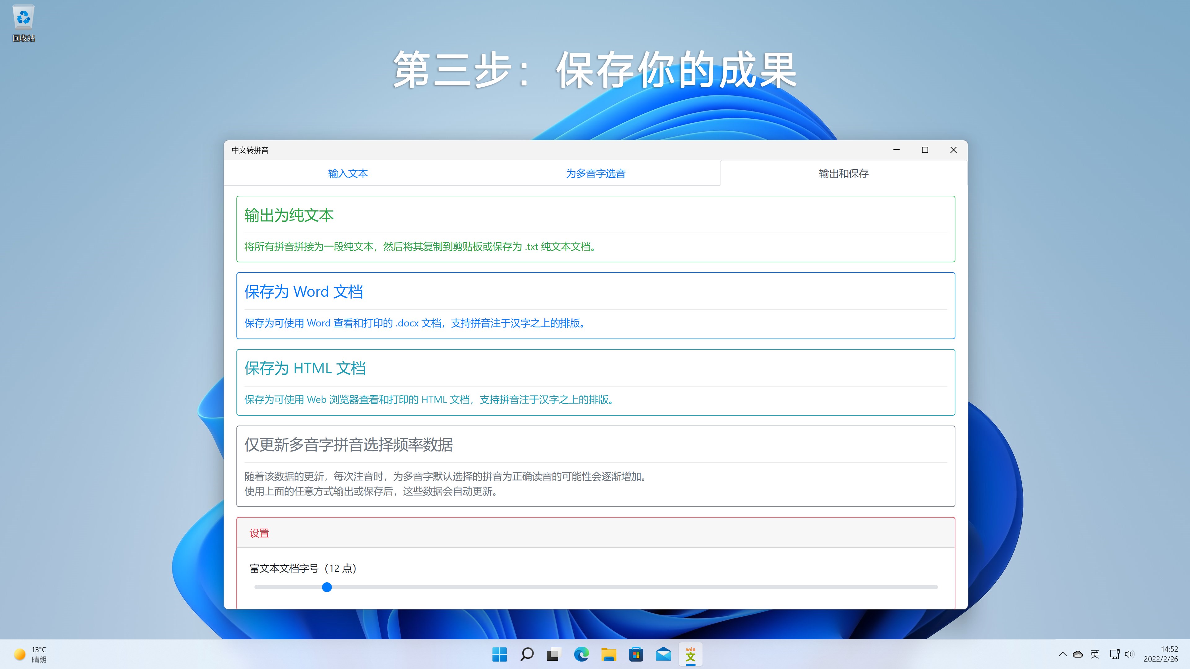 在此应用中输入一段中文文本,它可以自动为每个汉字标注拼音。对于多音字、变调、轻声等多音情况(以下统称多音字),它会展示一个拼音列表,供你选择正确的拼音。全部拼音确定以后,可以将所有汉字和拼音拼接为纯文本,然后复制到剪贴板或保存为纯文本文档(.txt);还可以将它们保存为 HTML 文档(.html) 或 Microsoft Word 文档(.docx),这两种文档支持拼音注于汉字之上的排版,可使用 Web 浏览器或 Microsoft Word 查看和打印。