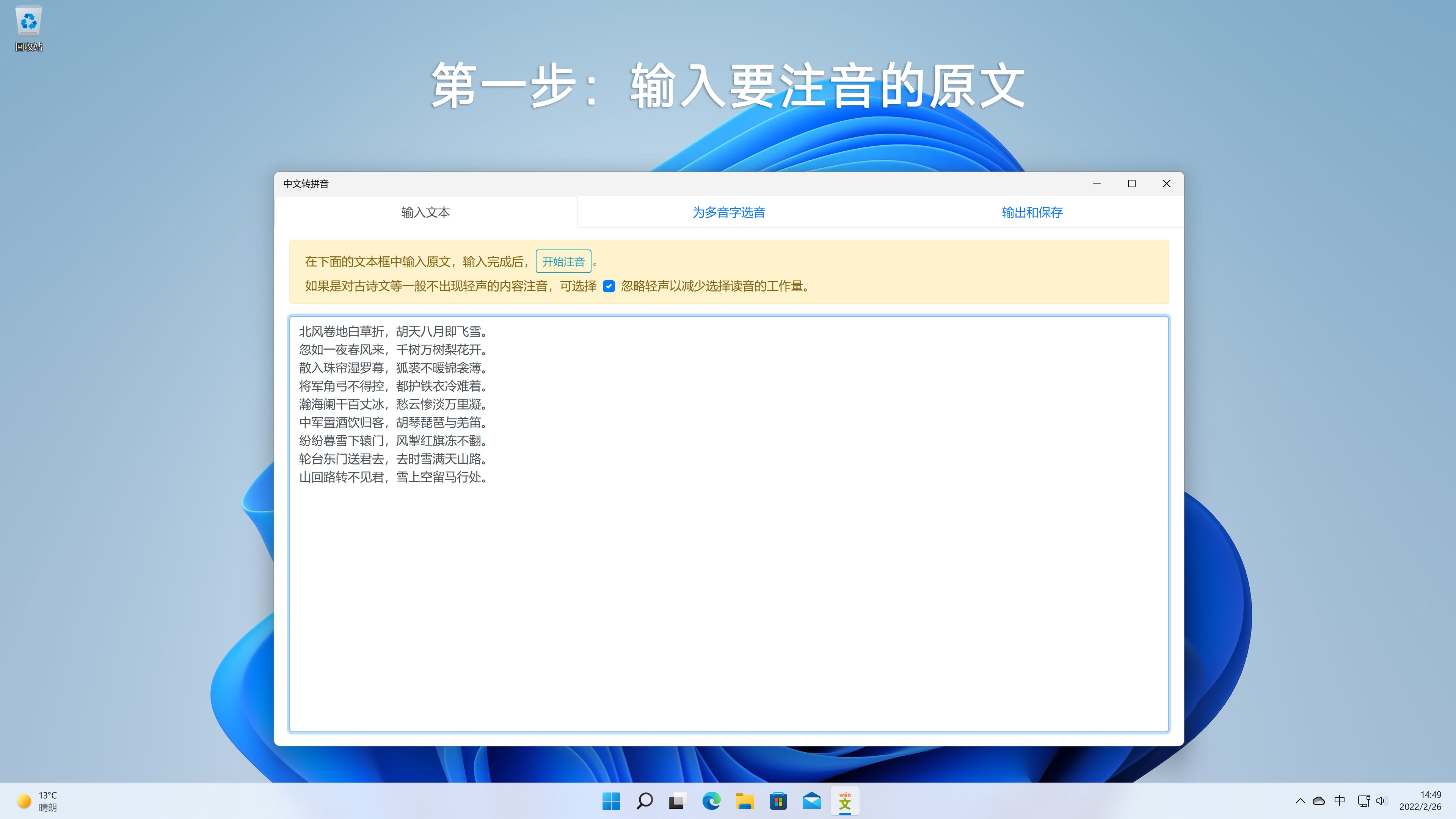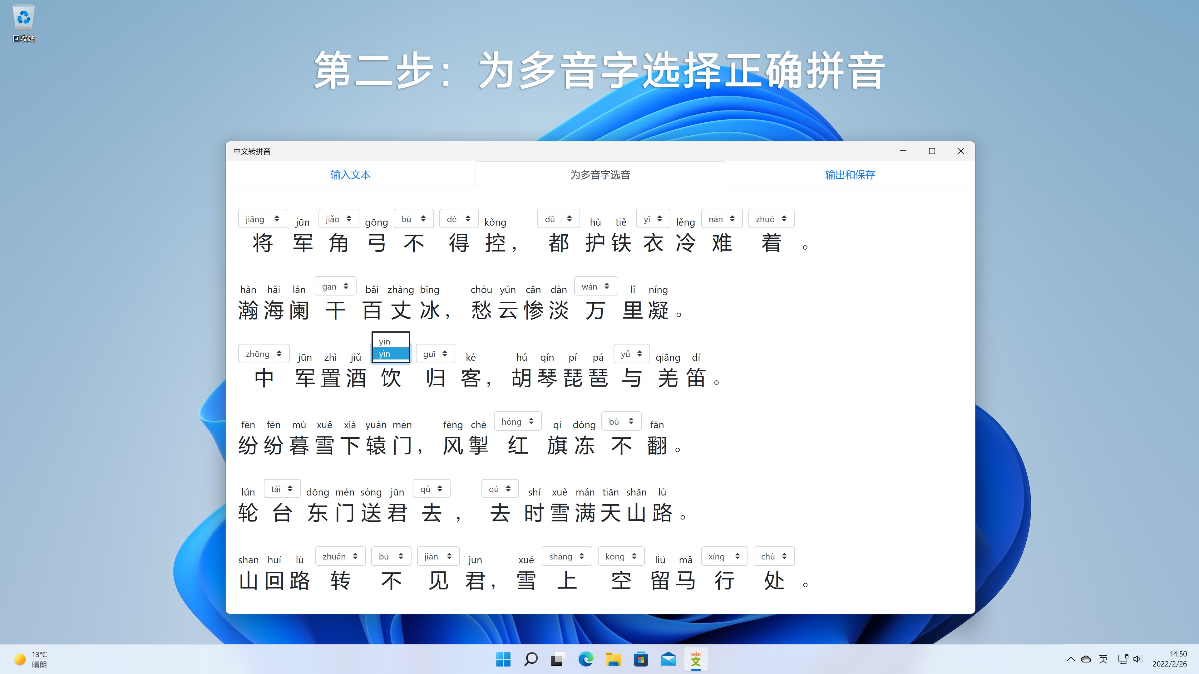 每次使用任意方式输出或保存时,你对多音字选择的拼音会自动记录下来;每次注音时,为多音字默认选择的拼音是之前选择频率最高的拼音。因此,你使用的次数越多,默认拼音是正确读音的可能性就会越大,需要你主动更正的多音字也就越少。此外,如果你要对古诗文等一般不出现轻声的内容注音,还可以选择忽略轻声,这会极大地减少选择读音的工作量。