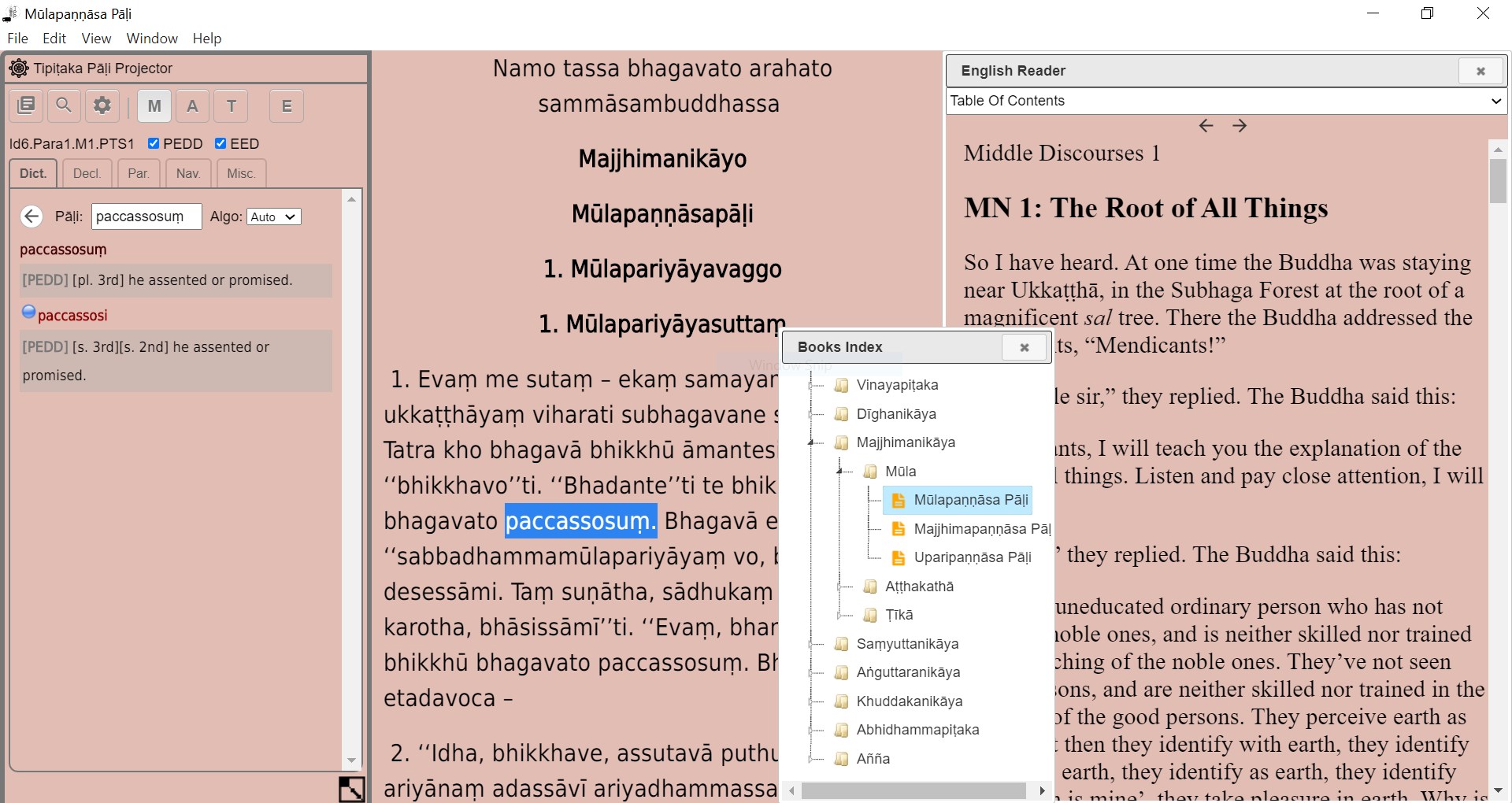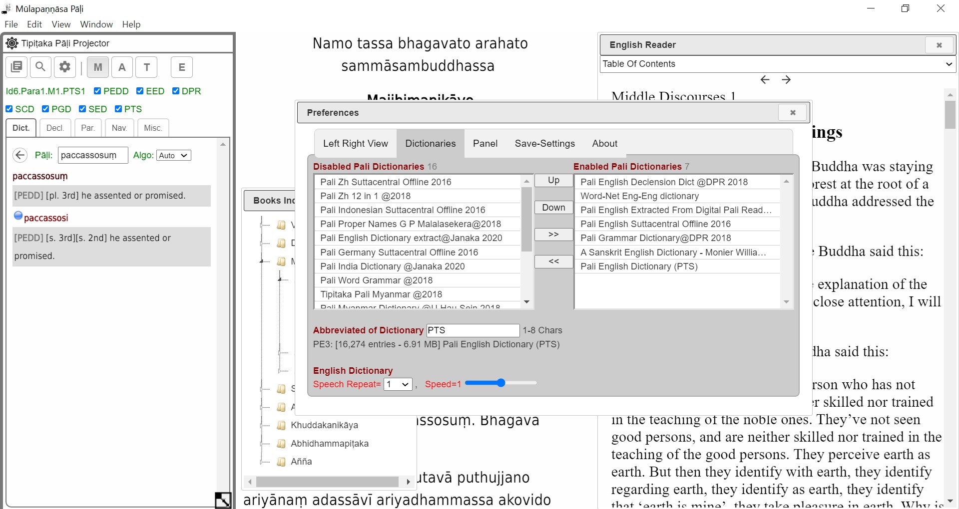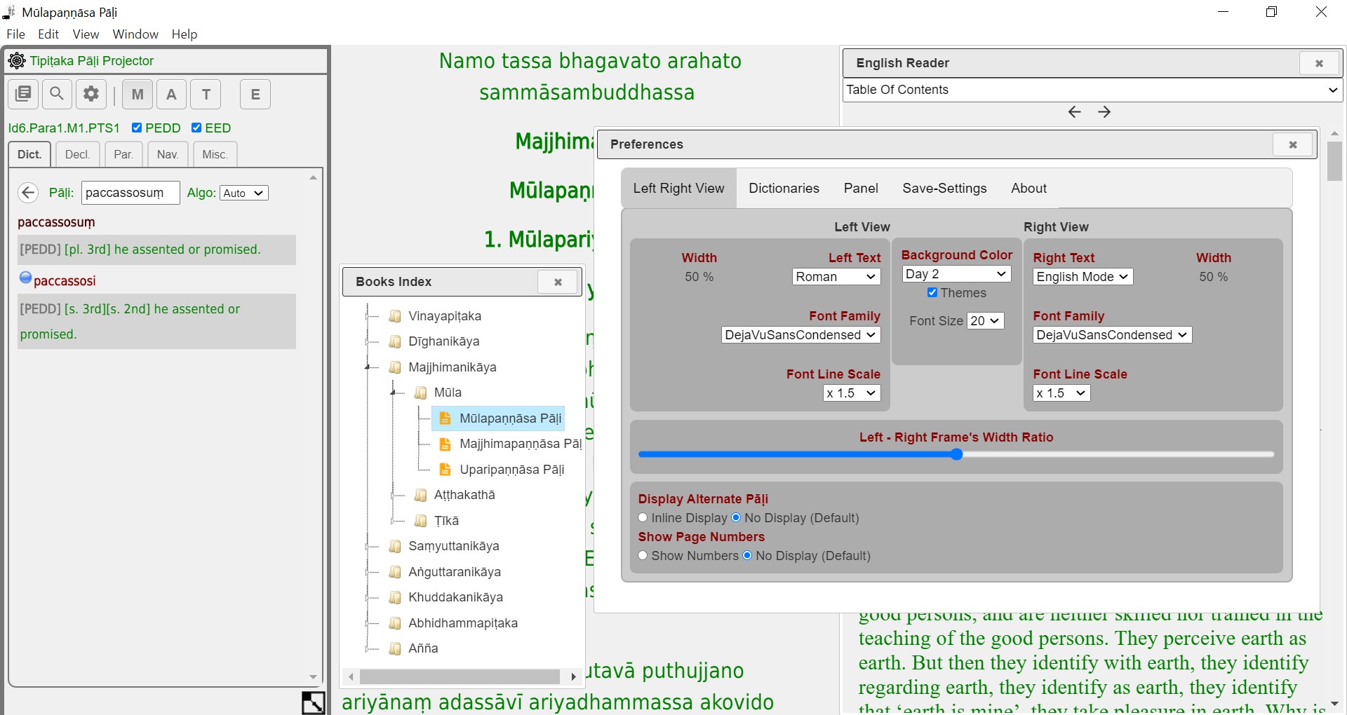 TPP is a software program to help one navigate the vast amounts of Pāḷi texts. It includes, 21 English Ebooks that can be displayed side by side with the Pāḷi texts. The Dictionaries and Search functions are where TPP separates itself from the other Pāḷi readers. It is very fast and totally off-line. It works on Windows as an installable Exe or MacOS DMG file too. The project can also run on any operating system that supports FireFox Web Browser. This application was created at Pa-Auk Forest Monastery in Maymyo. The FireFox version supports Sinhala, Myanmar, Thai and Devanagiri Scripts.