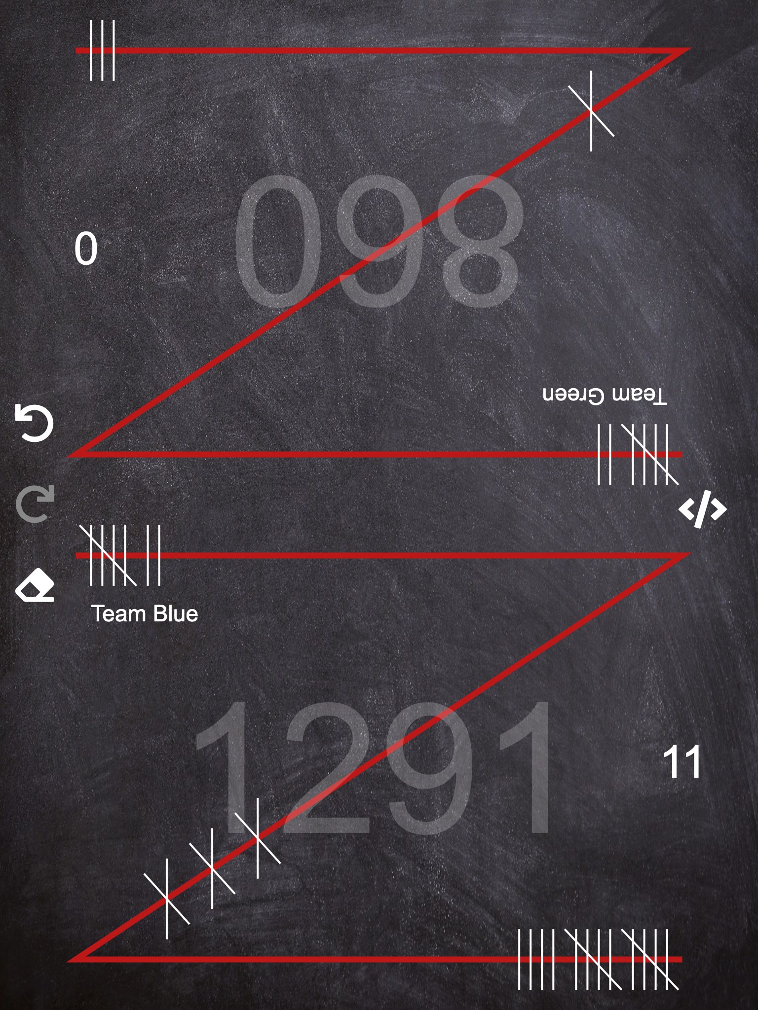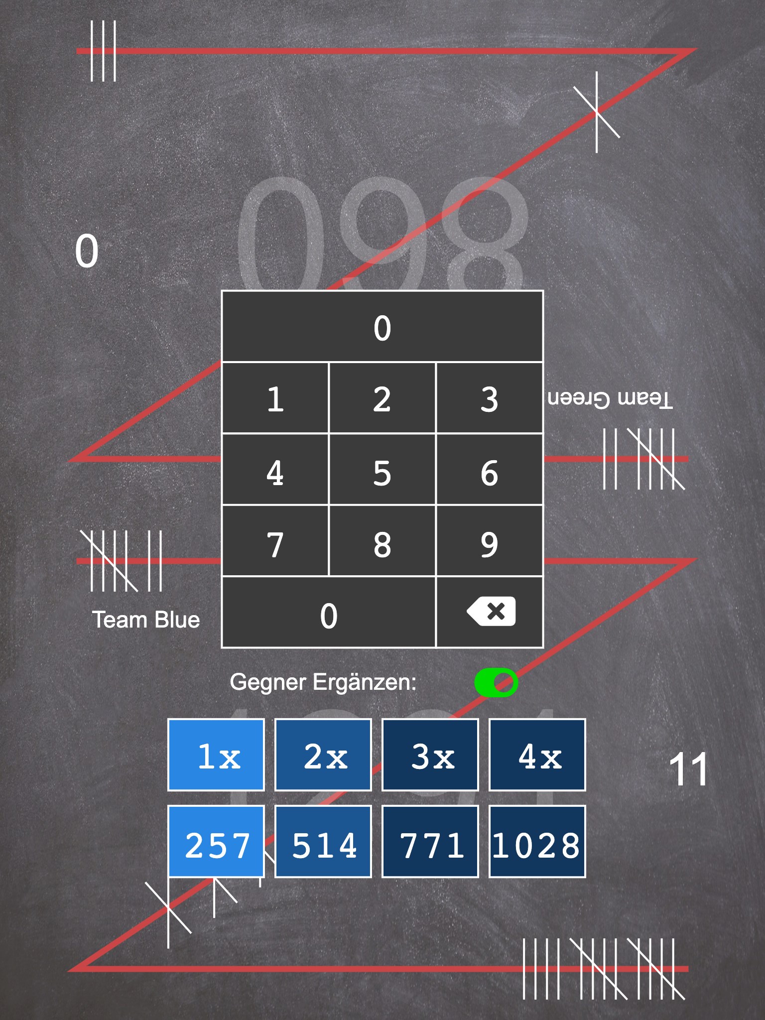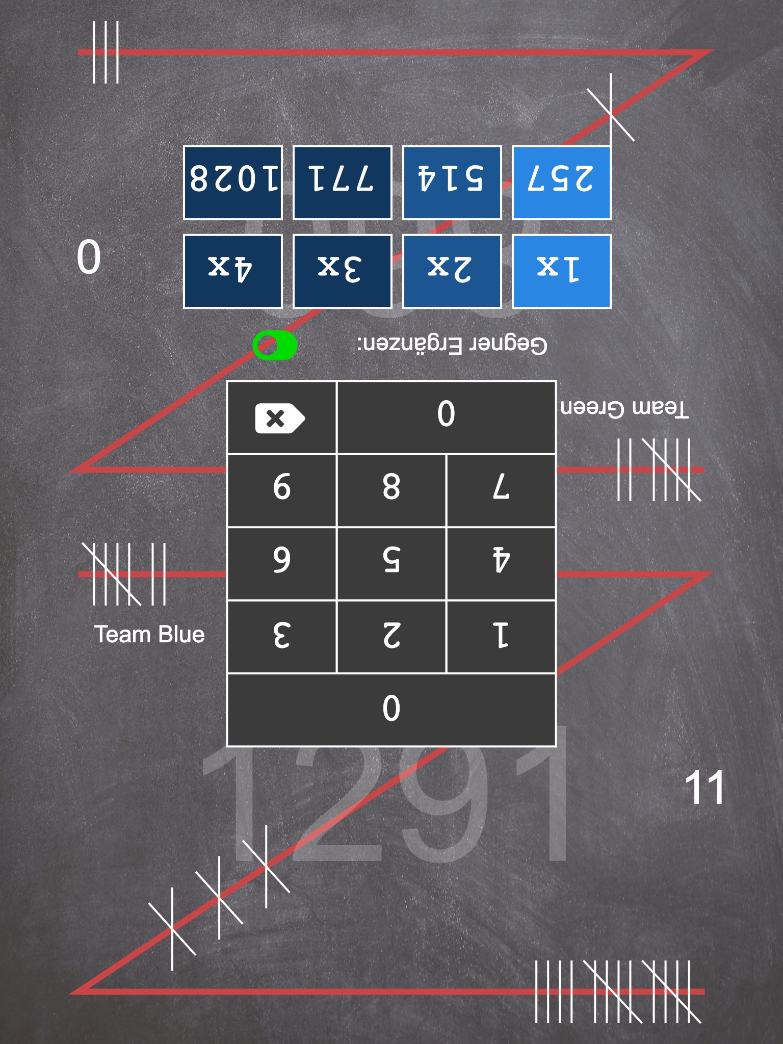 Eingabe von StrichenEingabe von Punkten 1-fach, 2-fach, 3-fach oder 4-fach mit automatischem Ergänzen auf 157 der Punkte des Gegners.Jeder Spieler gibt seine Punkte auf seiner Seite ein. Niemand muss auf dem Kopf schreiben und kein Drehen des Geräts ist notwendig.Der Spielstand wird über den Neustart der App gespeichert.Auf der Rückseite kann frei gezeichnet werden.