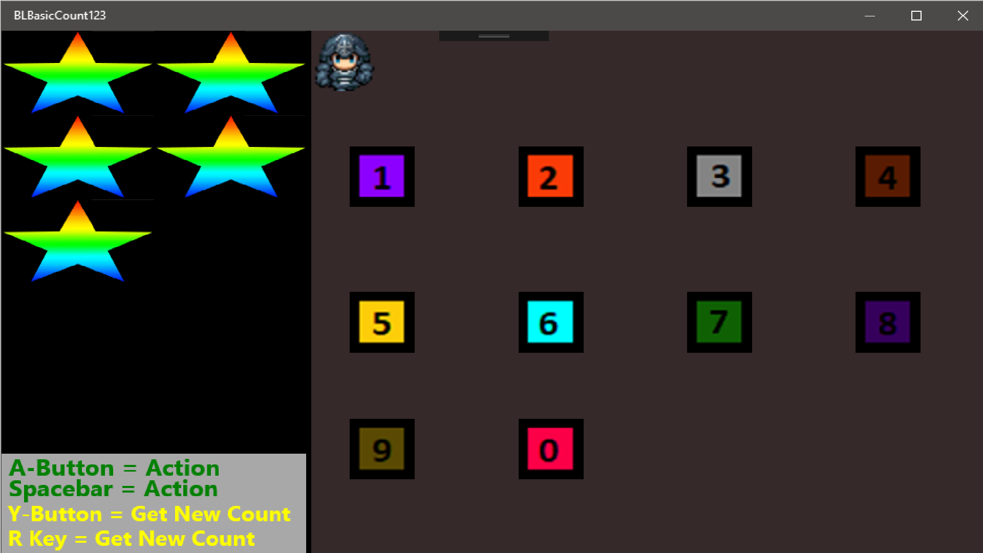 Counting the stars from 0-9. Use keyboard or controller to move character and pick the correct number that match the amount of star you see.