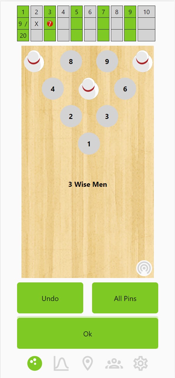 In the screen you can see the specific pin fall per round. Pin fall from first shot is listed black, pin fall from second shot is listed in white and pins missed are listed as a white ring. Splits are marked in red.