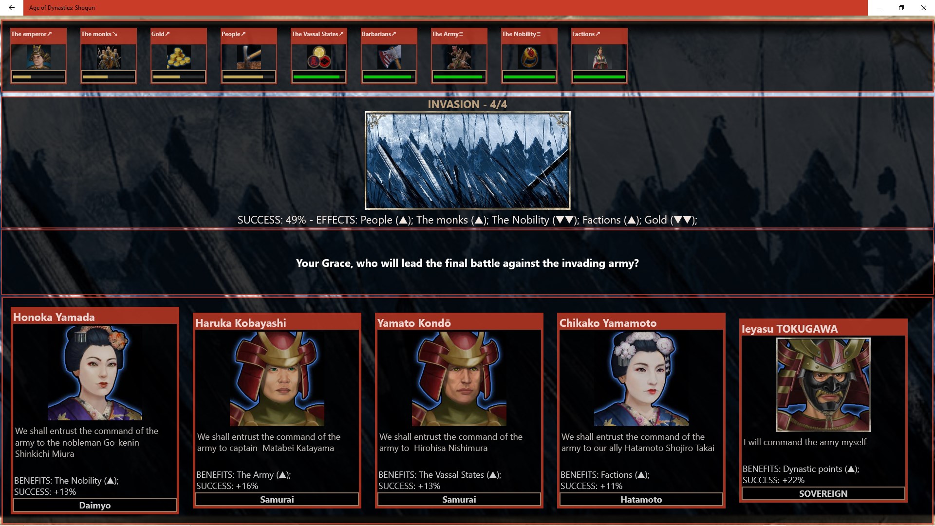 Japan 1192. Numerous clans are at war to gain supremacy. Thanks to the growing power of your dynasty at the helm of your clan, you managed to gain the emperor 's admiration and be named Shogun. The enemy Daimyo prepare to challenge your samurai in battle with their armies. War looms.