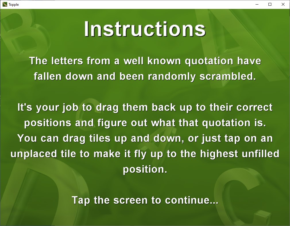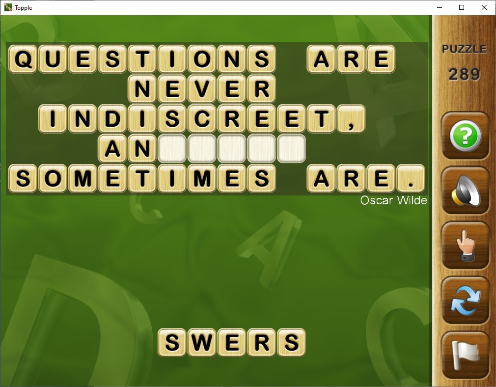 The letters of a well known quotation have fallen down and been randomly scrambled. Your task is to drag them back up to their correct positions and figure out what that quotation is. You can drag tiles up and down, or just tap on an unplaced tile to make it fly up to the highest unfilled position.