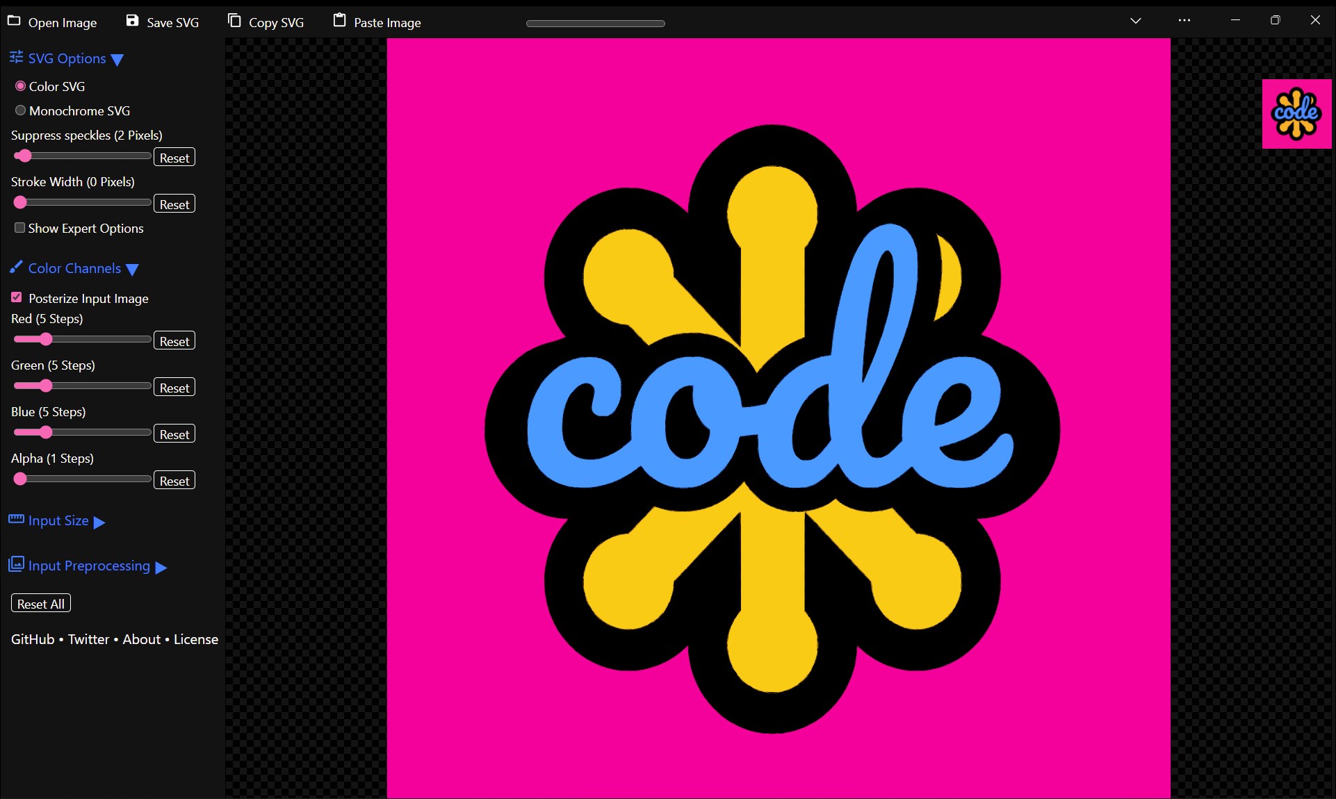 SVGcode is a Progressive Web App that lets you convert raster images like JPG, PNG, GIF, WebP, AVIF, etc. to vector graphics in SVG format. It uses the File System Access API, the Async Clipboard API, the File Handling API, and Window Controls Overlay customization.