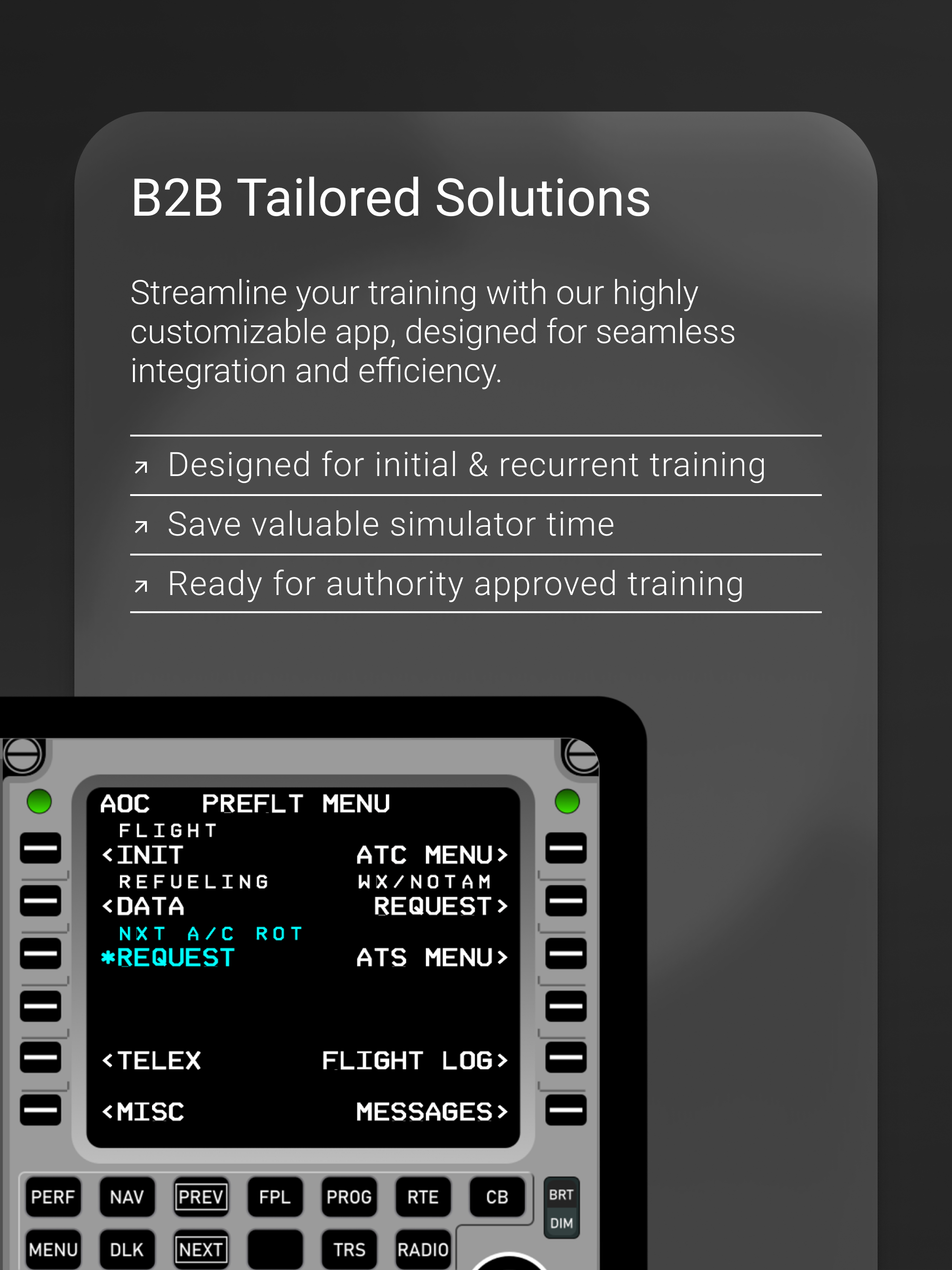 Guided Tour - A tutorial leads pilots through a whole FMS setup based on company´s individual Operational Flight PlanStatic Analyzer - Pilots choose a mission according to the syllabus and receive detailed feedbackError Check - Click on any error message in the scratchpad and receive a detailed explanationFailure simulationCPDLCFlight Phases - Explore the FMS in all phases of flight