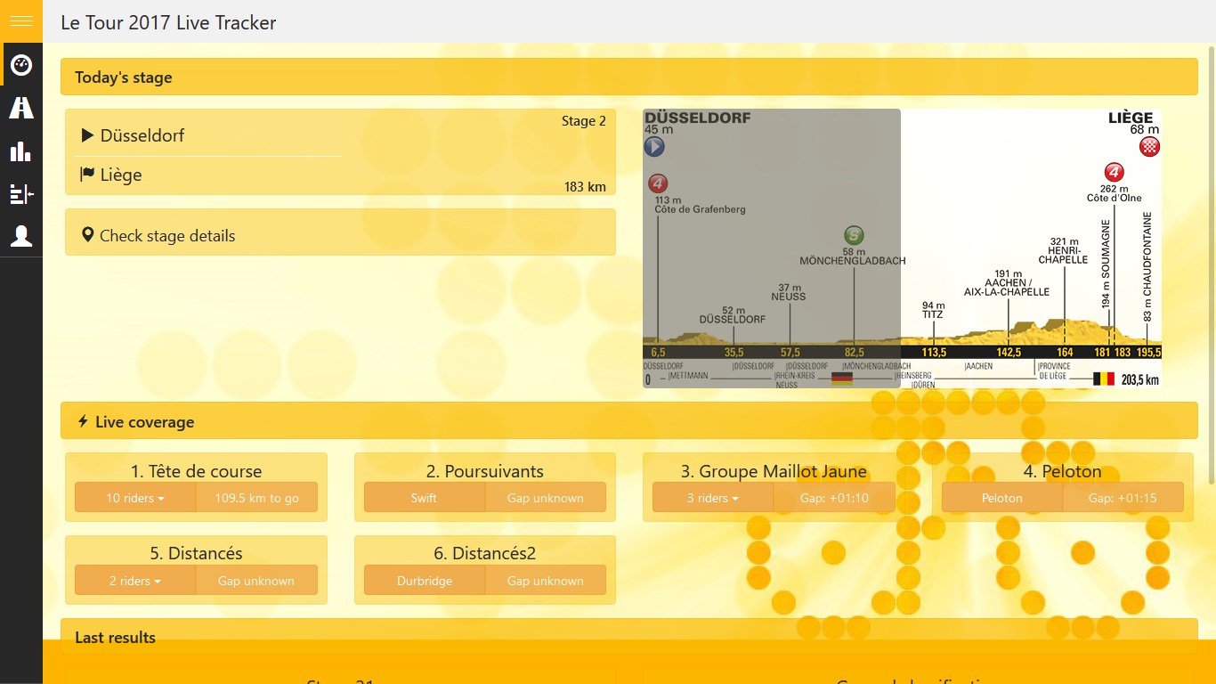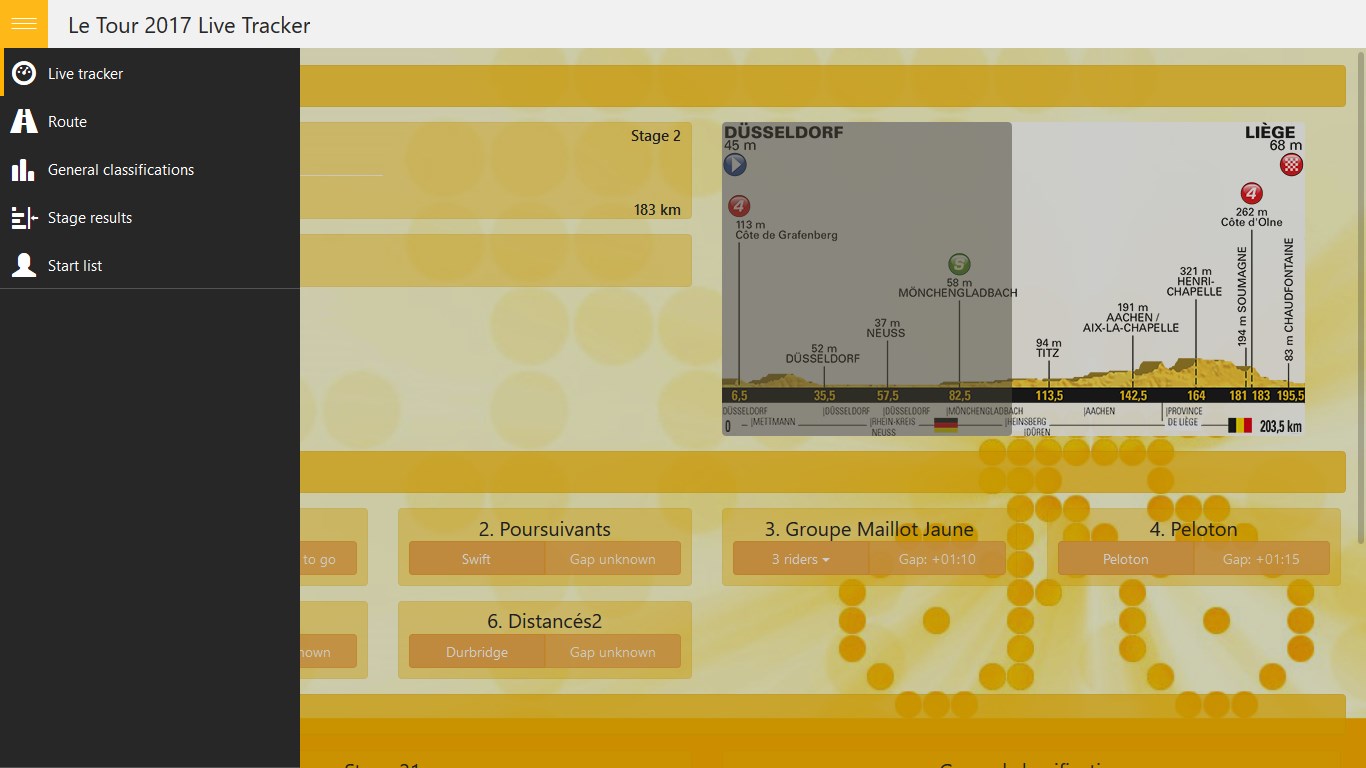 Le Tour 2017 Live Tracker is a Tour de France application for Windows Phone, Windows PC and Xbox One. Provides you with live coverage, results, classifications, profiles, maps and schedule of the entire Tour de France 2017.