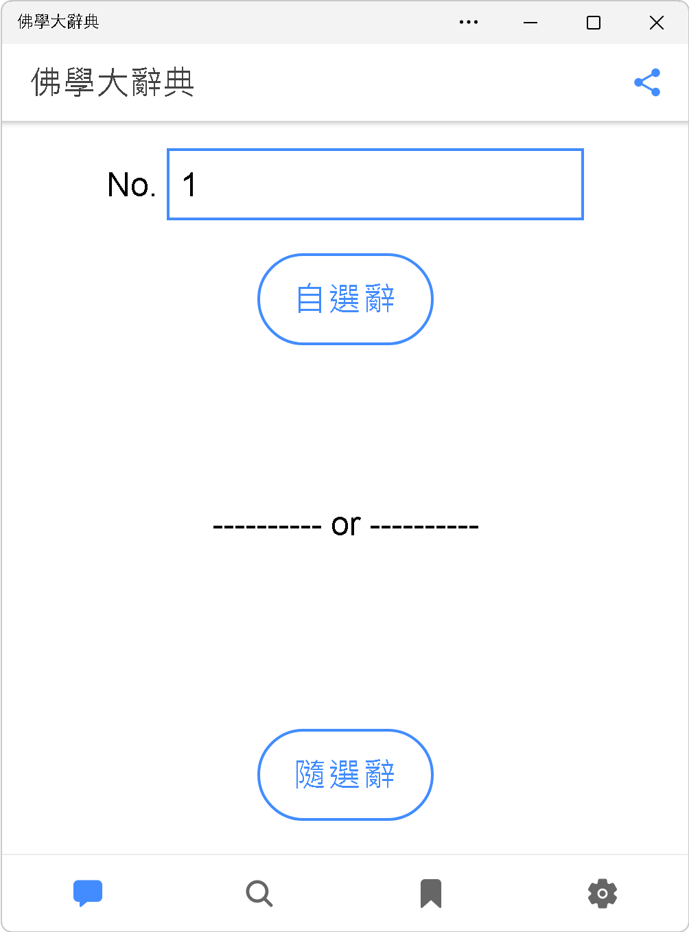 此 app 特色:隨機或自定顯示一則佛學辭定義、書籤功能、網址分享、離線瀏覽(初次啟動須連網)、佈景主題切換、字型調整、跨平台、無廣告、開放原始碼。