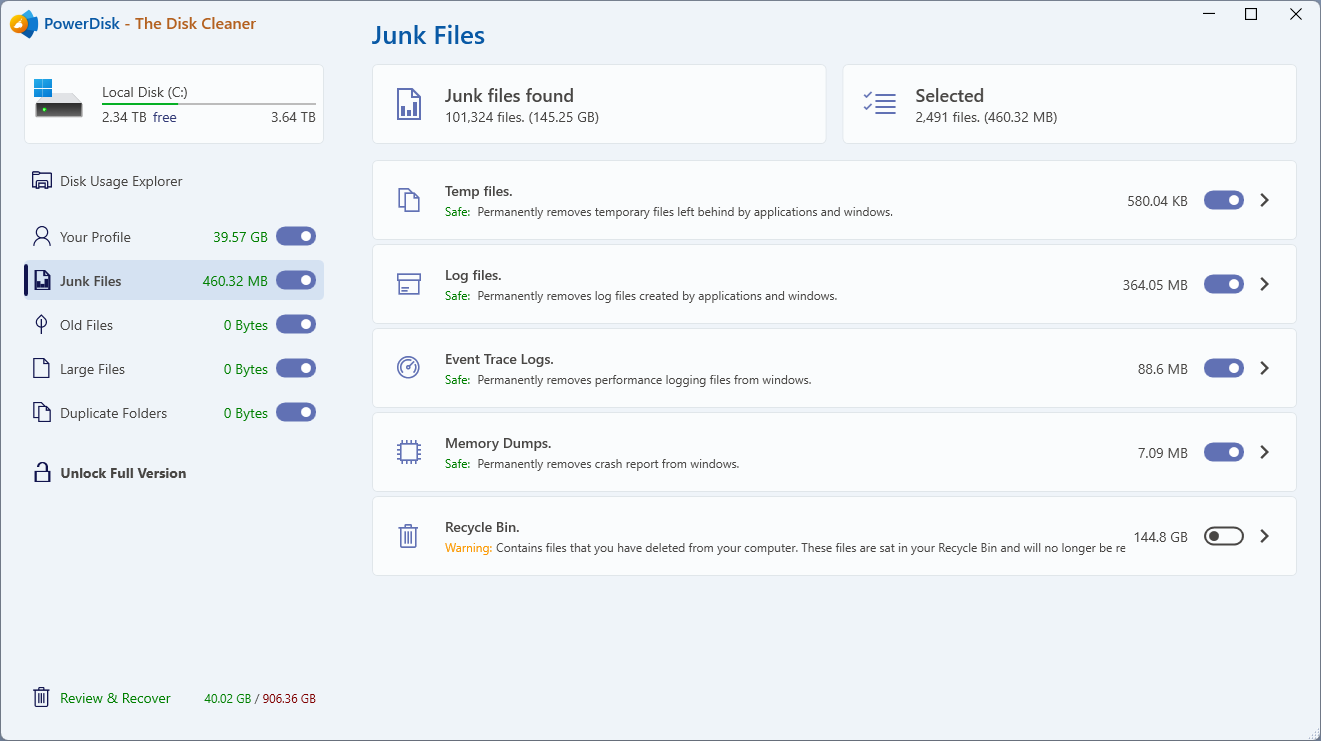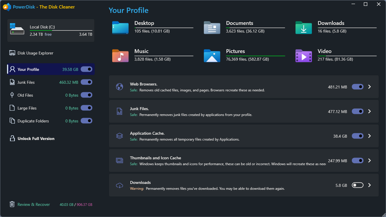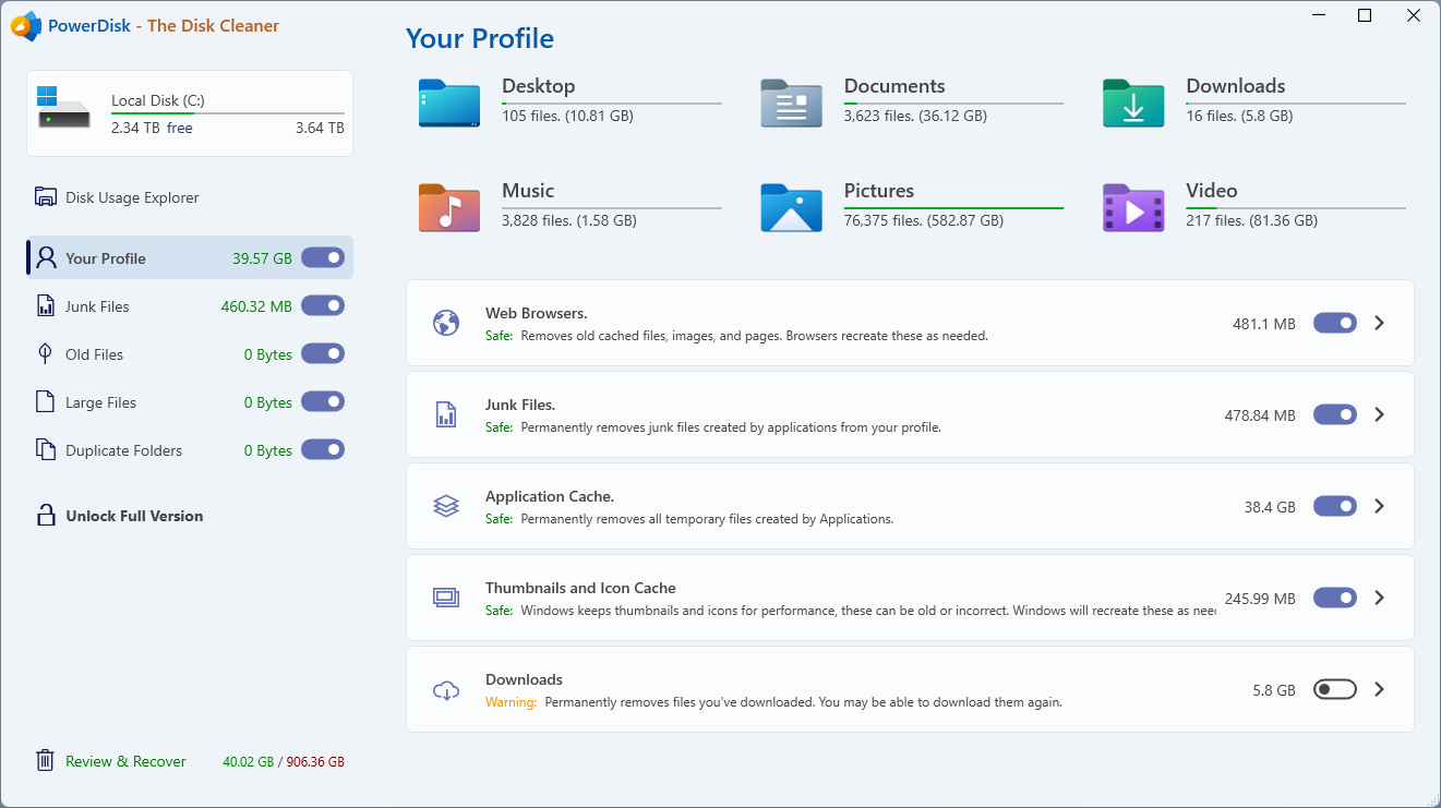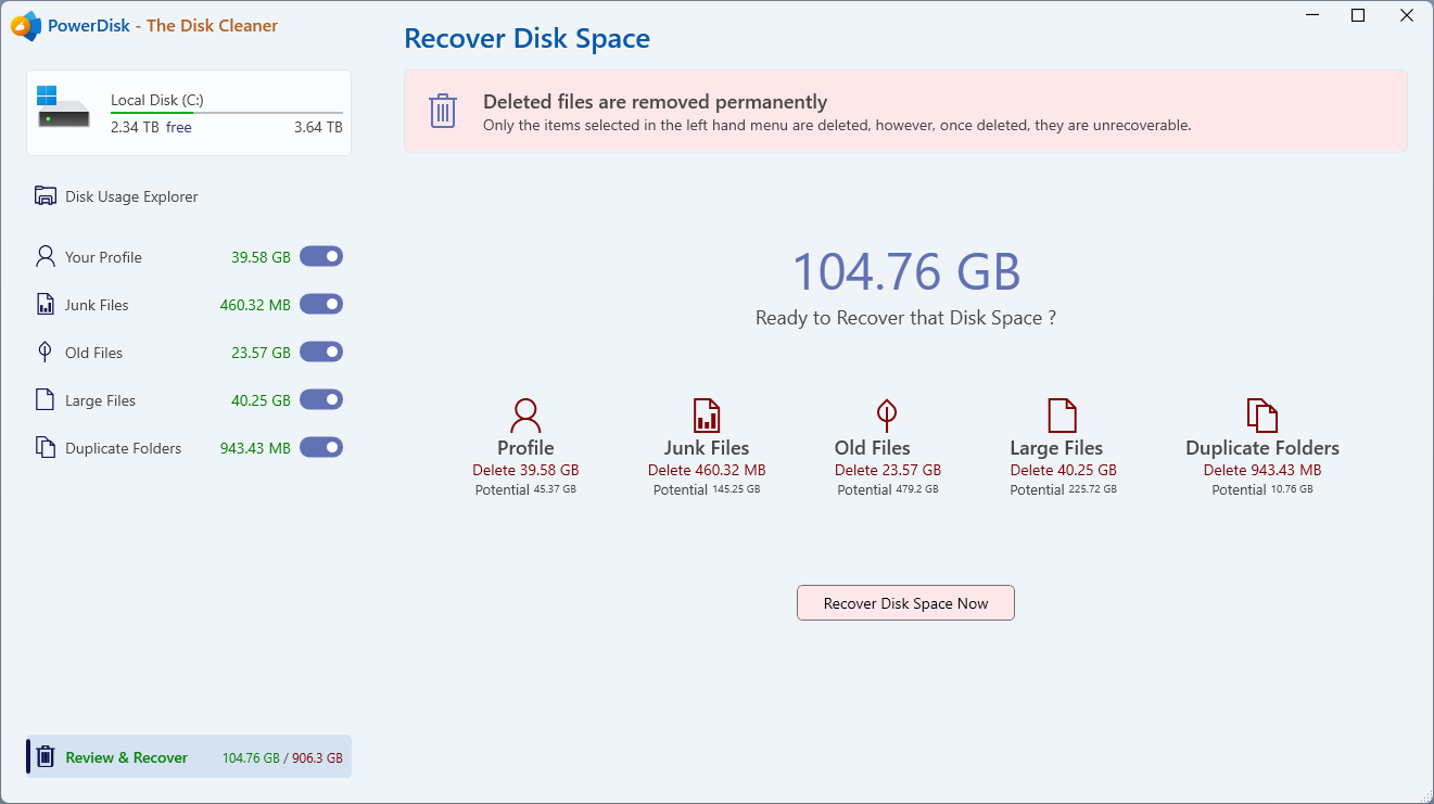 PowerDisk is a PC Cleaner that recovers disk space from any of your drives. It's an easy to use, next generation utility that not only shows you where the waste is, but also recommends what to remove, how safe that is, and then removes it. If any of your disks are getting full, this is the utility you need; it's simple, powerful, and user friendly.