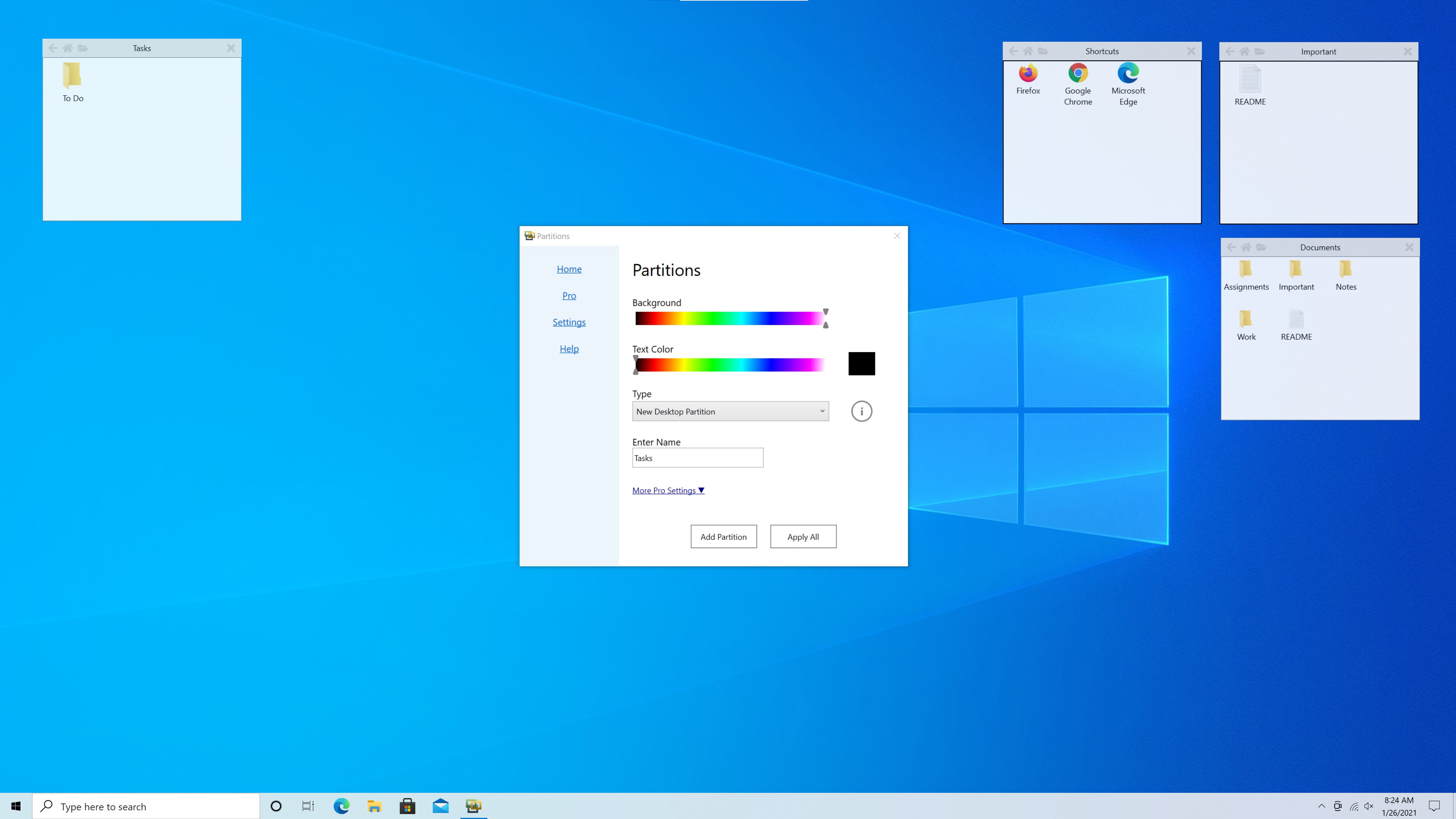Organize your desktop files, icons, and shortcutsCreate groupings for your files and shortcutsAdd multiple windows explorers on your desktop (Ex: create portals for Documents, Pictures, Downloads, etc)Customize the font color, background, transparency, and size of each partitionDe-clutter your desktop by moving all your files, icons, and shortcuts into containersNavigate into folders and open links within each partitionBring partitions to the foreground while you workA free alternative to Stardock\'s Fences with optional enhancements