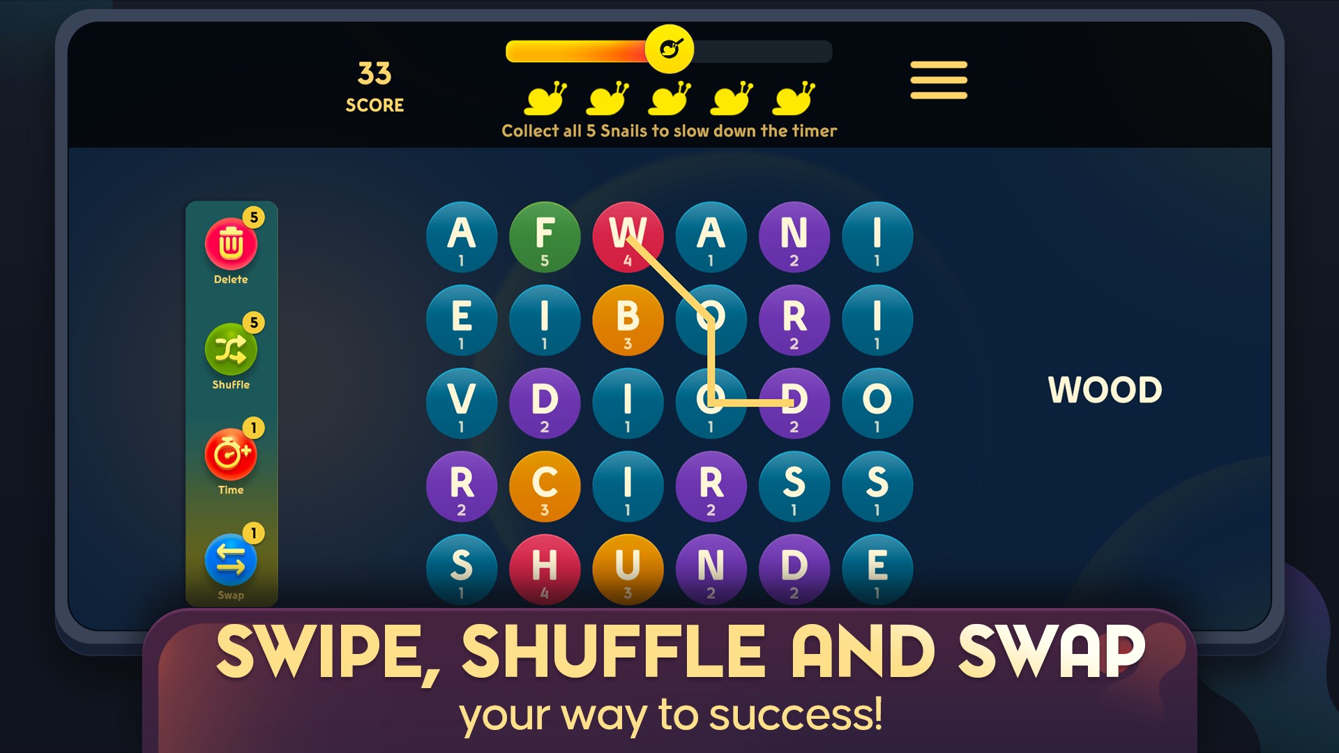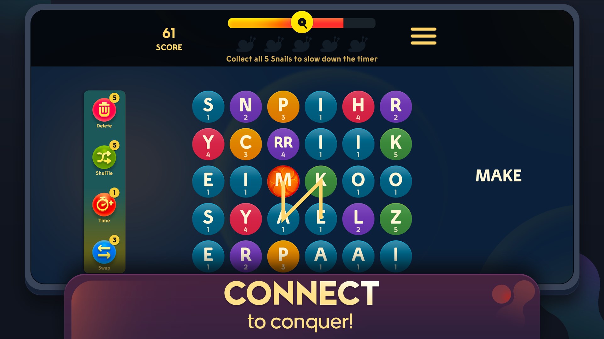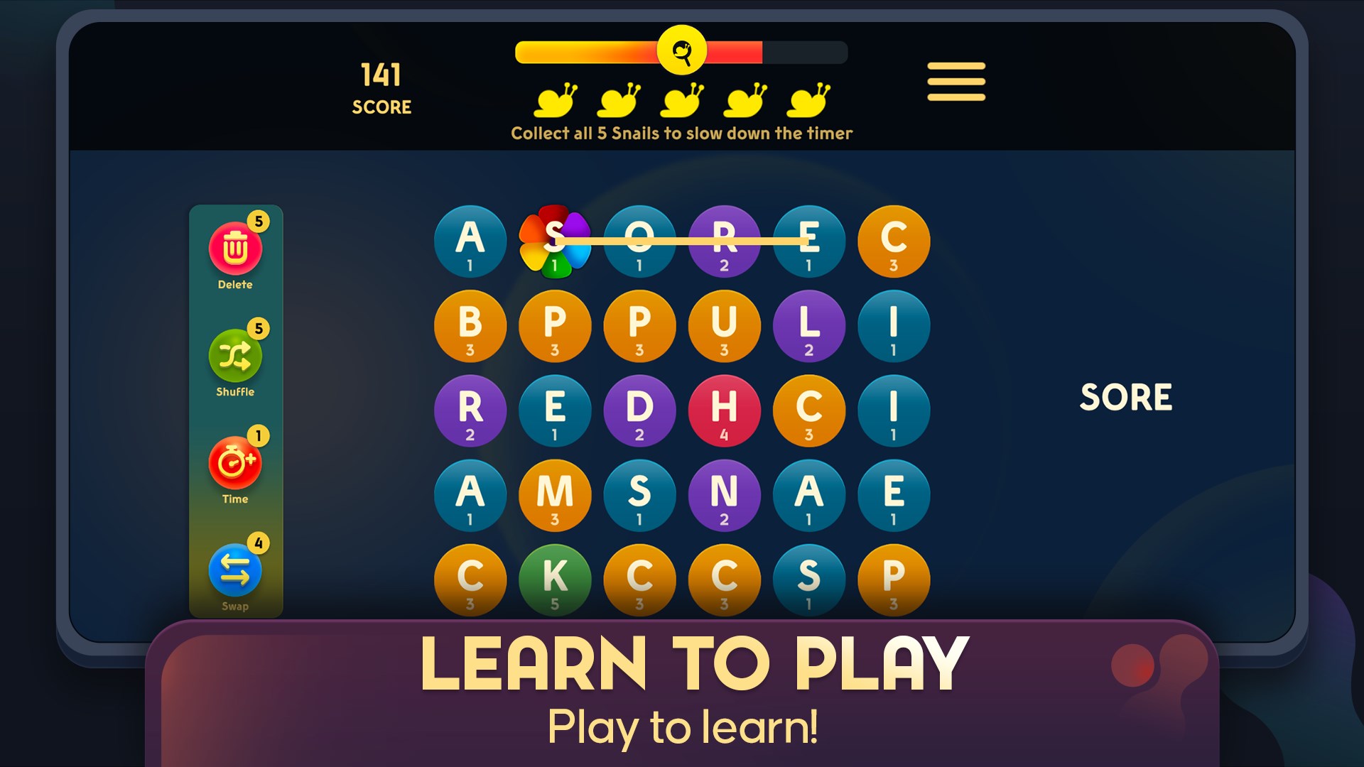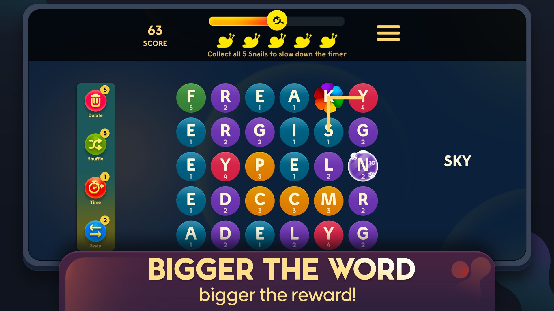 In ‘Word Crush’, when the player makes longer words (5 letters and above), the game unlocks a special mode called ‘Snail mode’ which slows the ticks. When in this mode, the time ticks every 2 seconds instead of 1 second. Basically, your mastery over vocabulary to make longer words helps you to bend time and gain more of it to top the leaderboard.