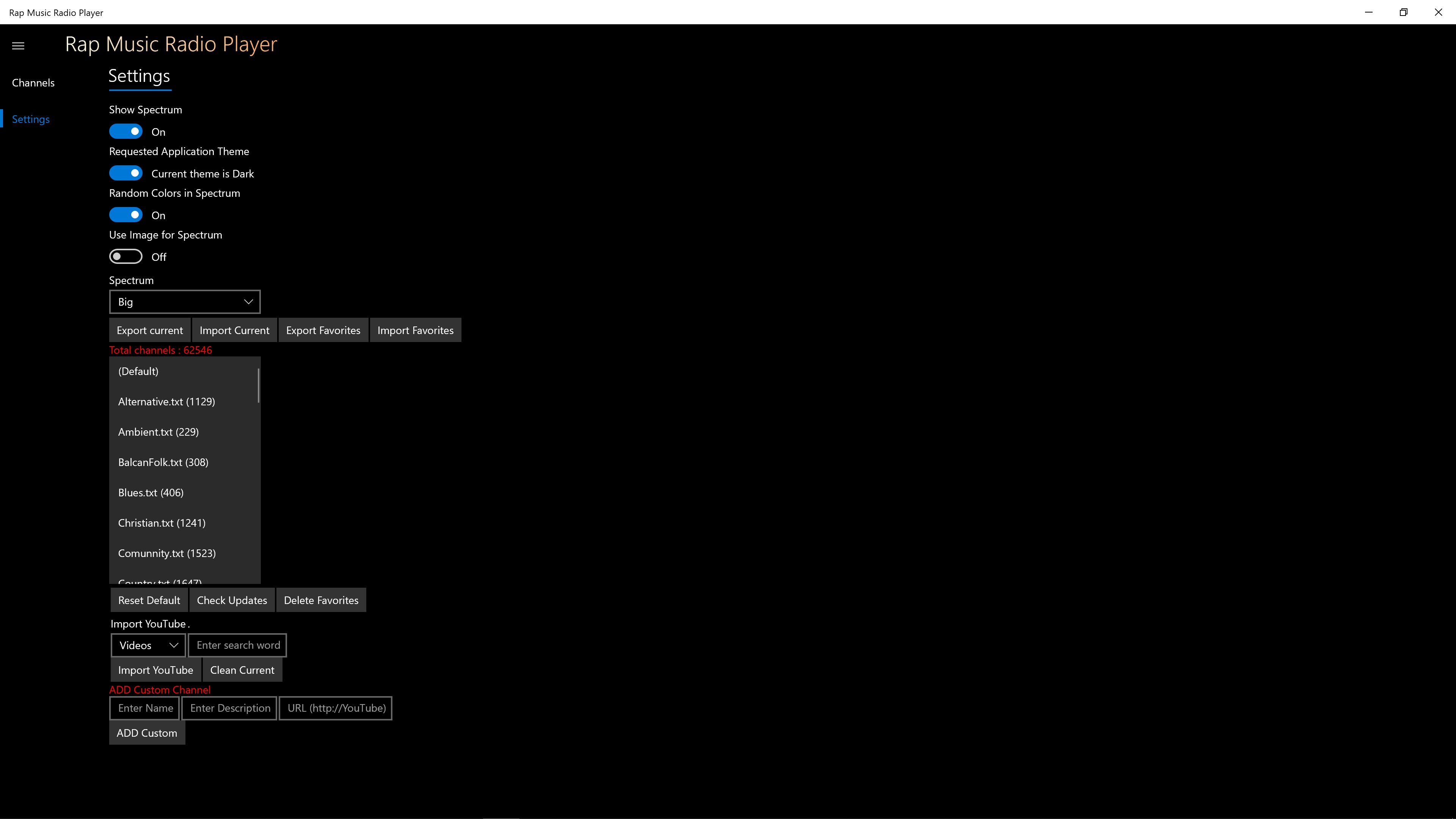 Added Custom channel under settings to merge with current station list. (Supports also YouTube).