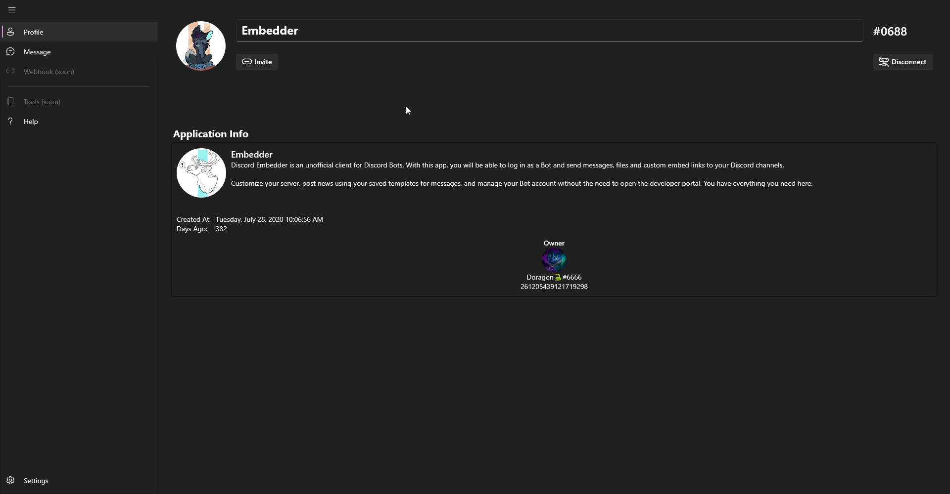 Embedder is an unofficial client for Discord Bots. With this app, you will be able to log in as a Bot and send messages, files, and custom embed links to your Discord channels.