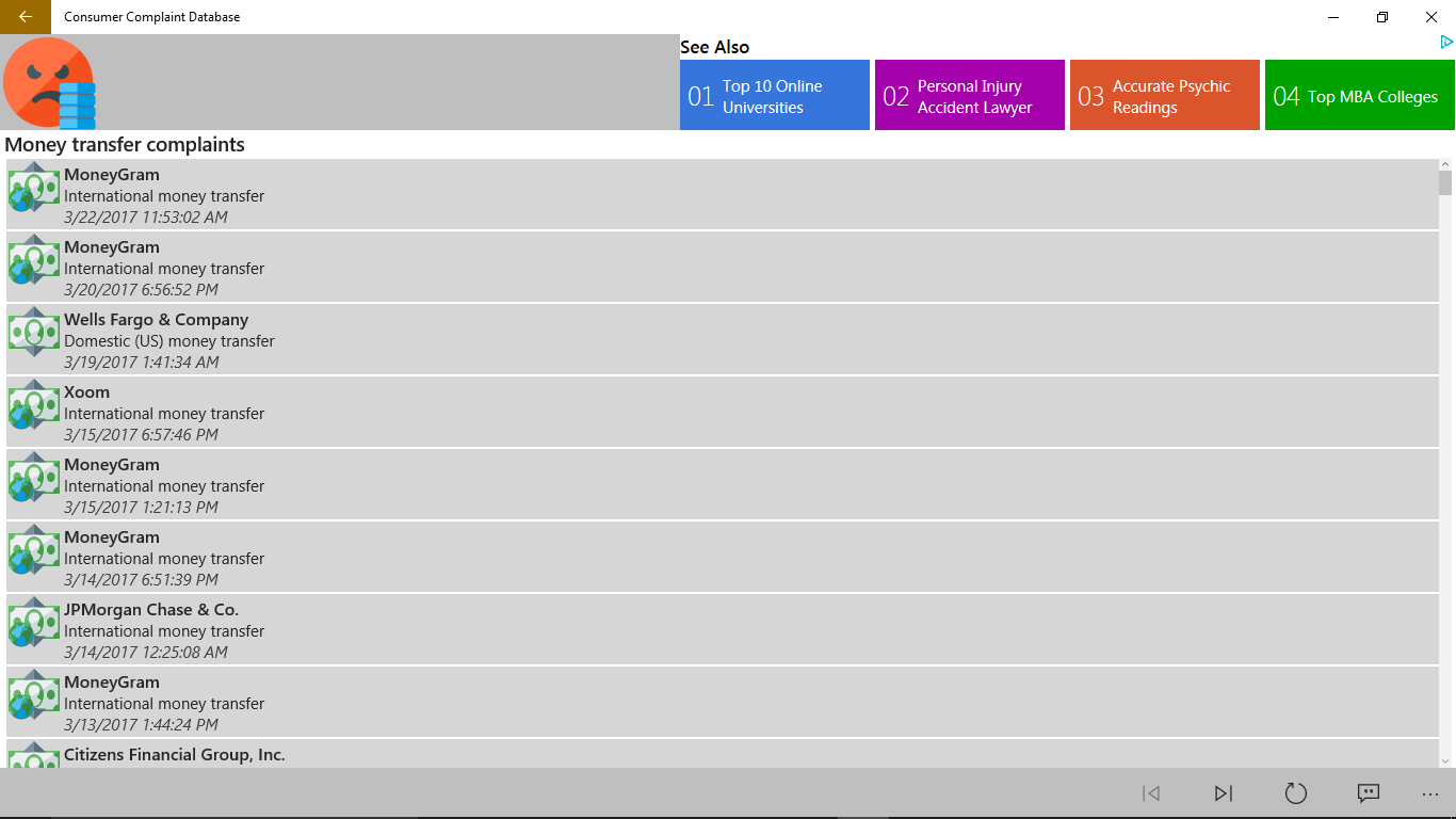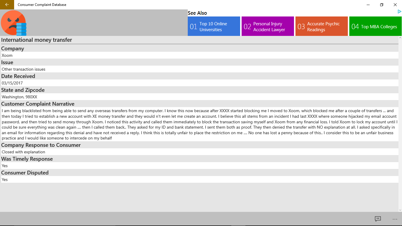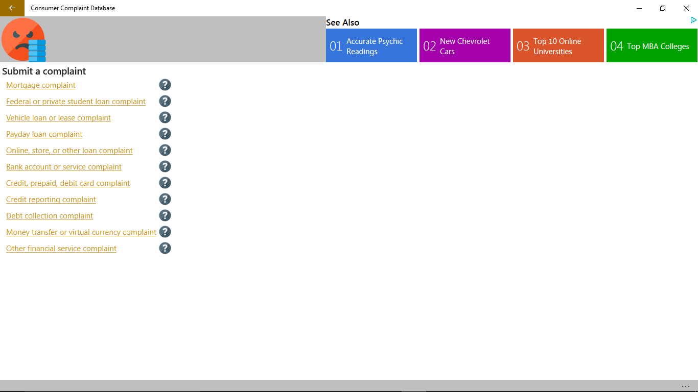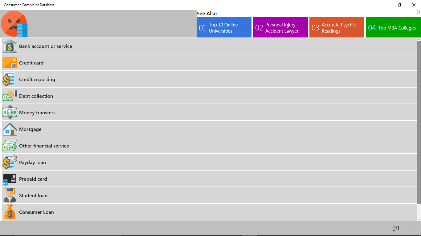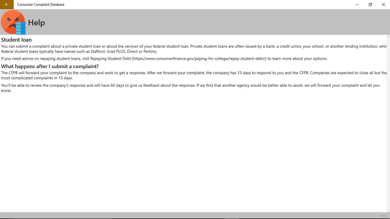 Have an issue with a financial product or service? Then Consumer Complaint Database is here for you. Us this app to view complaints from other consumers who may be experiencing a similar issue as you. Additionally, if you want to submit an issue this app can help, directing you to the Consumer Financial Protection Bureau (CFPB) where they can gather your data and forward your complaint to the company and work to get a response from them.