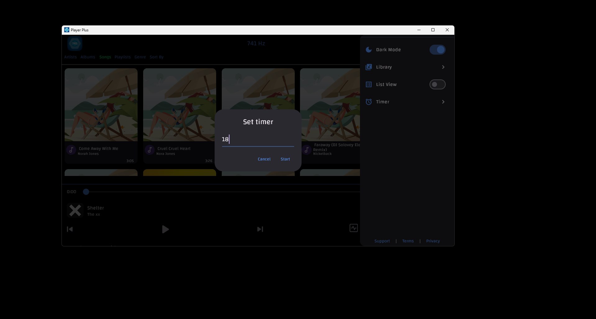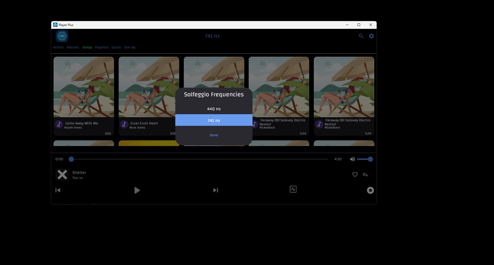 440 Hz to 741 HzRetune 440 Hz Music to 741 HzMusic player with shuffle, repeat one, repeat all modesMusic player with sleep timerMusic player with custom playlists