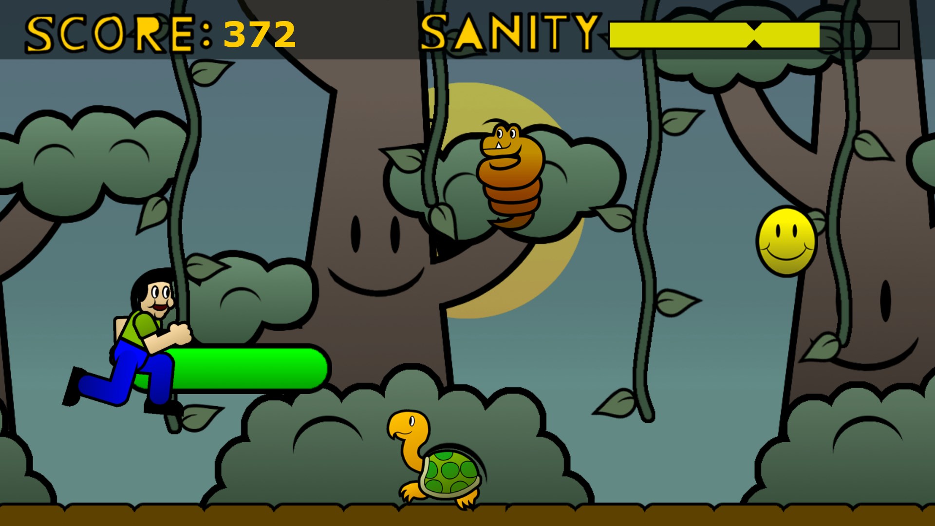Jump on enemies and collect hearts to regain sanity. The mask powerup allows you to take a single hit without losing any sanity, at the cost of losing your mask. You lose sanity constantly and by enemies running into you. To get a high score in Arcade Hysteria, make sure you never miss a heart Powerup and always jump on enemies!
