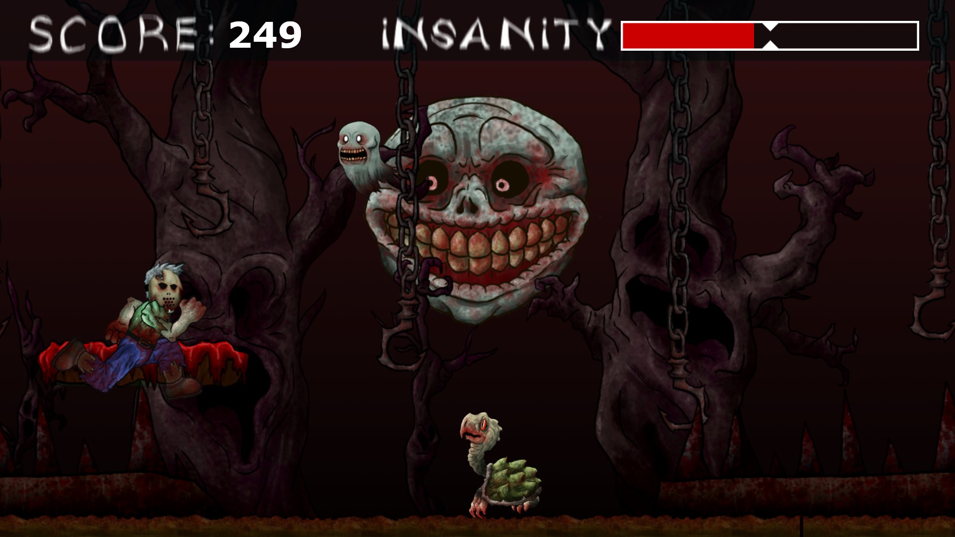 Tap or press any button to jump and double jump. The goal of Arcade Hysteria is to keep your sanity as long as you can, as indicated by the top-right Sanity Meter. When the Sanity Meter is at 50%, the graphics will change and the game speed will be faster. When the meter hits zero, the game is over.