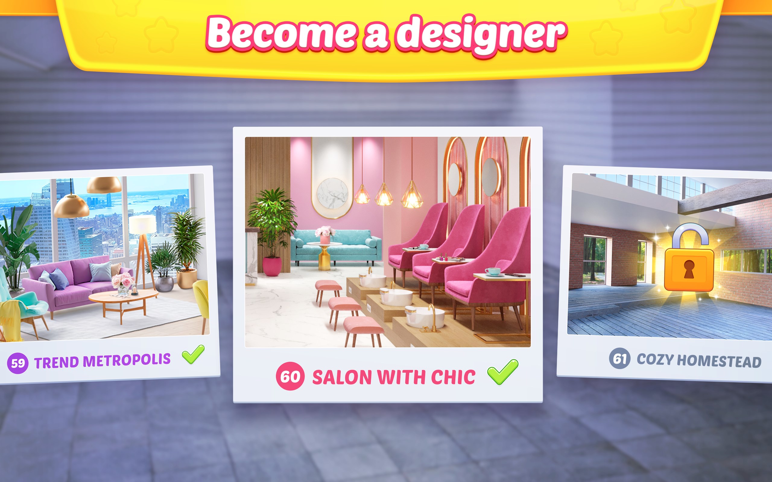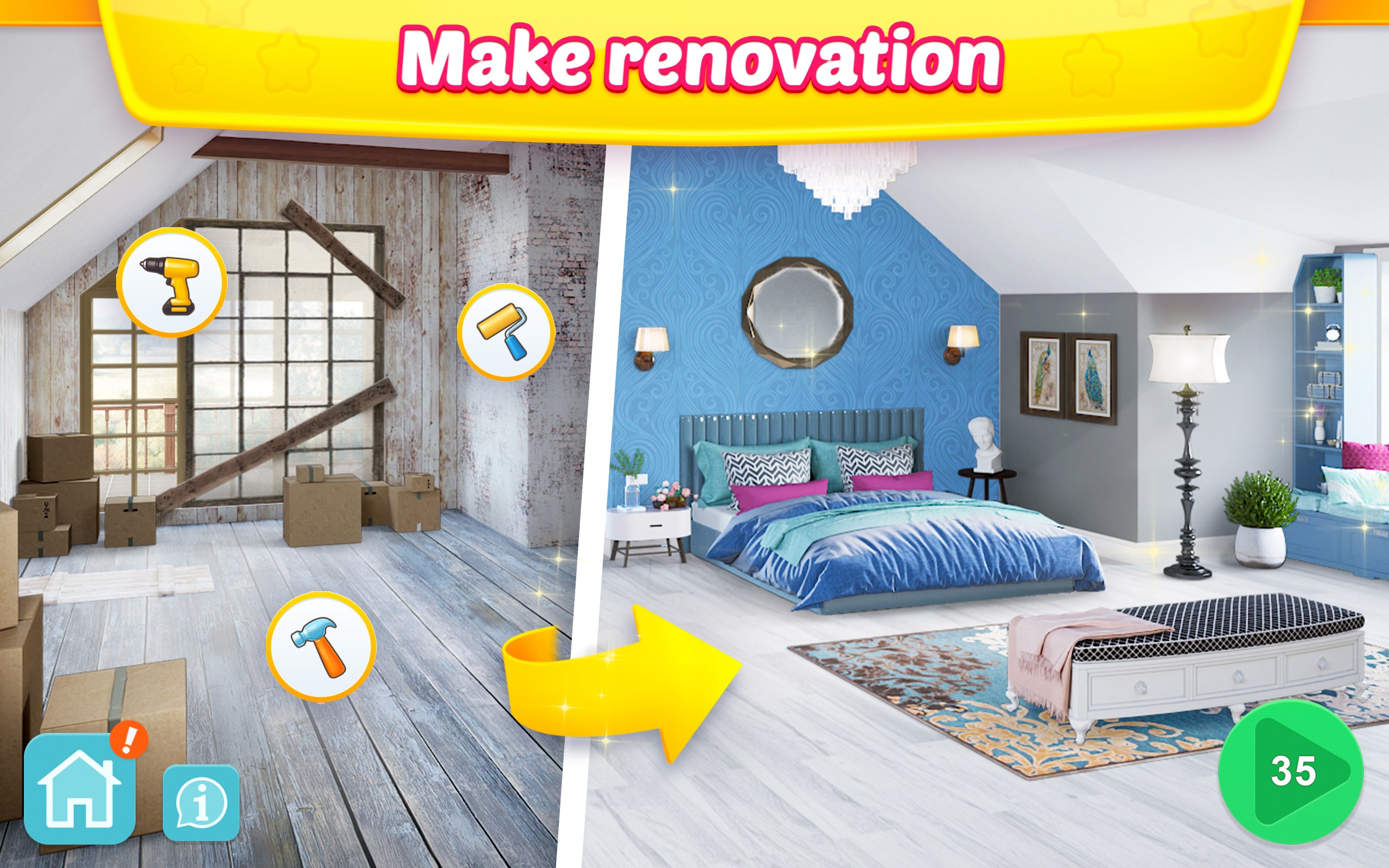 Renovate homes & create new interiors, start room makeover, decorate & design your own house and win in fun match-3 makeover game!