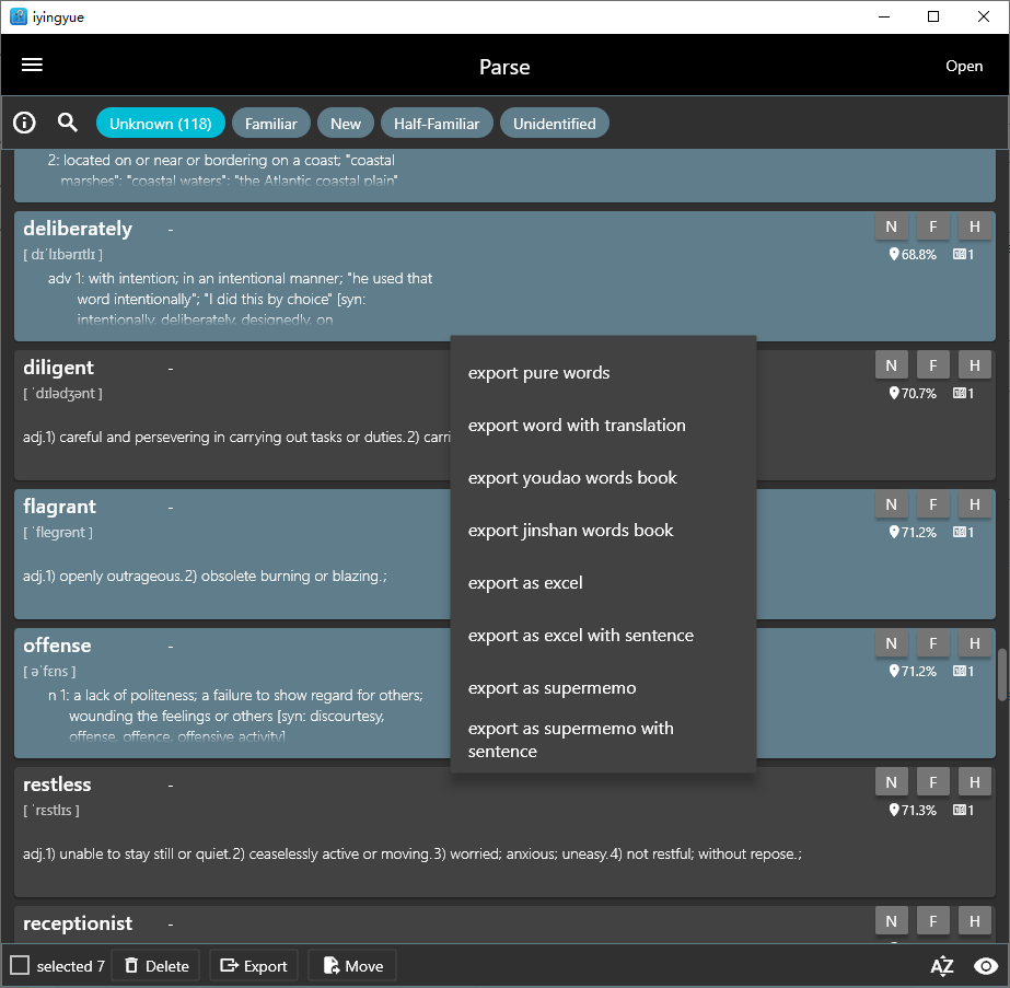 3) Export the extracted unknown words as word book, thus you can recite them anytime anywhere whith the use of other popular software of reciting words.