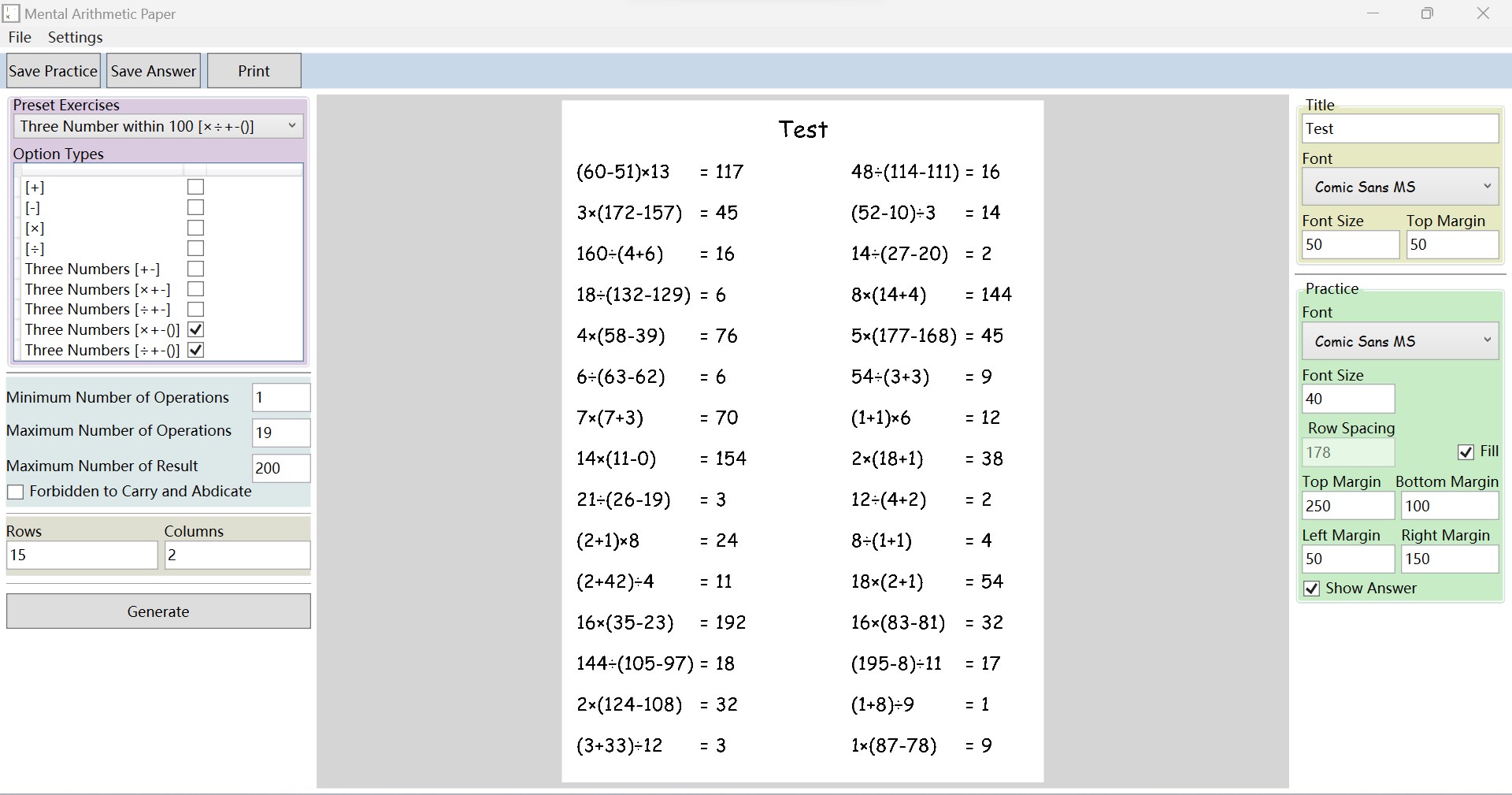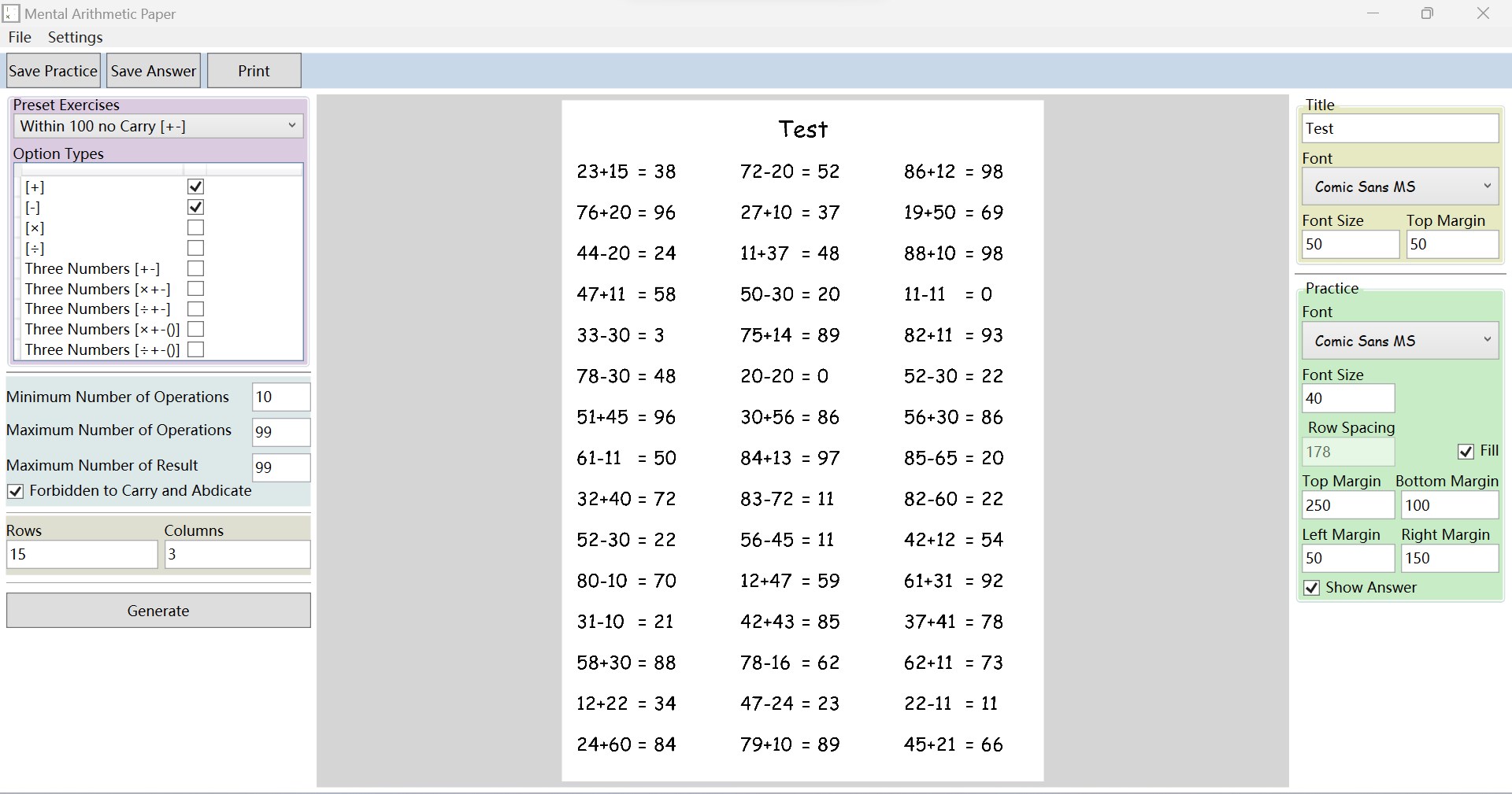 Oral arithmetic practice problems such as addition, subtraction, multiplication and division can be randomly generated, and typeset as A4 paper images for direct printing. You can freely set whether the arithmetic includes addition, subtraction, multiplication, division and parentheses, as well as the range of values of the arithmetic and the result, and you can set the number of rows, columns, titles, fonts and margins of the exercise questions. Practice questions and answers can be saved separately so that you can check the exercise results.