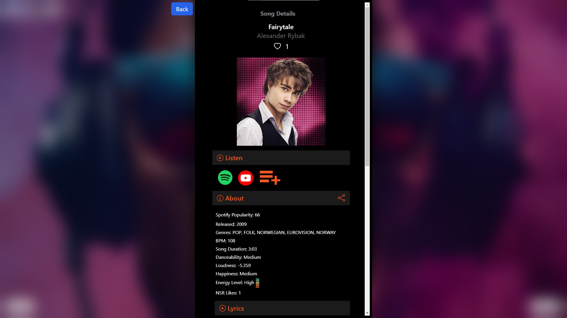 Detailed Song Information: Access valuable details for each song, including BPM, energy level, key, and lyrics.