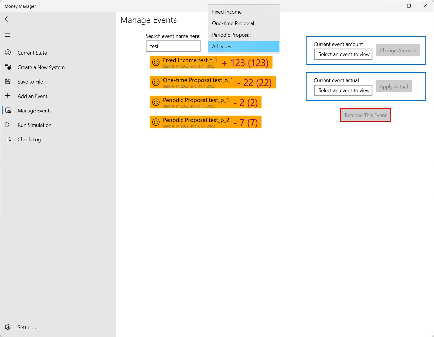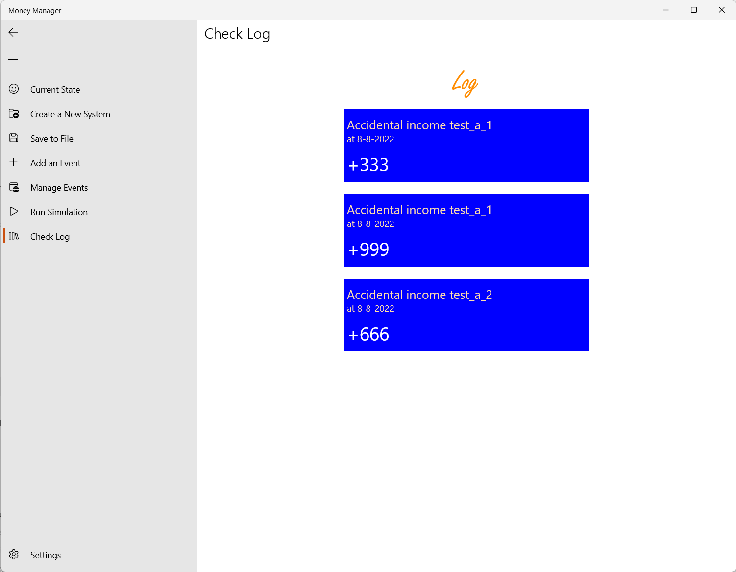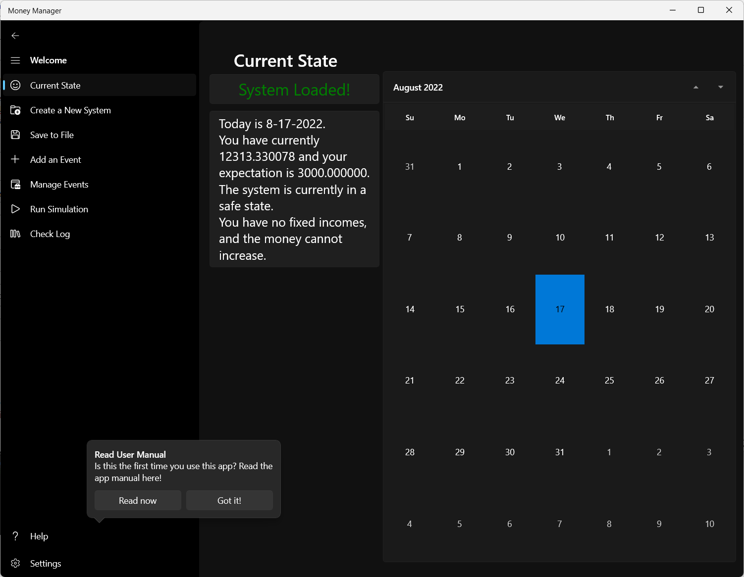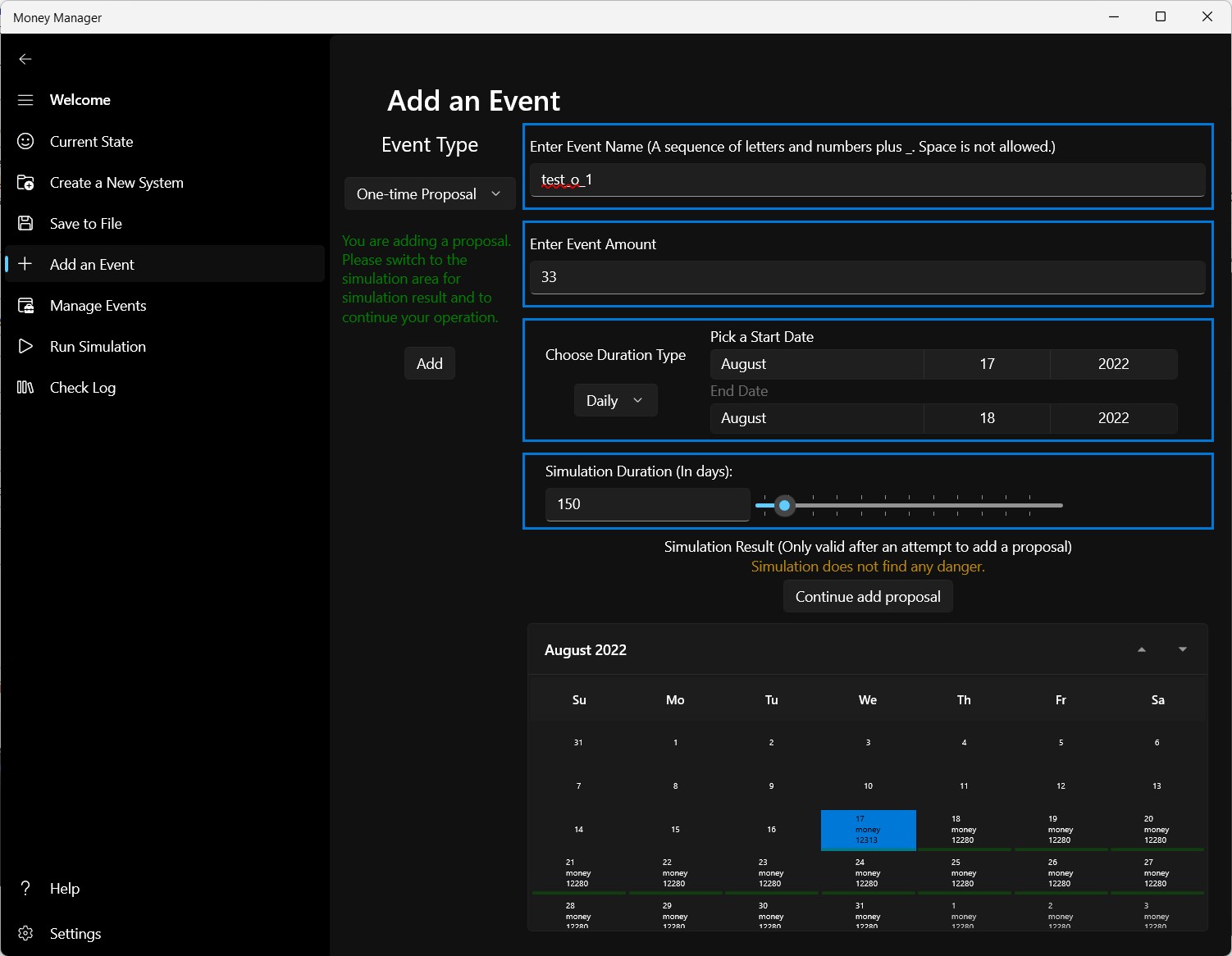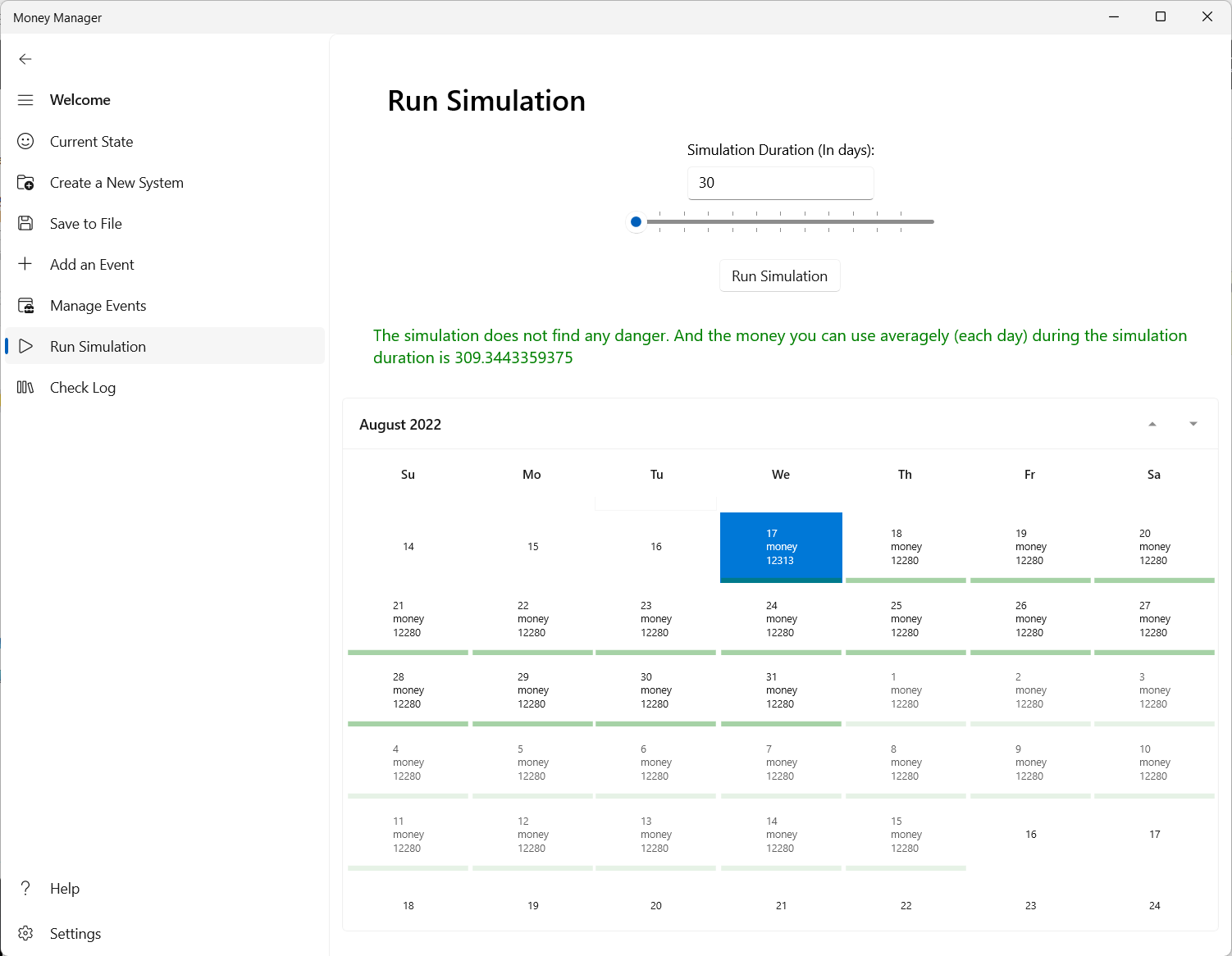 Helps the users to manage their money by providing functionalities like predicting the future money amount (a simulation), deciding if it would be safe for the user to spend a sum of money (adding a proposal).
