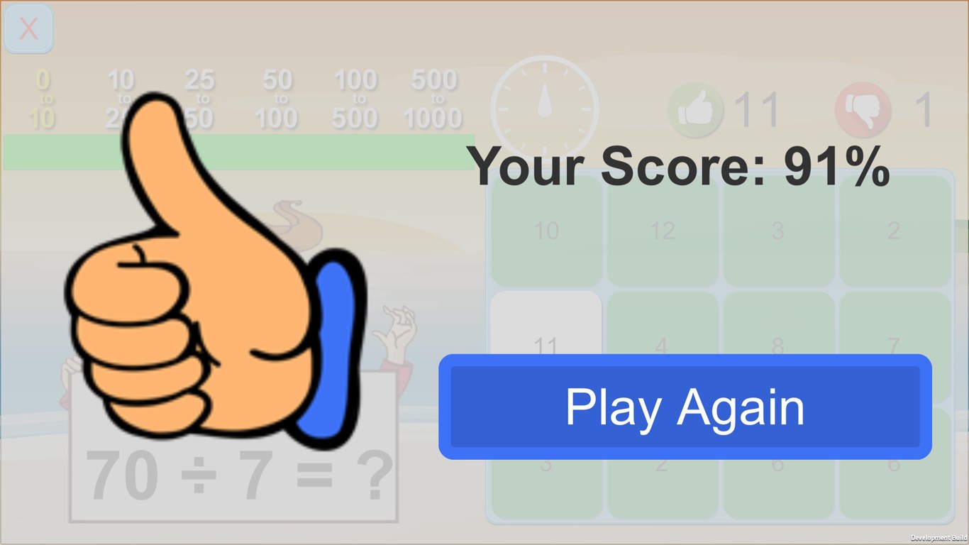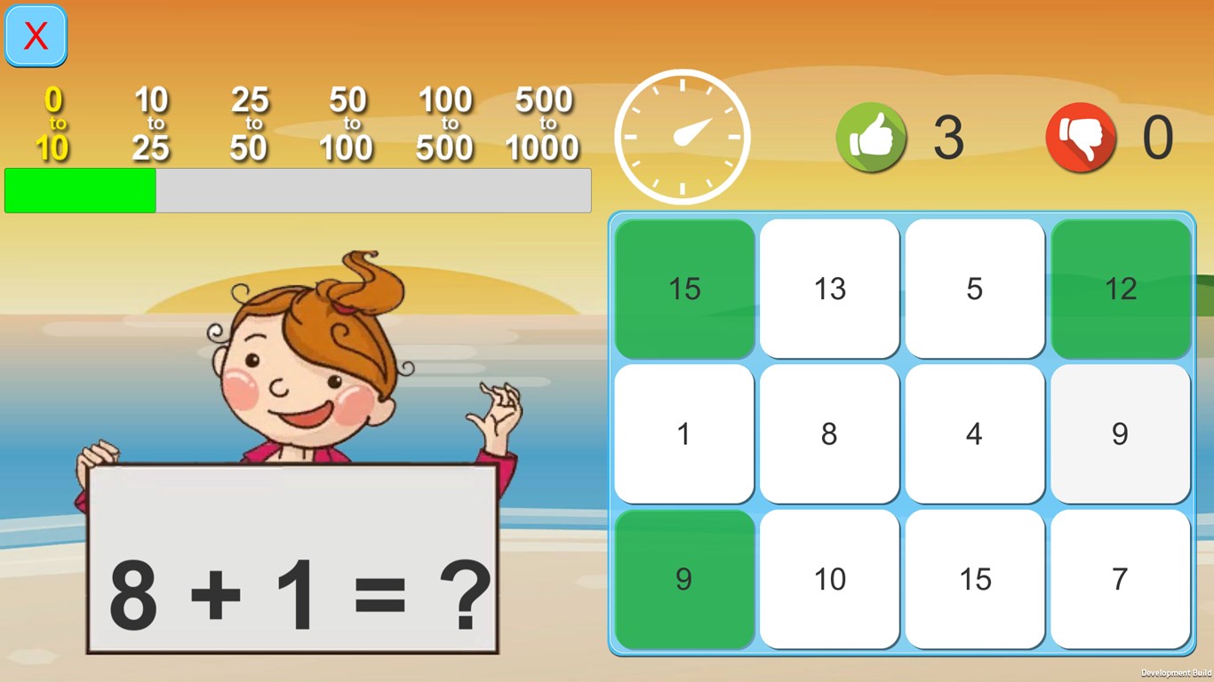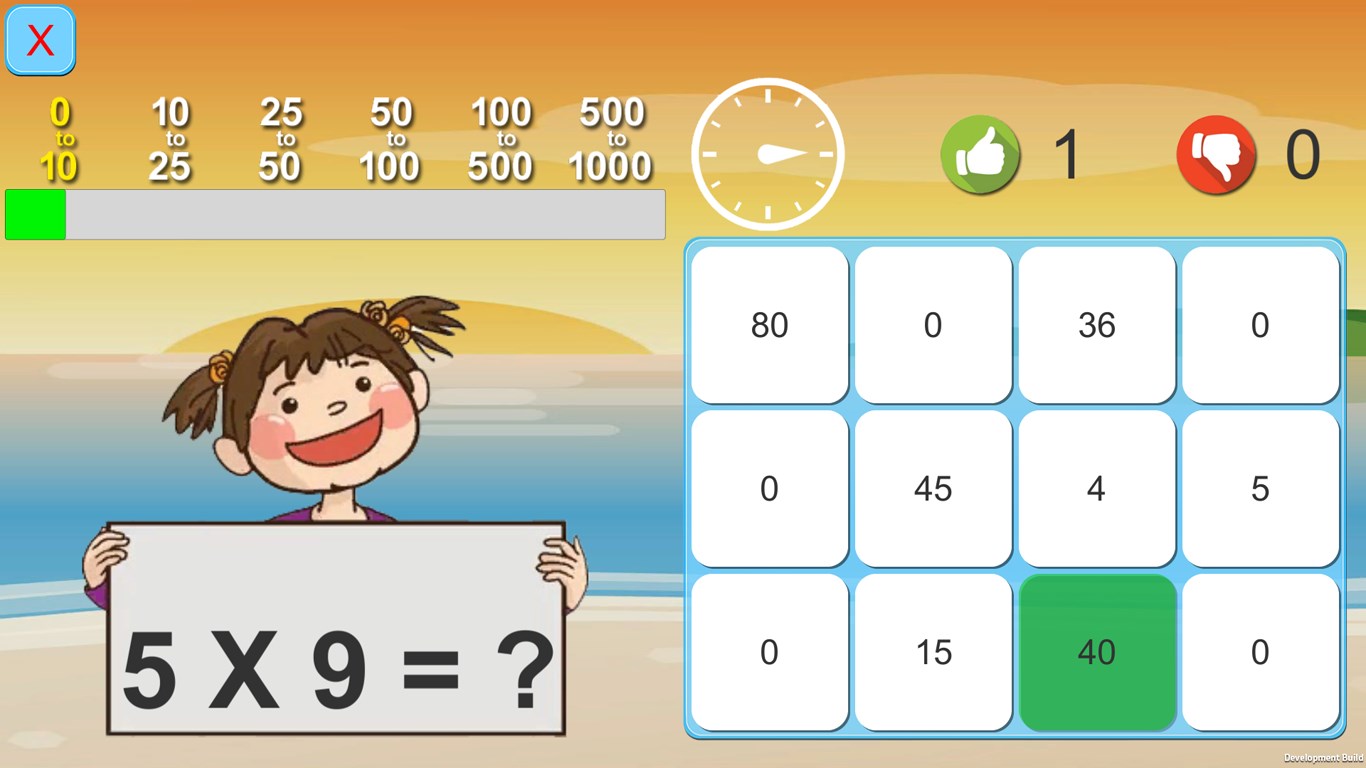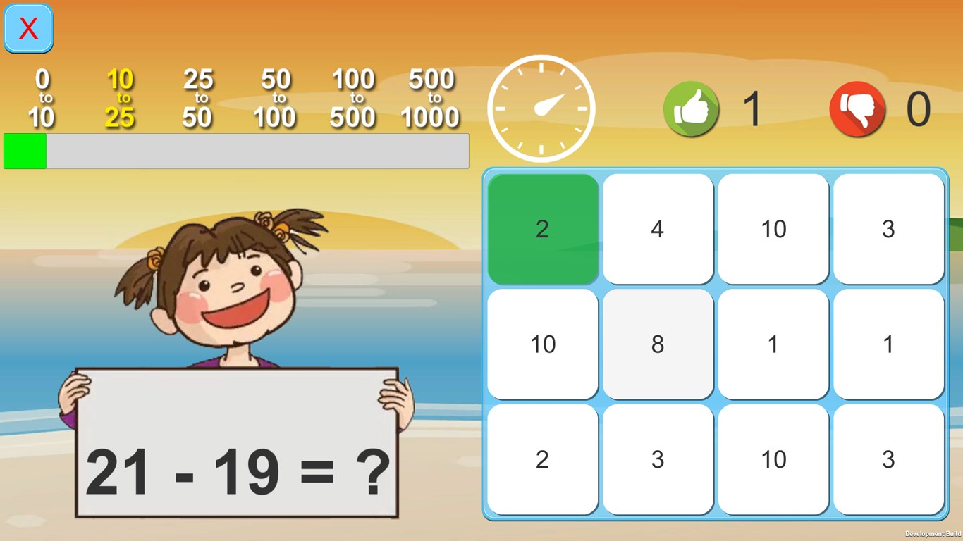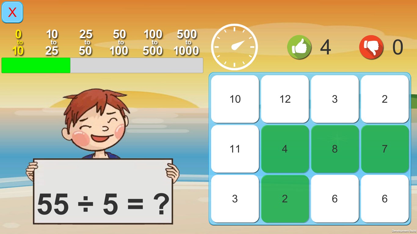 Math Exercise helps your kids to improve their math calculation. You need to give correct answer of each problem within 12 seconds. It shows how many answers were correct and wrong.