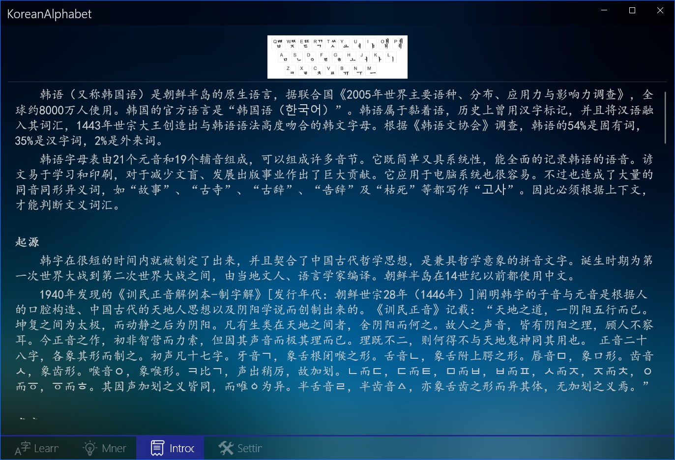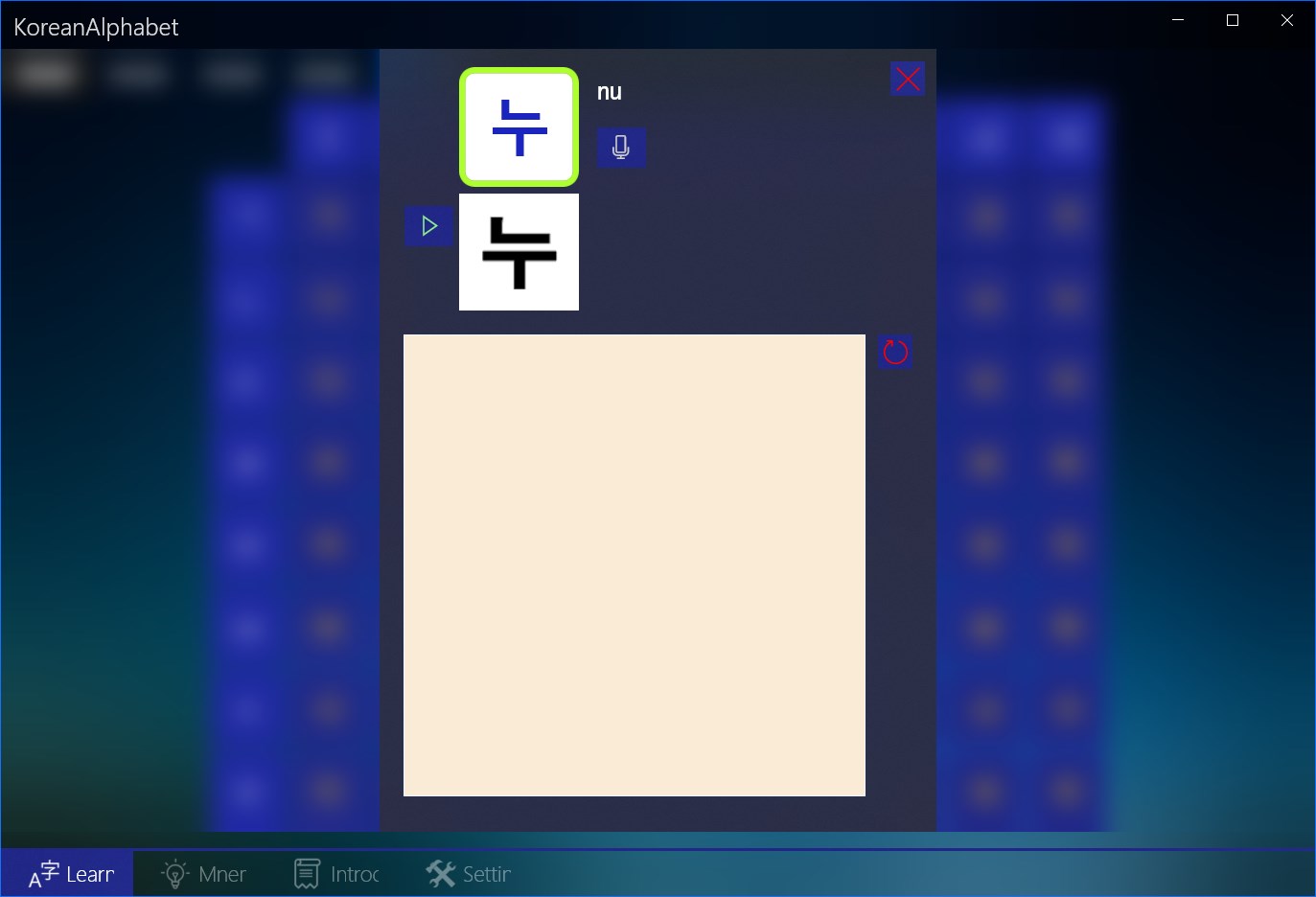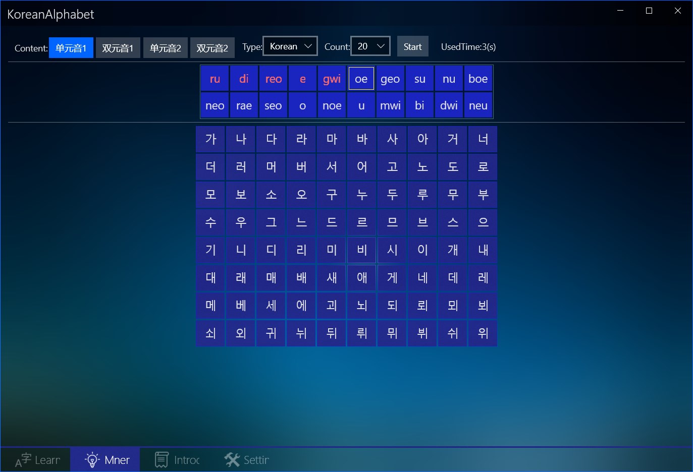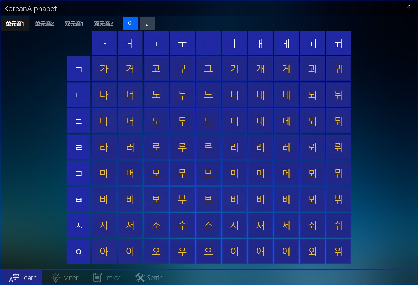 This application can be used as an auxiliary tool to learn Korean alphabet, including pronunciation learning, writing learning, writing practice, memory training, etc., can promote the learning and memory of Korean alphabet, so as to lay a good foundation for learning Korean.