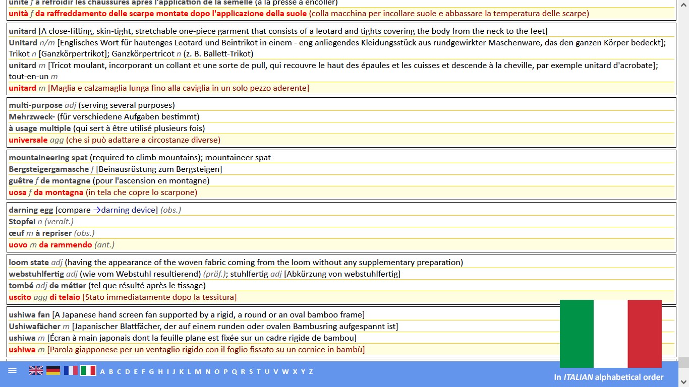 Im Unterschied zu anderen Werken, die Erklärungen zu den Termini nur in einer Sprache geben, werden in diesem Werk Erklärungen in allen vier Sprachen geboten. Ein Novum ist die Kennzeichnung der am meisten verwendeten Begriffe, als vorrangig bzw. präferenziell (präf.) zu gebrauchen. Darüber hinaus führen einige Begriffe auch Querverweise, um die Orientierung in diesem Werk zu erleichtern. Die Suchsprache kann jederzeit durch Anklicken der entsprechenden Fahne geändert werden.