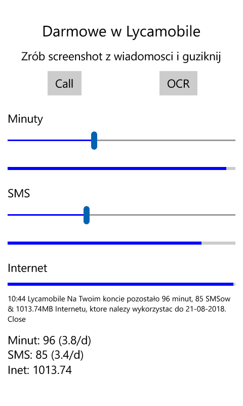 Pozostałe minuty i SMS zostaną pokazane na dwa sposoby: ile na dzień (slider), oraz ile do końca okresu rozliczeniowego (progressbar).