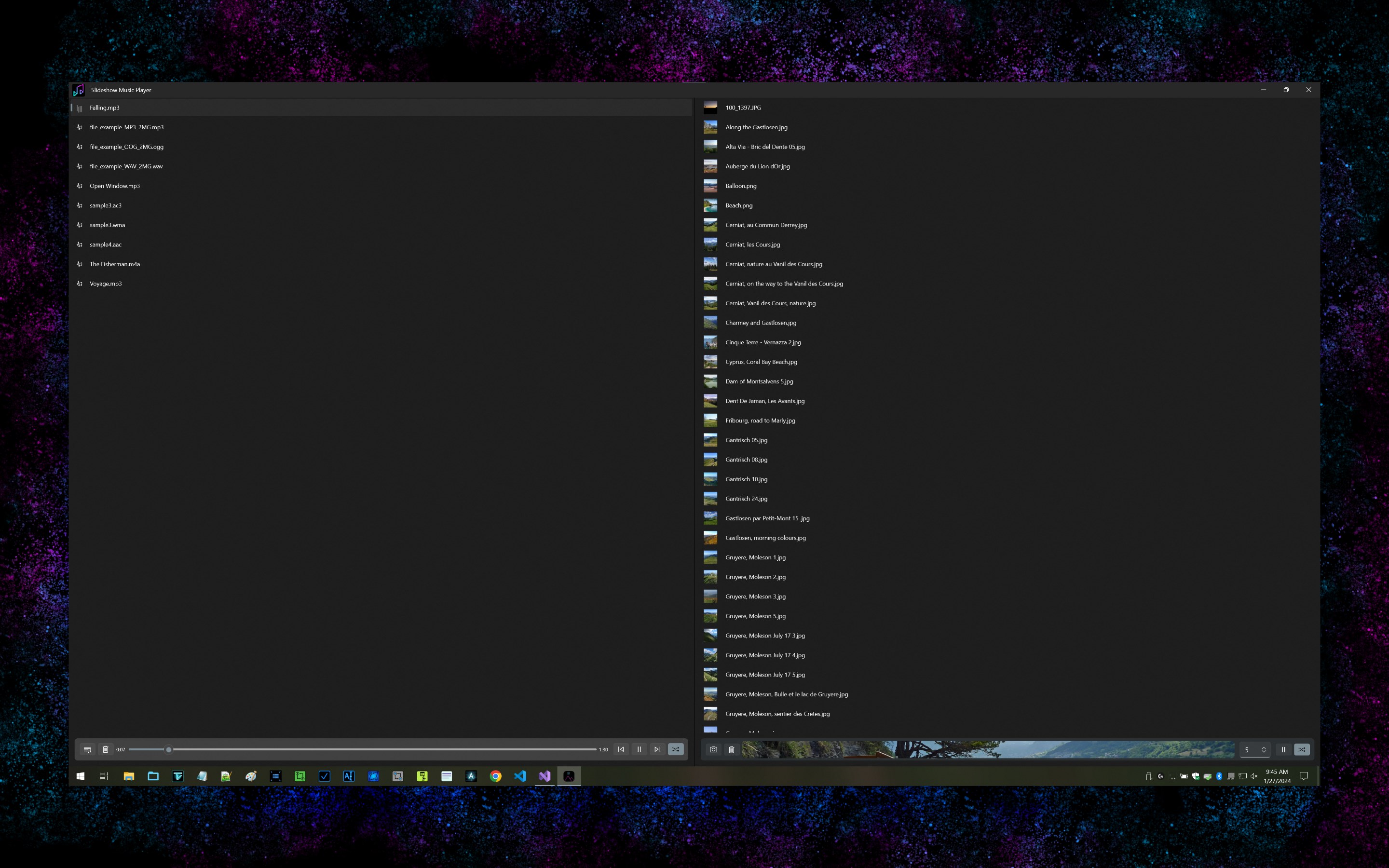 Play music and view an image slideshow at the same time using Slideshow Music Player. Choose a music directory (optionally include sub-directory content) and click play to start playing music. Choose an image directory (optionally include sub-directory content) and click play to start playing an image slideshow. Adjust image delay to show an image for x amount of seconds. Double-click image preview to view a larger image slideshow, taking up the extent of the app window.