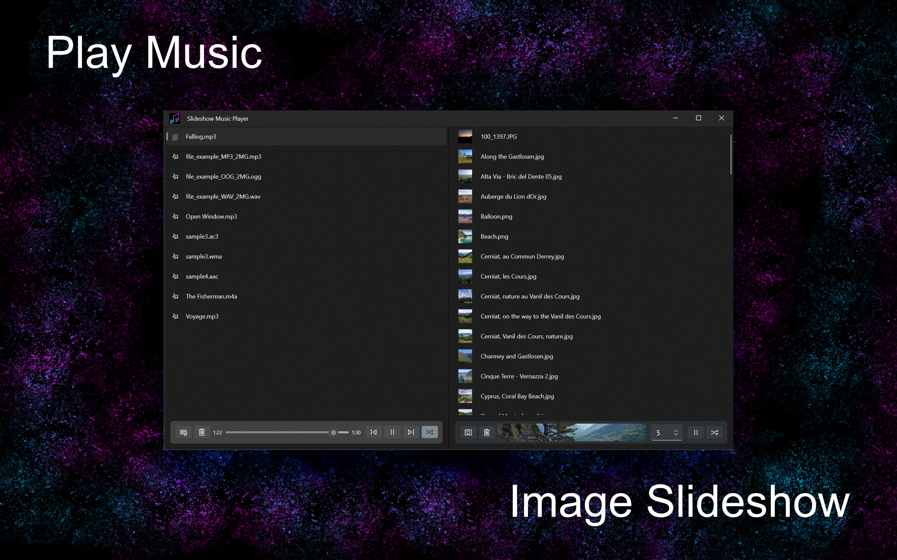 Play musicPlay image slideshowSwitch to next and previous musicAdjust image delayView window size image slideshowChoose music directory sourceChoose image directory sourceOptionally include sub-directory content
