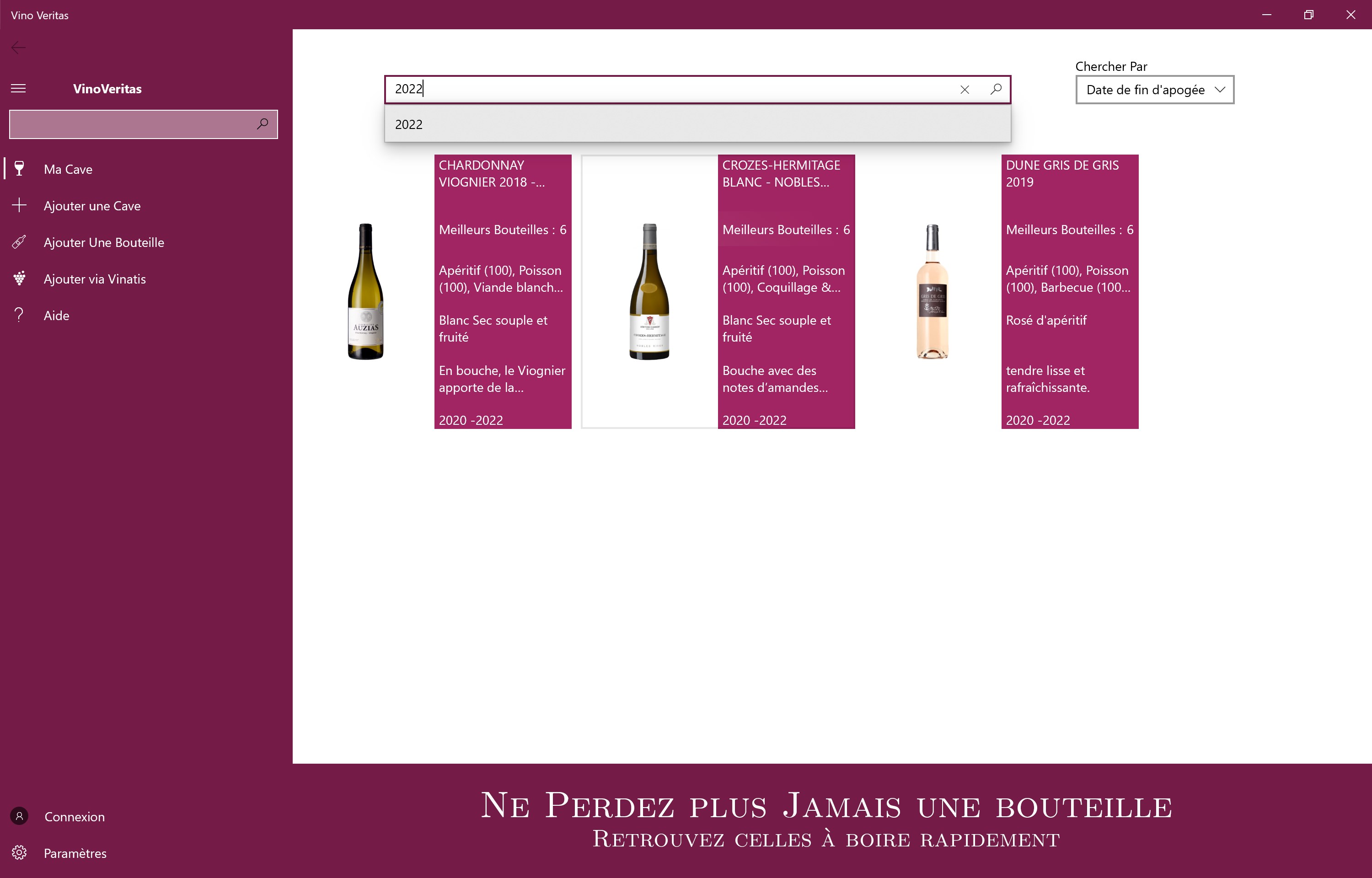 -retrouver facilement vos bouteilles avec un outils de recherche par nom/ accords mets-vins/ meilleurs notes et d'autres !