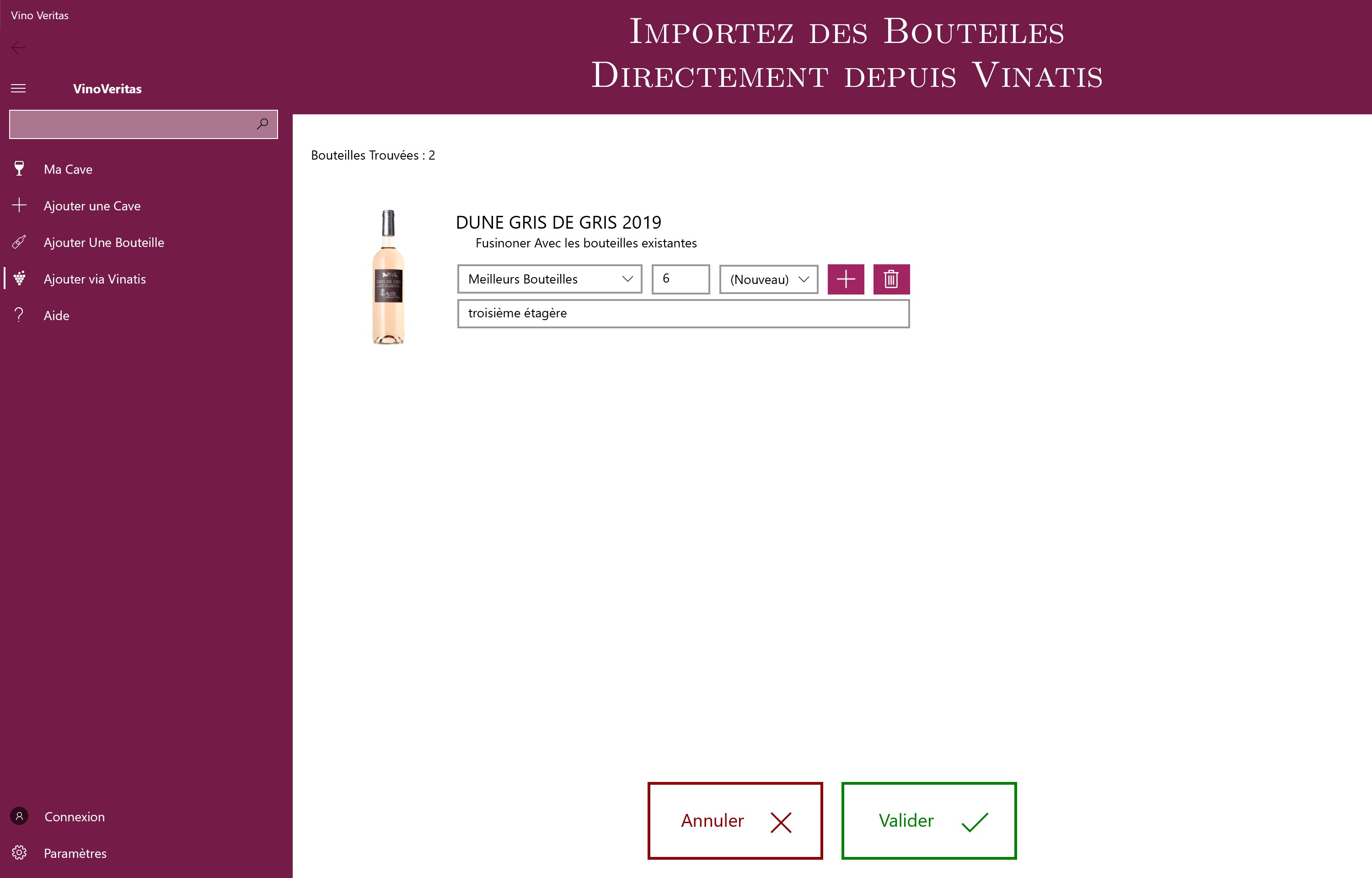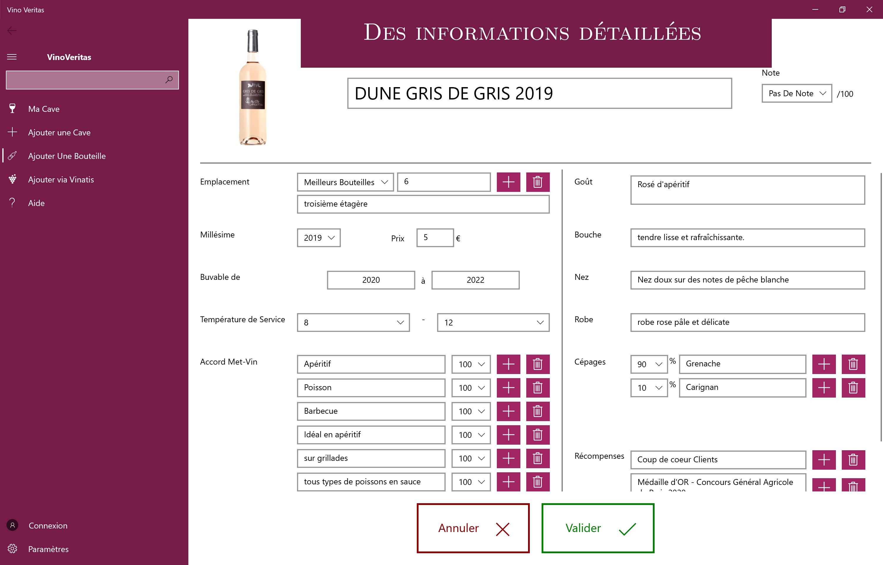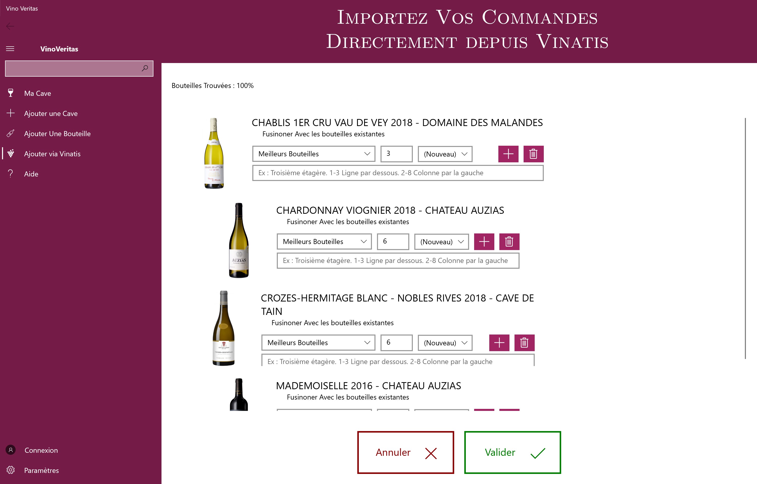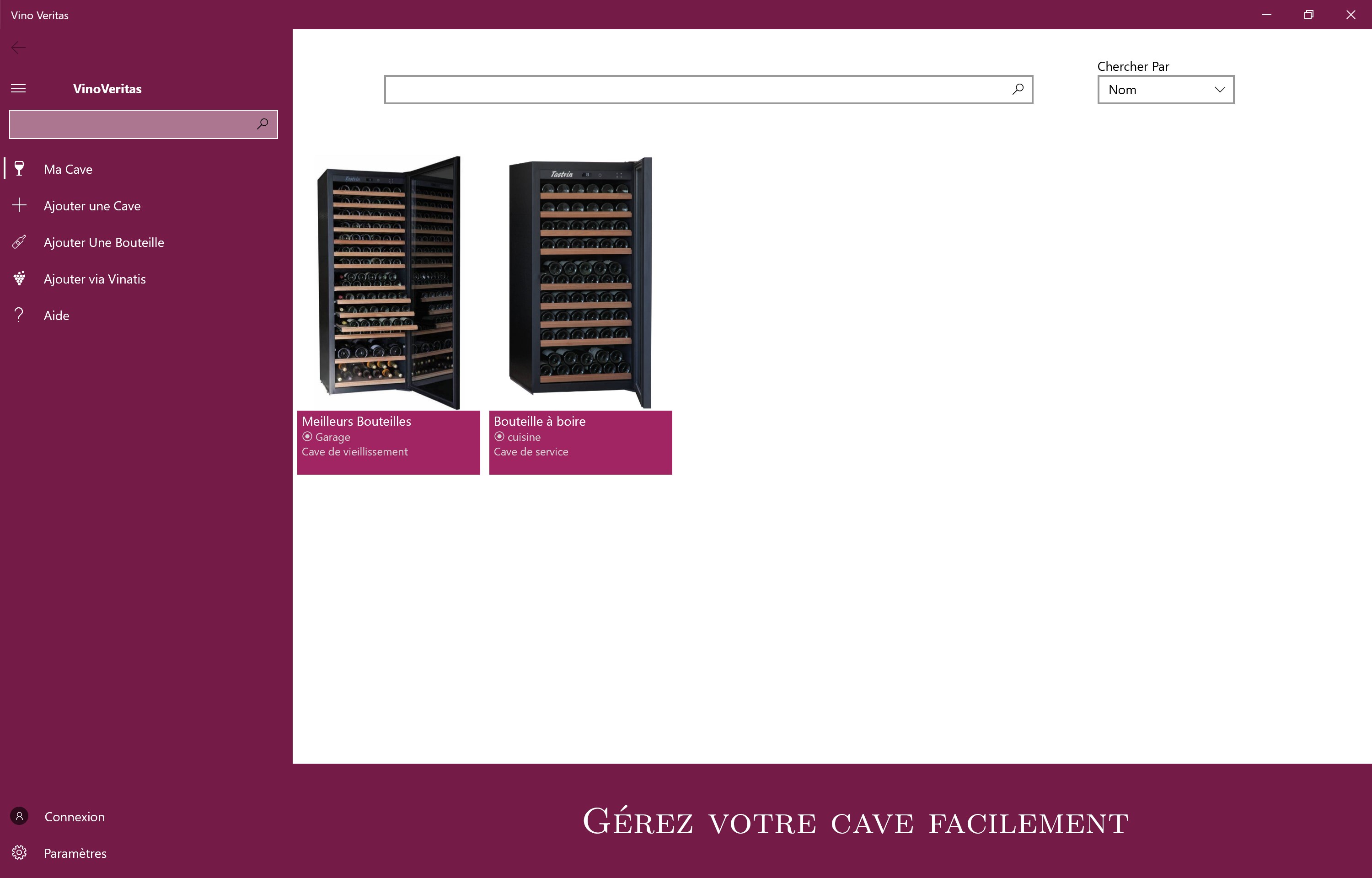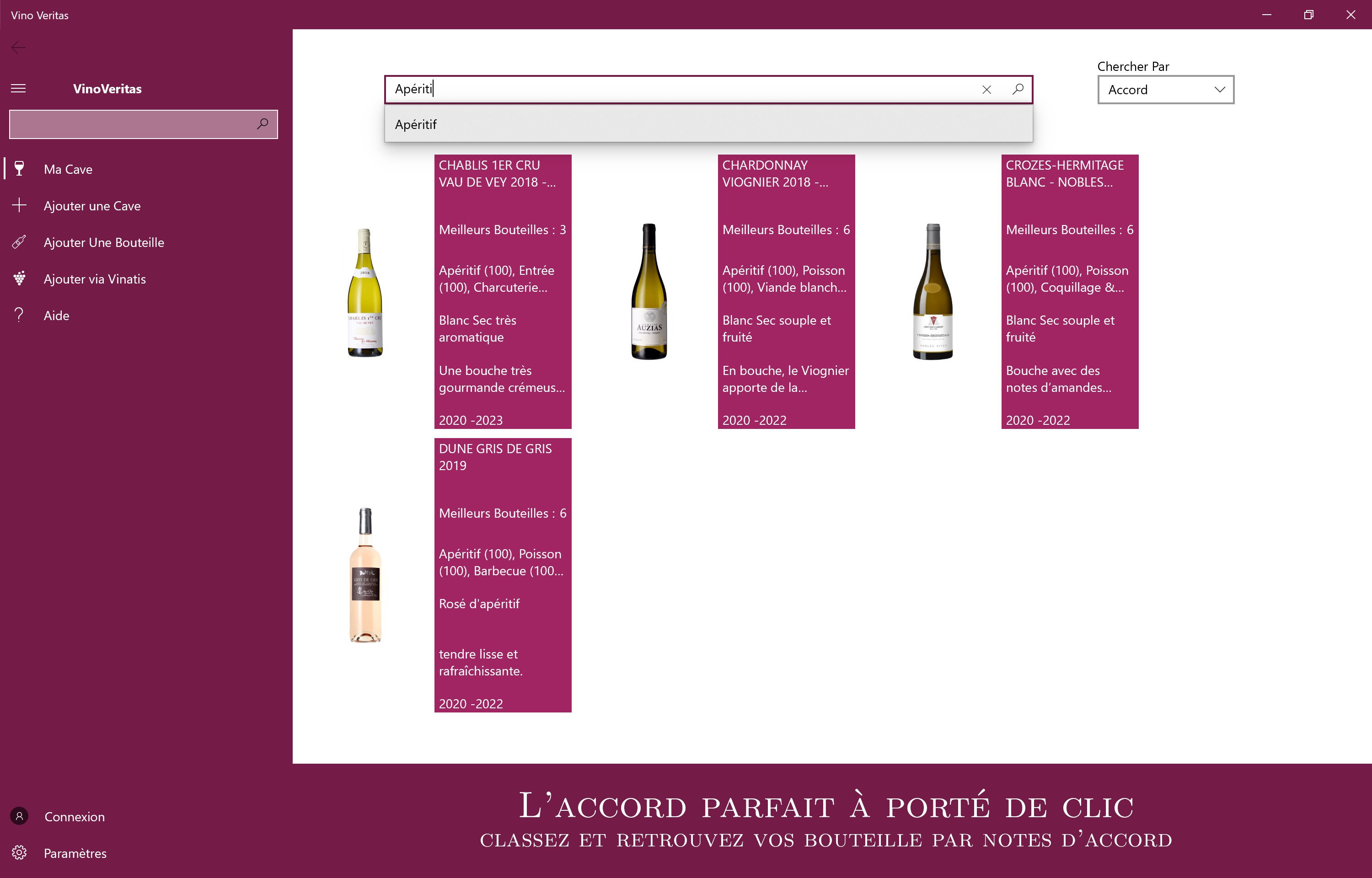 Gestion des bouteillesRechreche rapide dans la base de donnéeajout automatique de vos dernière commandes depuis vinatisfiches de bouteilles complètes et détailléesretrouver facilement vos bouteillestrier vos bouteilles par armoire de rangementrecherche par nom/accord/note...