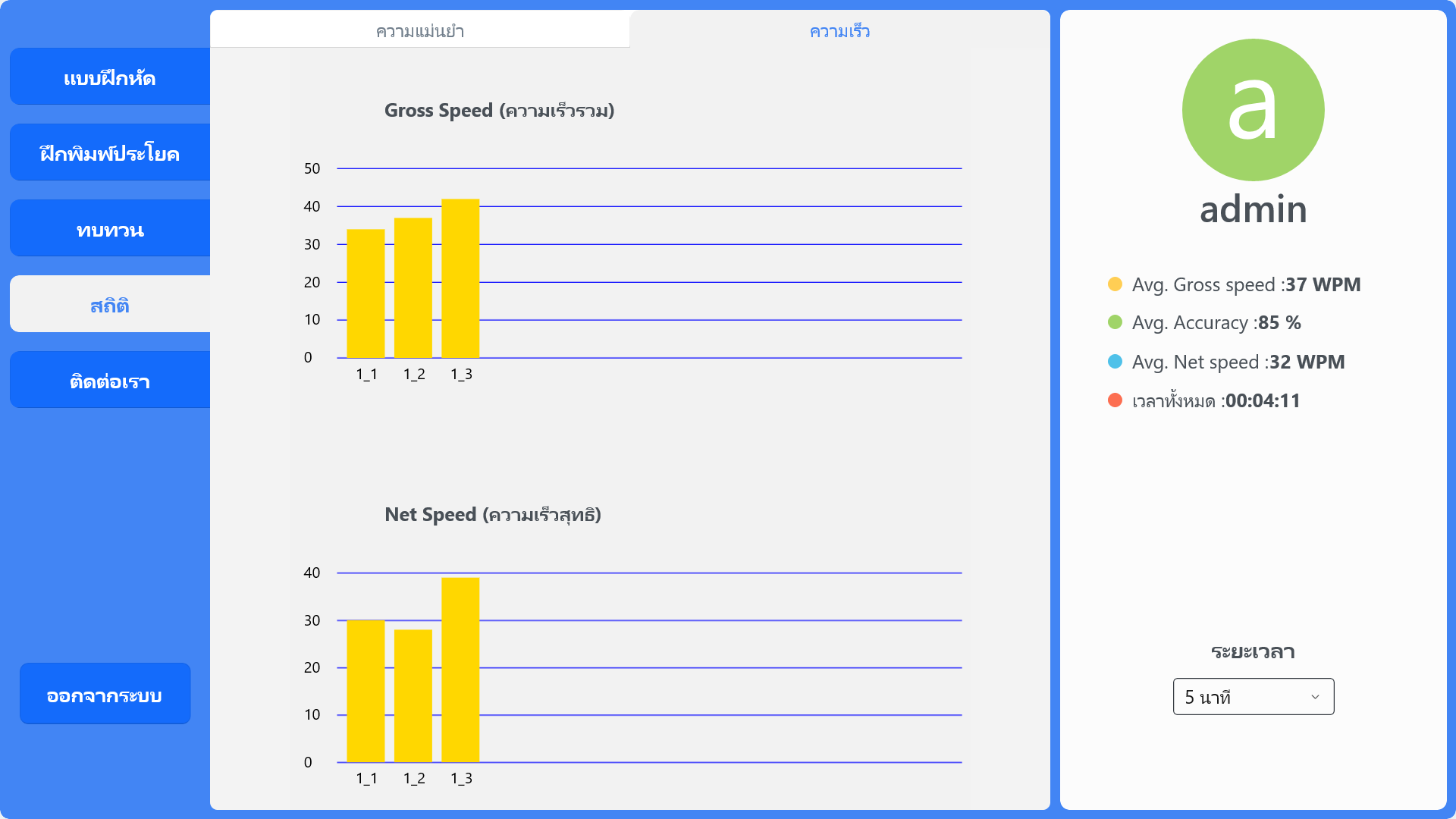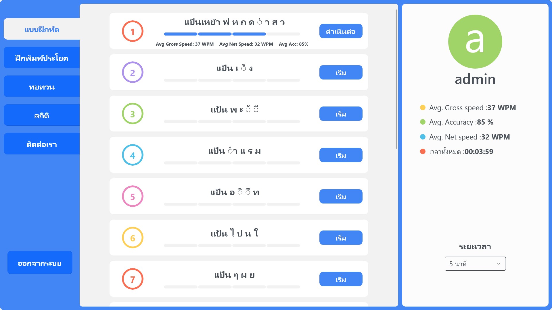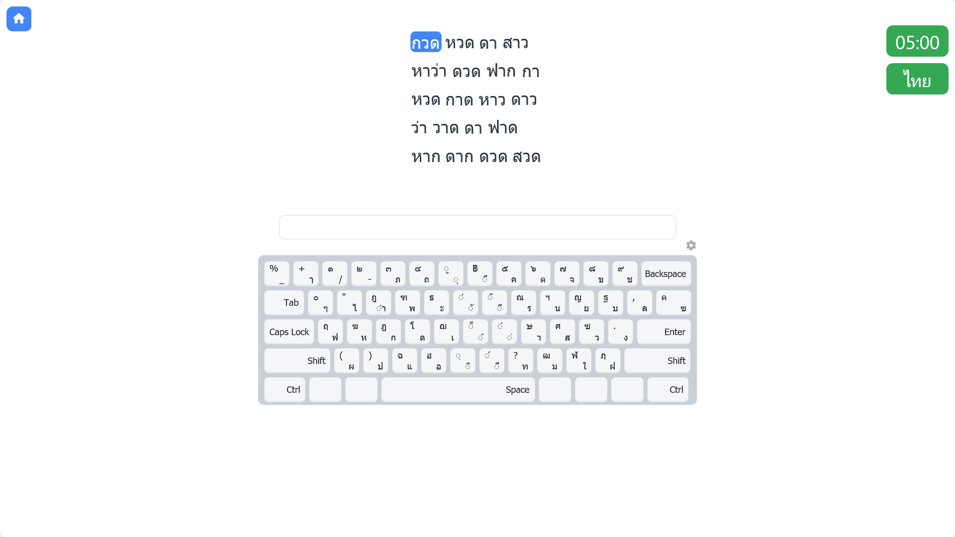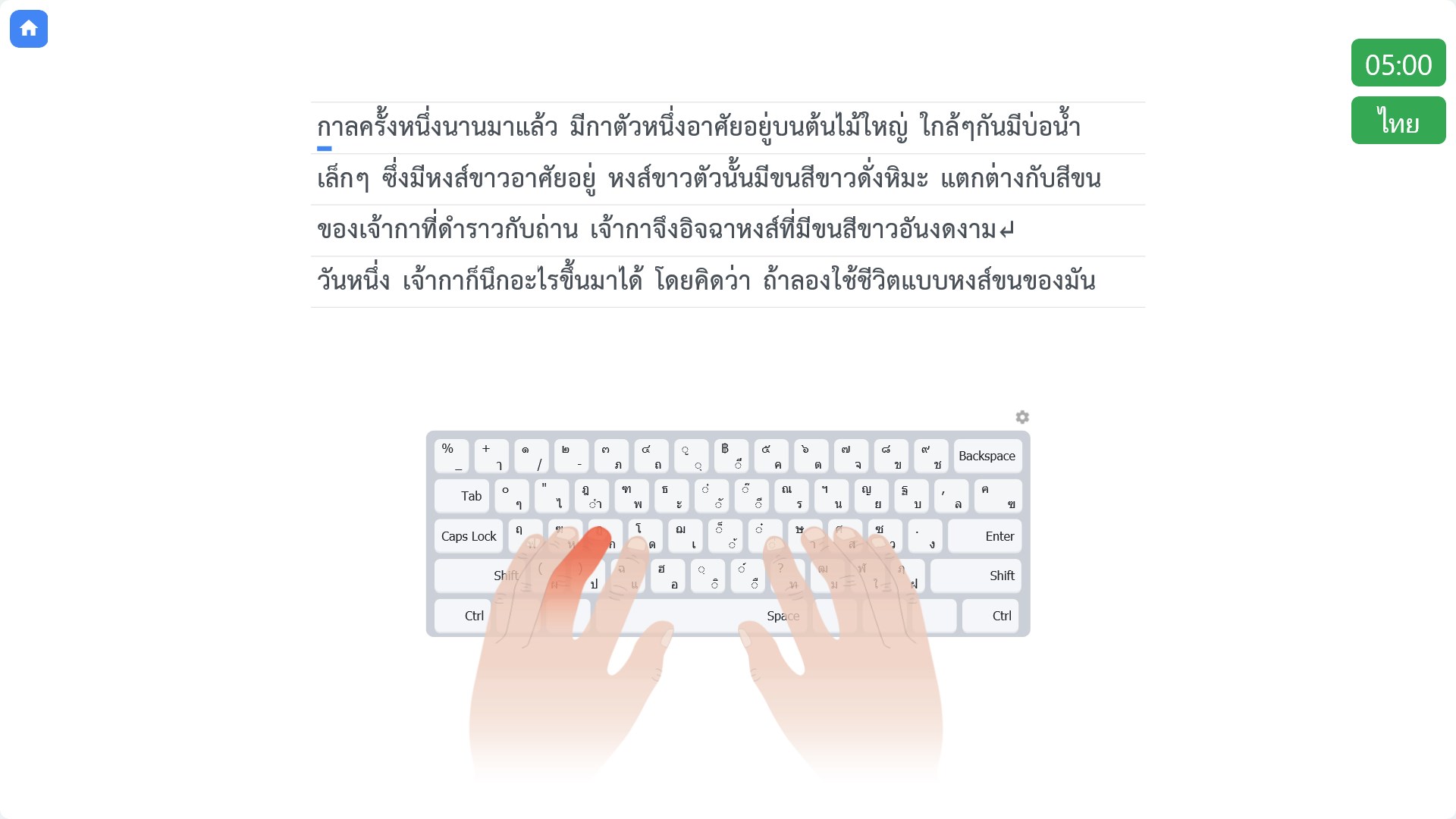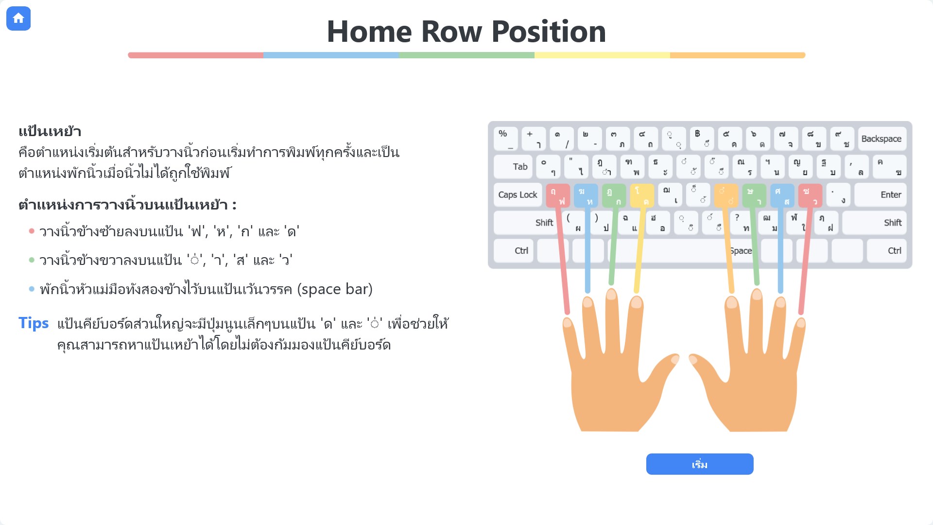 Thai Typing Practice คือแอปพลิเคชันสําหรับฝึกพิมพ์สัมผัสภาษาไทยซึ่งจะช่วยฝึกให้คุณสามารถพิมพ์ดีดได้เร็วขึ้นและมีประสิทธิภาพมากขึ้น โดยที่ไม่ต้องมองแป้นพิมพ์คีย์บอร์ดตลอดเวลา. แอปพลิเคชันฝึกพิมพ์สัมผัสนี้ประกอบไปด้วย 15 แบบฝึกหัด โดยแต่ละแบบฝึกหัดจะใช้ระยะเวลาเพียง 20 - 40 นาทีเท่านั้นจึงเหมาะสมกับทุกเพศทุกวัยตั้งแต่ผู้เริ่มต้นใหม่ไปจนถึงผู้ชํานาญแล้วที่ต้องการทดสอบการพิมพ์ดีด.
