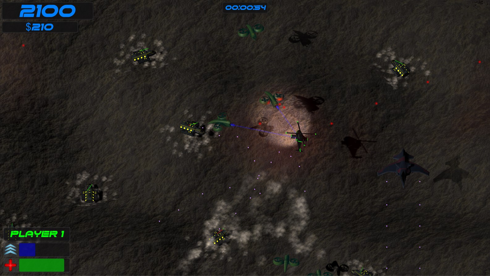 Heli Swarm is an infinite arcade shooter game set in the world after a massive alien invasion conquered most of the earth. You will encounter boss battles and endless swarms of land and air vehicles. Play solo or local co-op with a friend to increase your destructive power!