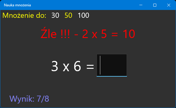 Nauka tabliczki mnożenia. Można wybrać mnożenie do 30, 50 lub 100.