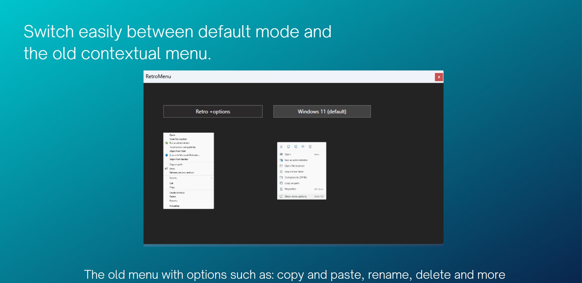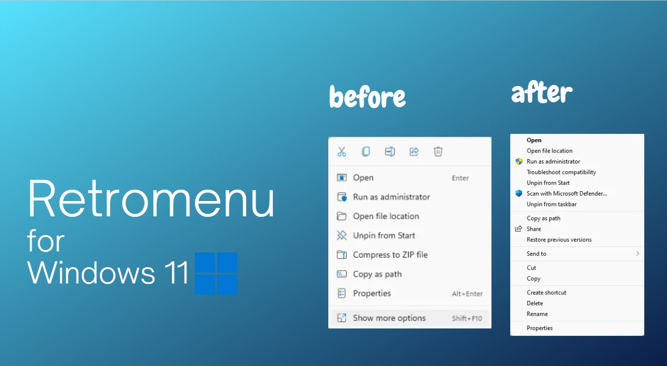 With RetroMenu, you can customize your Windows 11 contextual menu to a retro-style with options such as copy, paste, and rename, in a text format similar to the old-style menu in Windows 10. RetroMenu provides a user-friendly experience for users who are not familiar with the default Windows 11 menu, enabling quick access to favorite tools and options. Enhance your contextual menu experience with RetroMenu now!