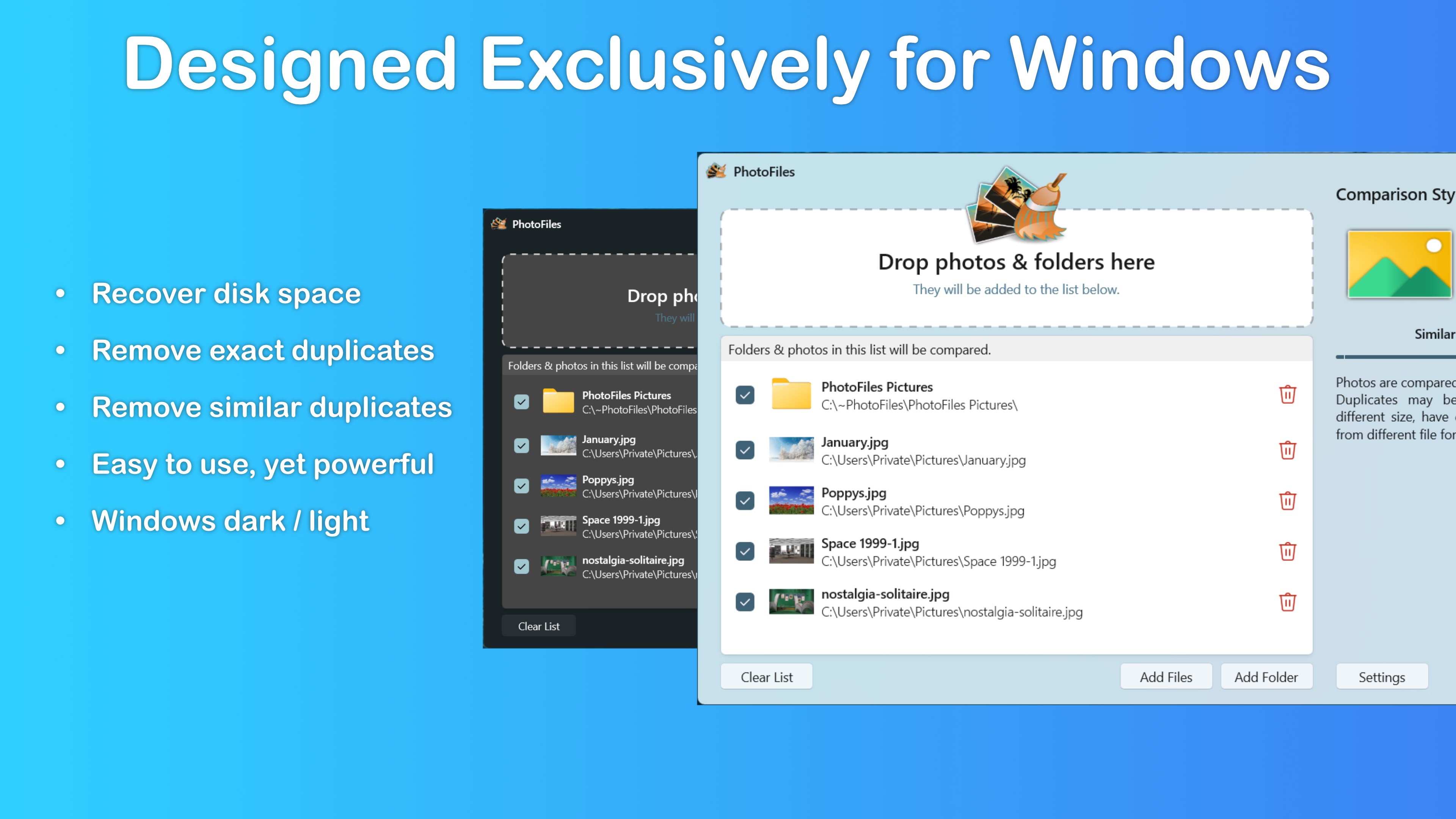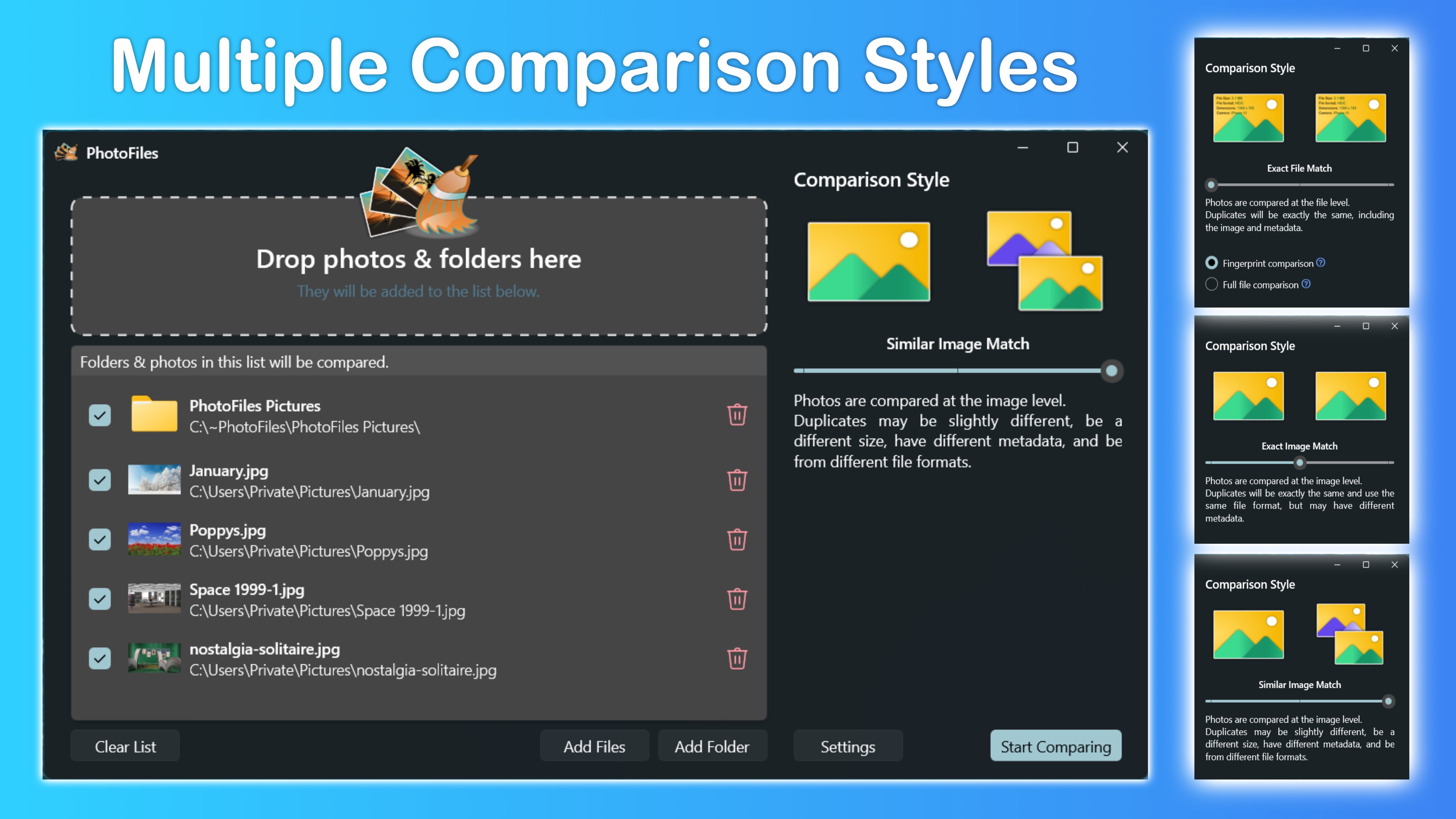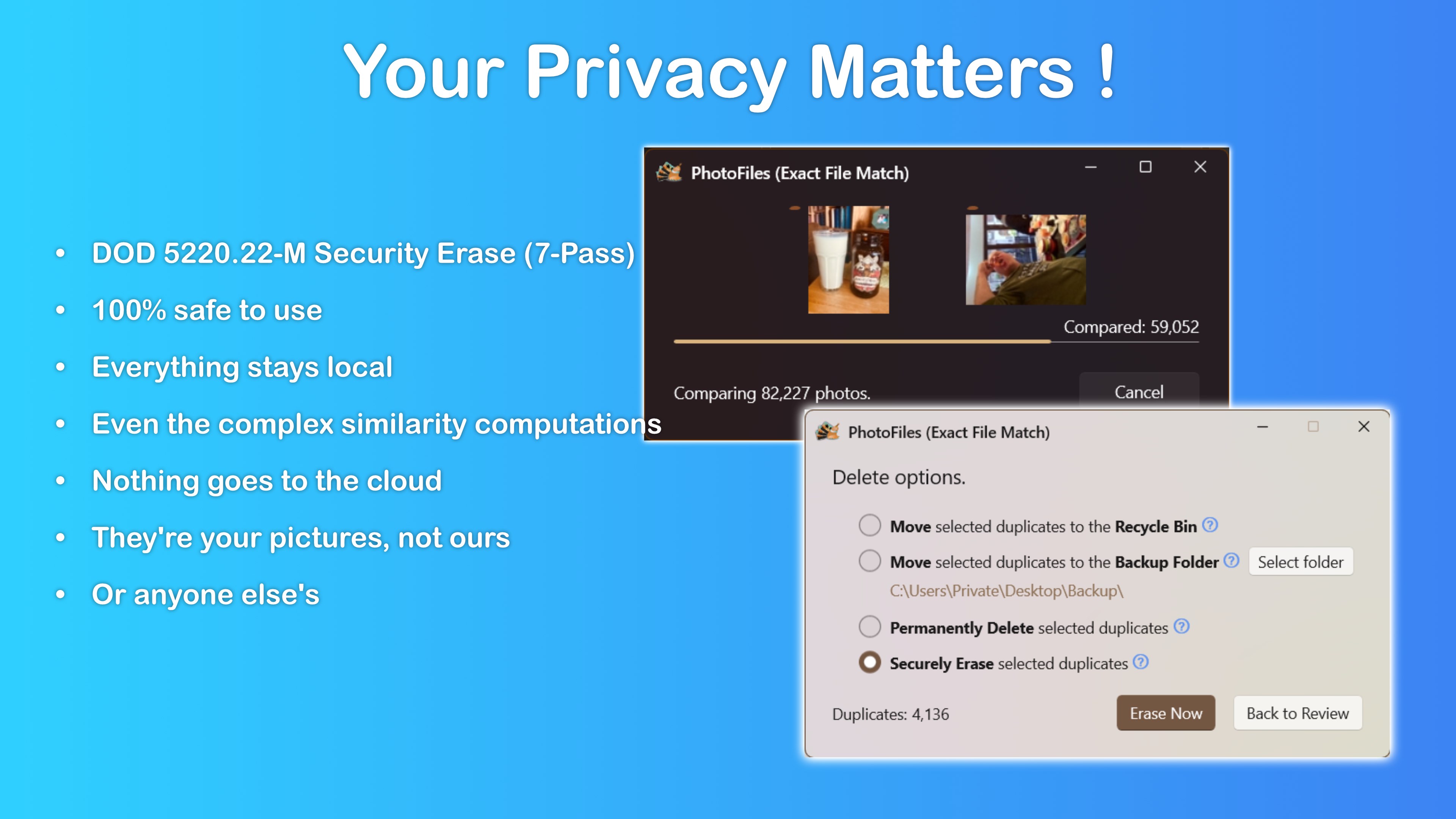 • Super-fast duplicate file comparer - 100,000+ in seconds• Auto-select uses a rule based decision Engine to select the duplicates for you• You select the folders, drives, NAS, USB, or entire machines to scan• Support for HEIC, HEIF, JPG, JPEG, BMP, TIFF, TIF, GIF, AVIF, WEBP, PNG, DNG, and AI• Duplicates are sent to your recycle bin, so they\'re not lost until you empty it