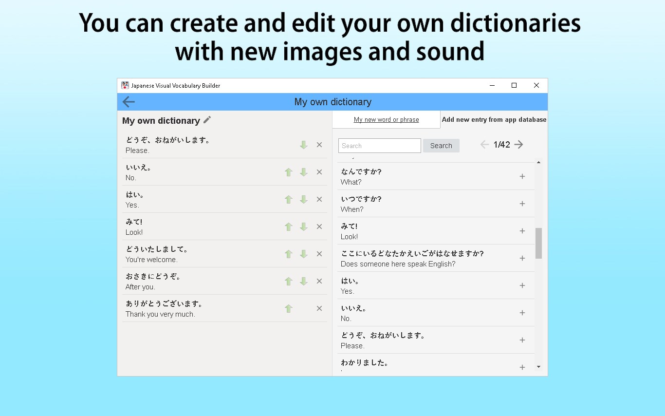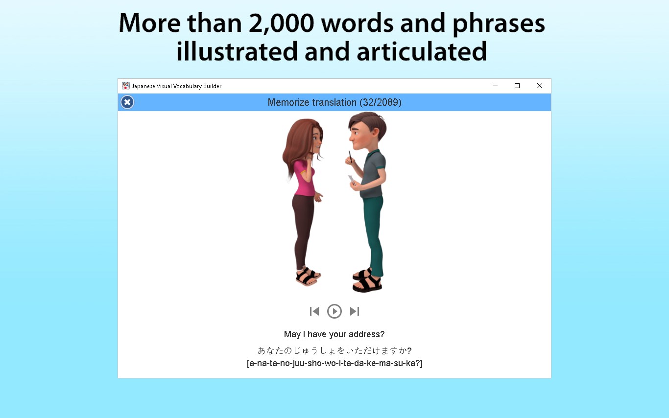Thanks to our unique learning method, you will soon achieve great results on the path to mastering Japanese. Vocabulary Builder is ideal for anyone wishing to learn some words and phrases for use on holiday, as well as those looking to brush up their language skills.
