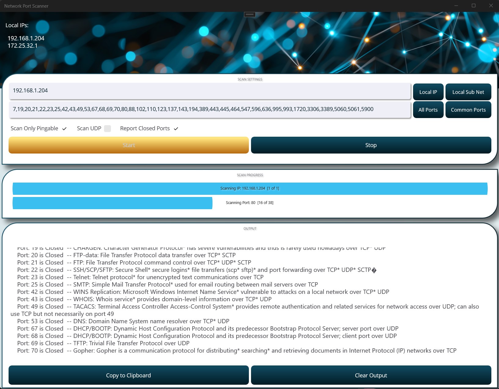 This security tool will allow system administrators to easily scan their network for open ports and vulnerable IPs. It allows preset port scanning or custom ports or a range.